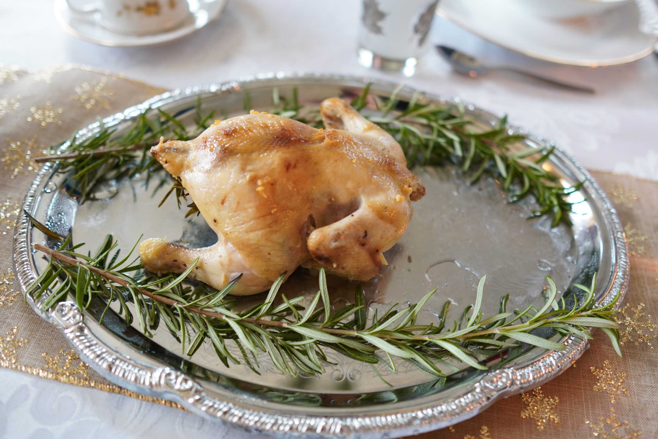 - Dickensian Main (Great Expectations): Roasted stuffed fowl (Cornish hens with rosemary)