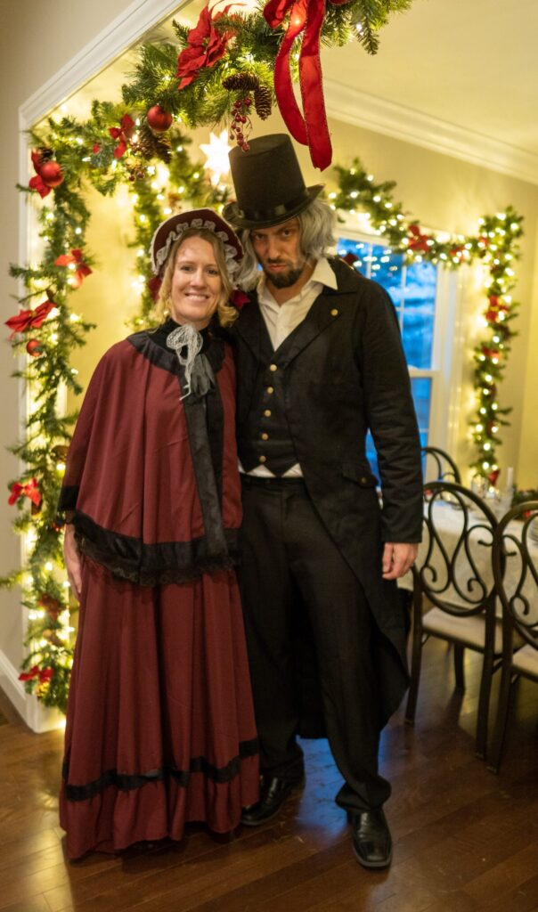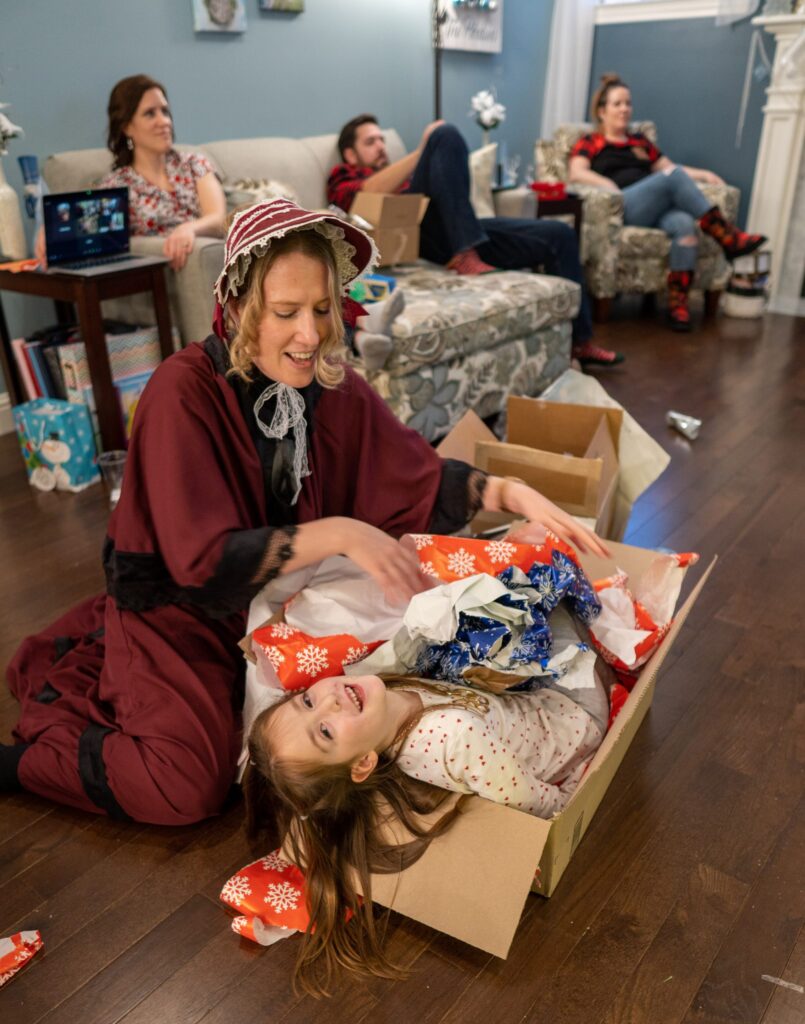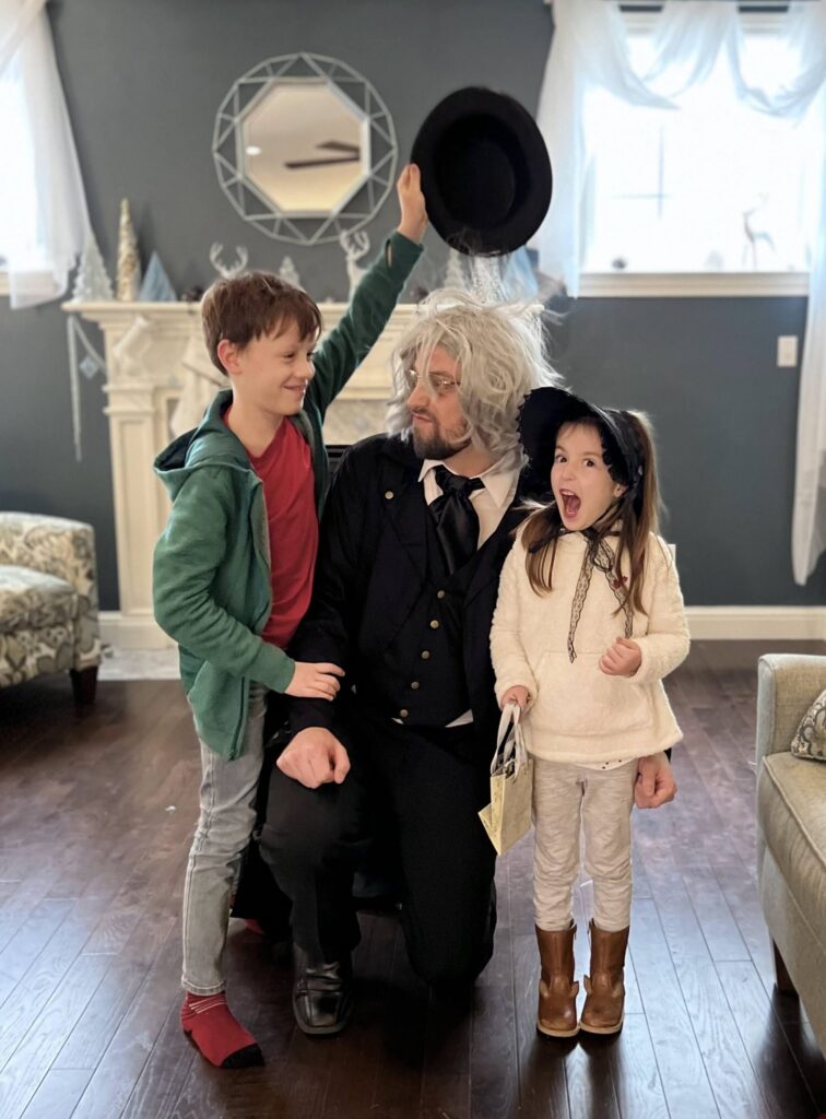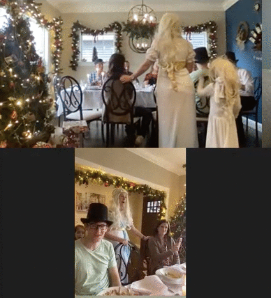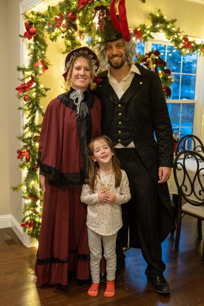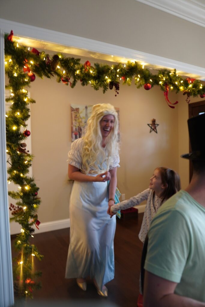 The Ghost of Christmas Past, adorned in a flowing white dress, also visited to reminisce nostalgic family memories by playing “Yes and No” from “A Christmas Carol.” We guessed funny family memories like Tim drilling a hole in the floor to spy on the family and the family riding in the back of the truck. Layla also joined in the fun of dressing up 🙂