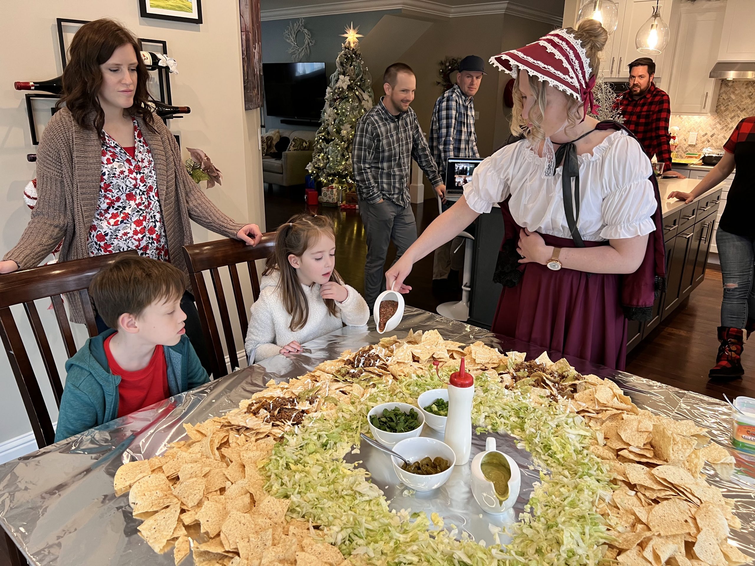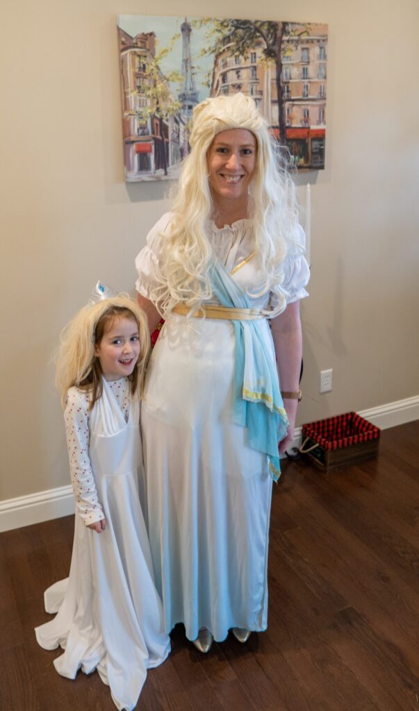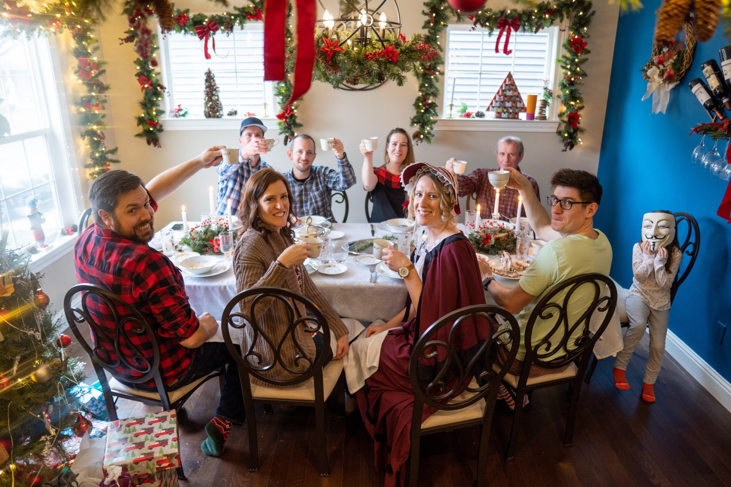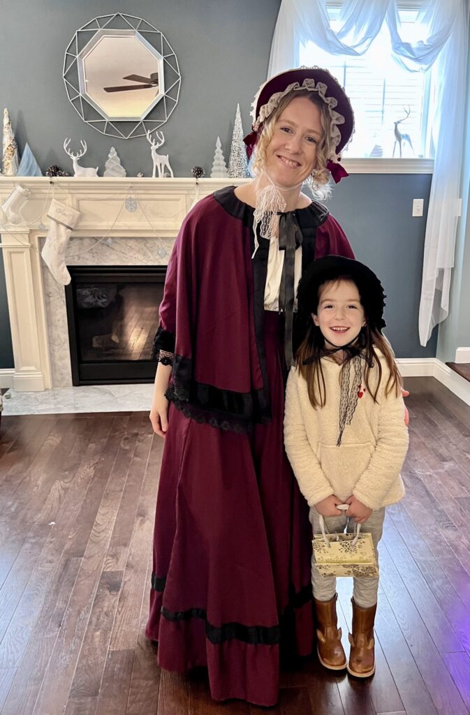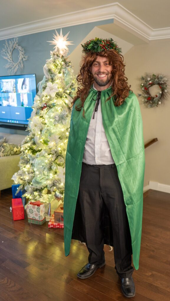 The Ghost of Christmas Past, adorned in a flowing white dress, also visited to reminisce nostalgic family memories by playing “Yes and No” from “A Christmas Carol.” We guessed funny family memories like Tim drilling a hole in the floor to spy on the family and the family riding in the back of the truck. Layla also joined in the fun of dressing up 🙂