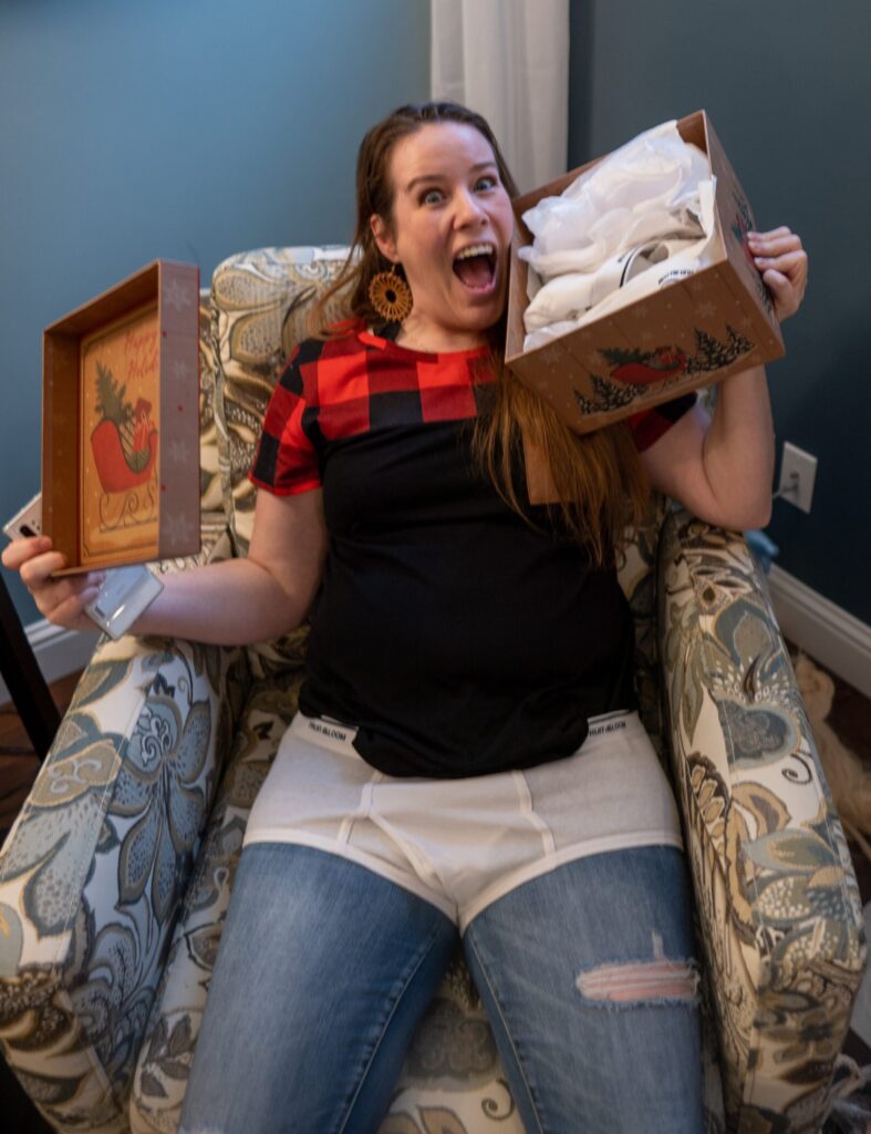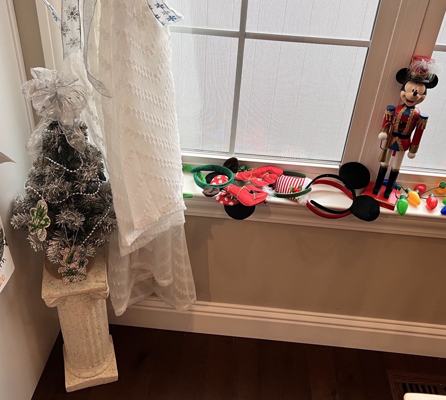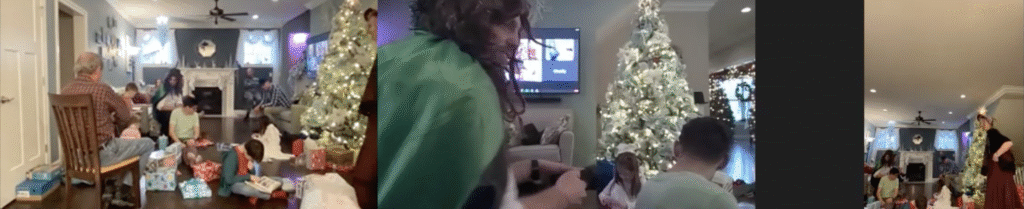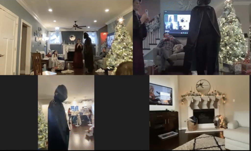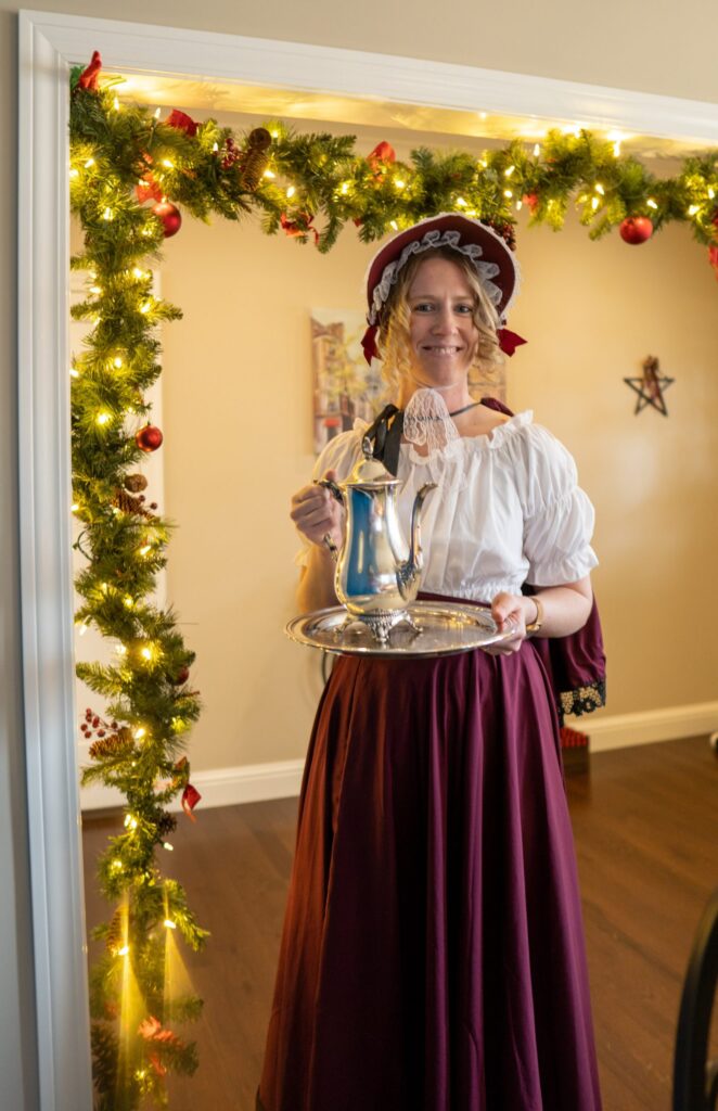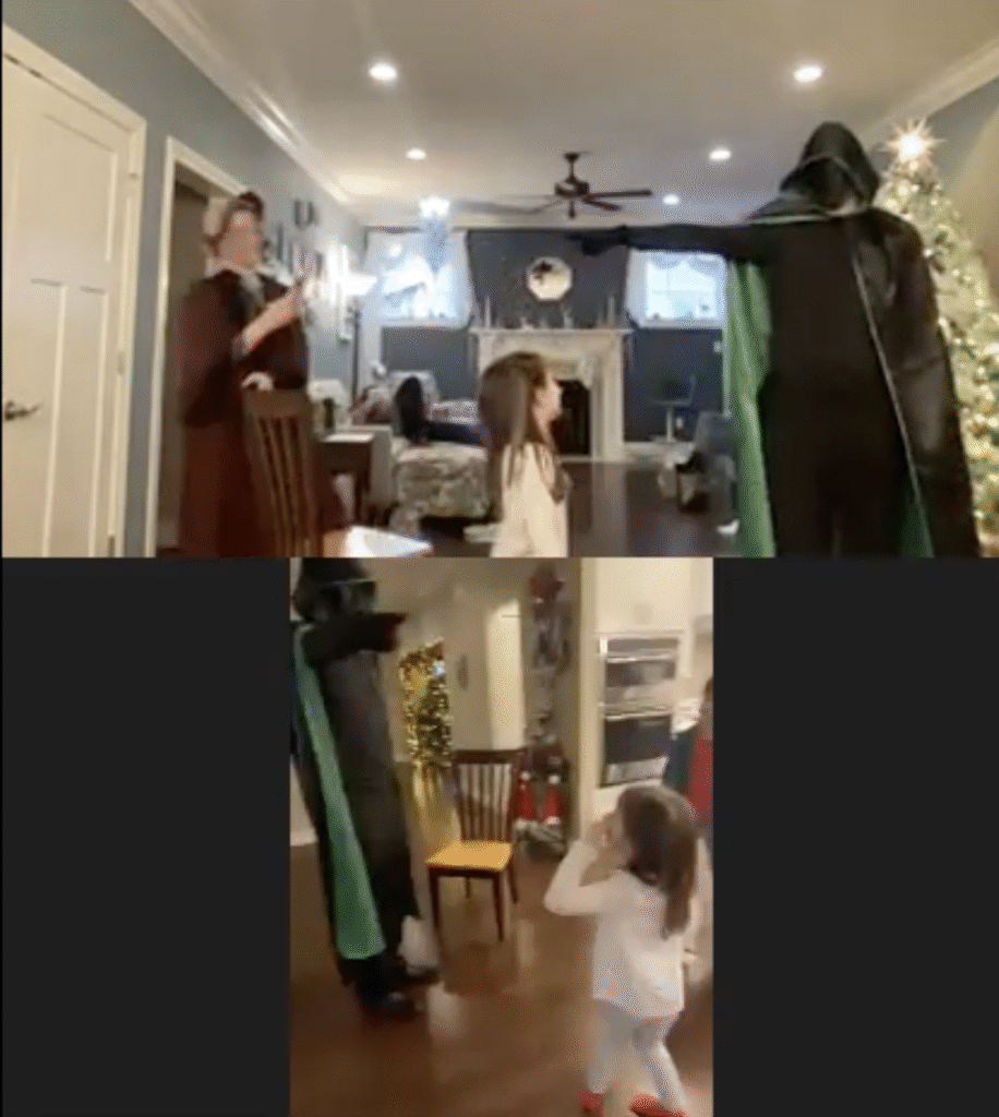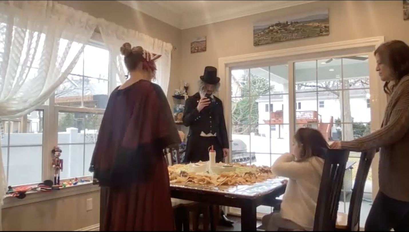 The Ghost of Christmas Past, adorned in a flowing white dress, also visited to reminisce nostalgic family memories by playing “Yes and No” from “A Christmas Carol.” We guessed funny family memories like Tim drilling a hole in the floor to spy on the family and the family riding in the back of the truck. Layla also joined in the fun of dressing up 🙂