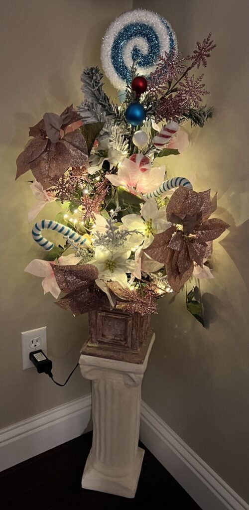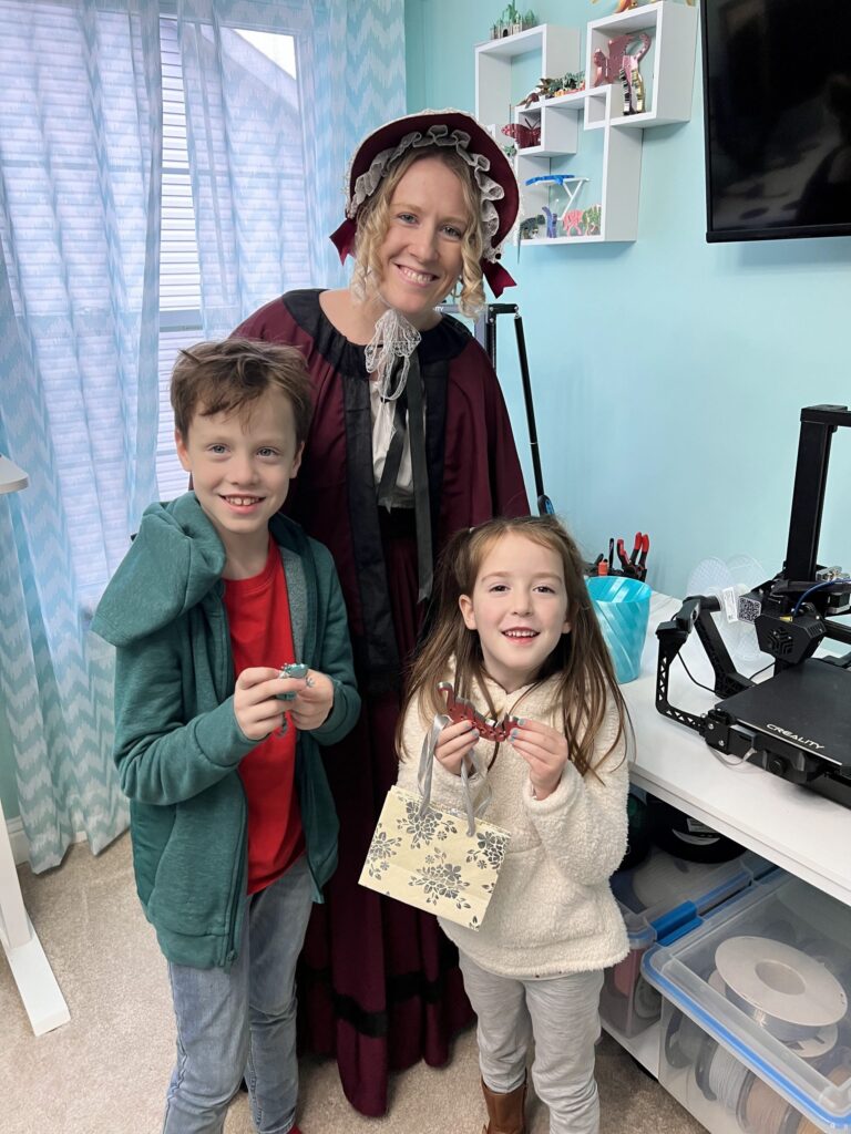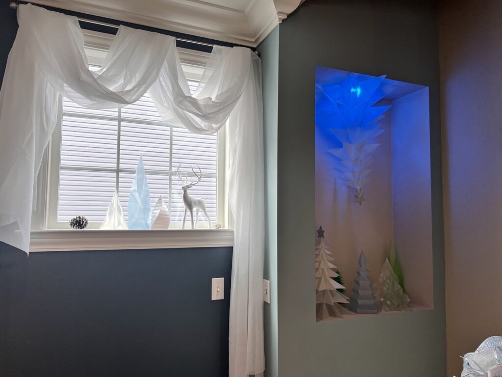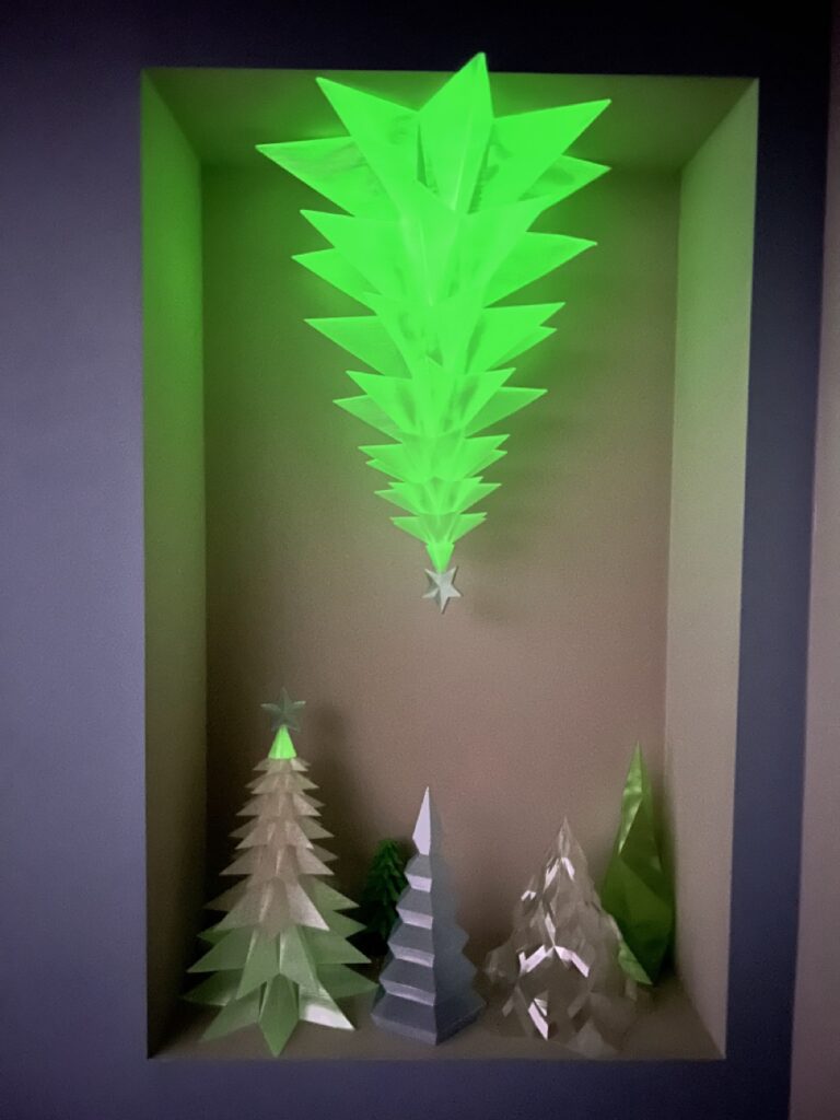 For the ‘Future’ section of our theme, we decked out the mantle and cubby with futuristic flair and 3D printed magic. Everything from trees and deer to ornaments, cat stockings, and even a nutcracker was printed in sleek, modern designs. The centerpiece? A fully 3D printed tree made of translucent, sparkly blue PLA—suspended from the ceiling like it was defying gravity. In the cubby, a glow-in-the-dark tree changed colors with the light, adding a touch of techy enchantment. We even incorporated red into the color scheme as a playful nod to a potential Christmas… on Mars.