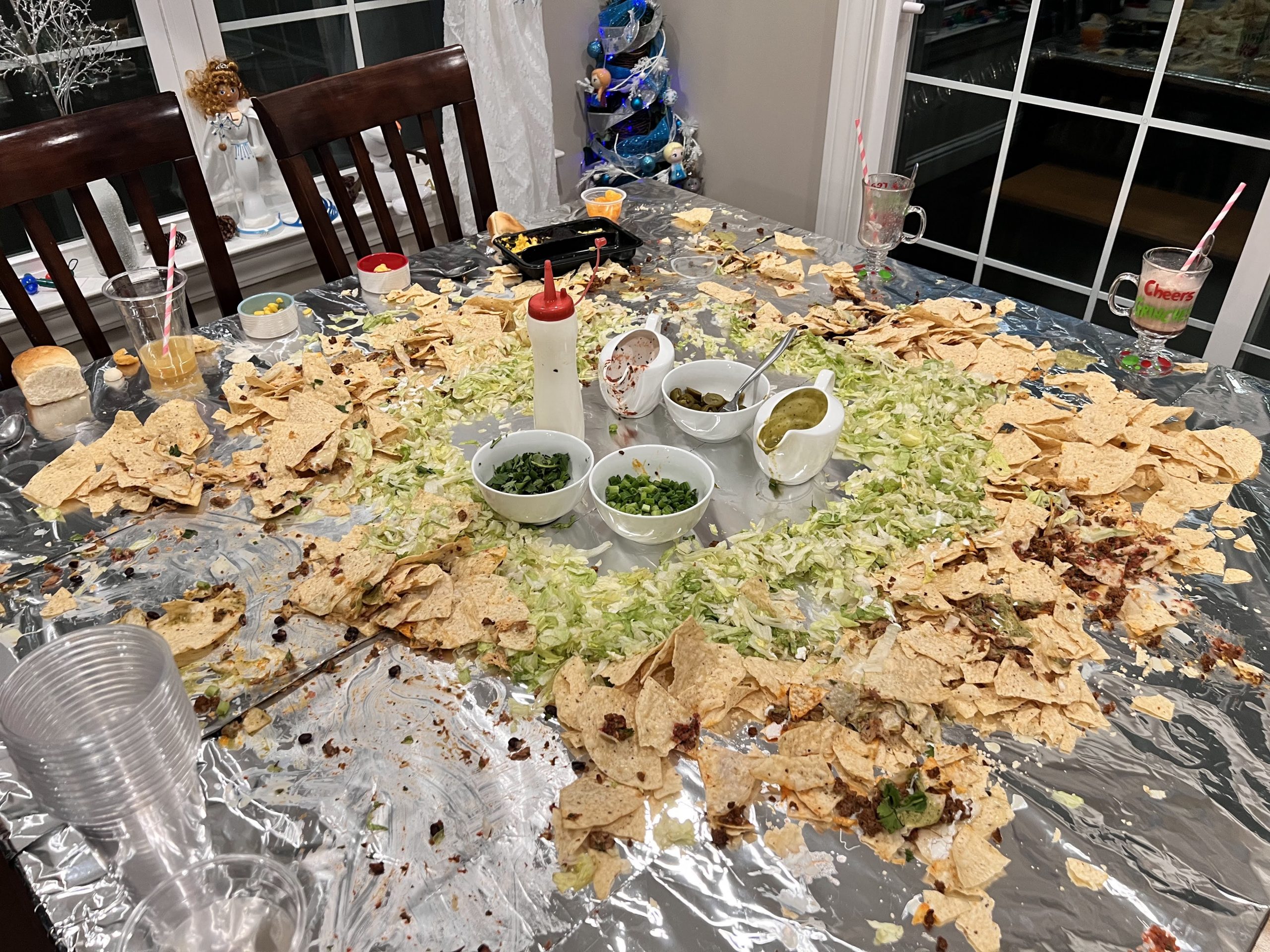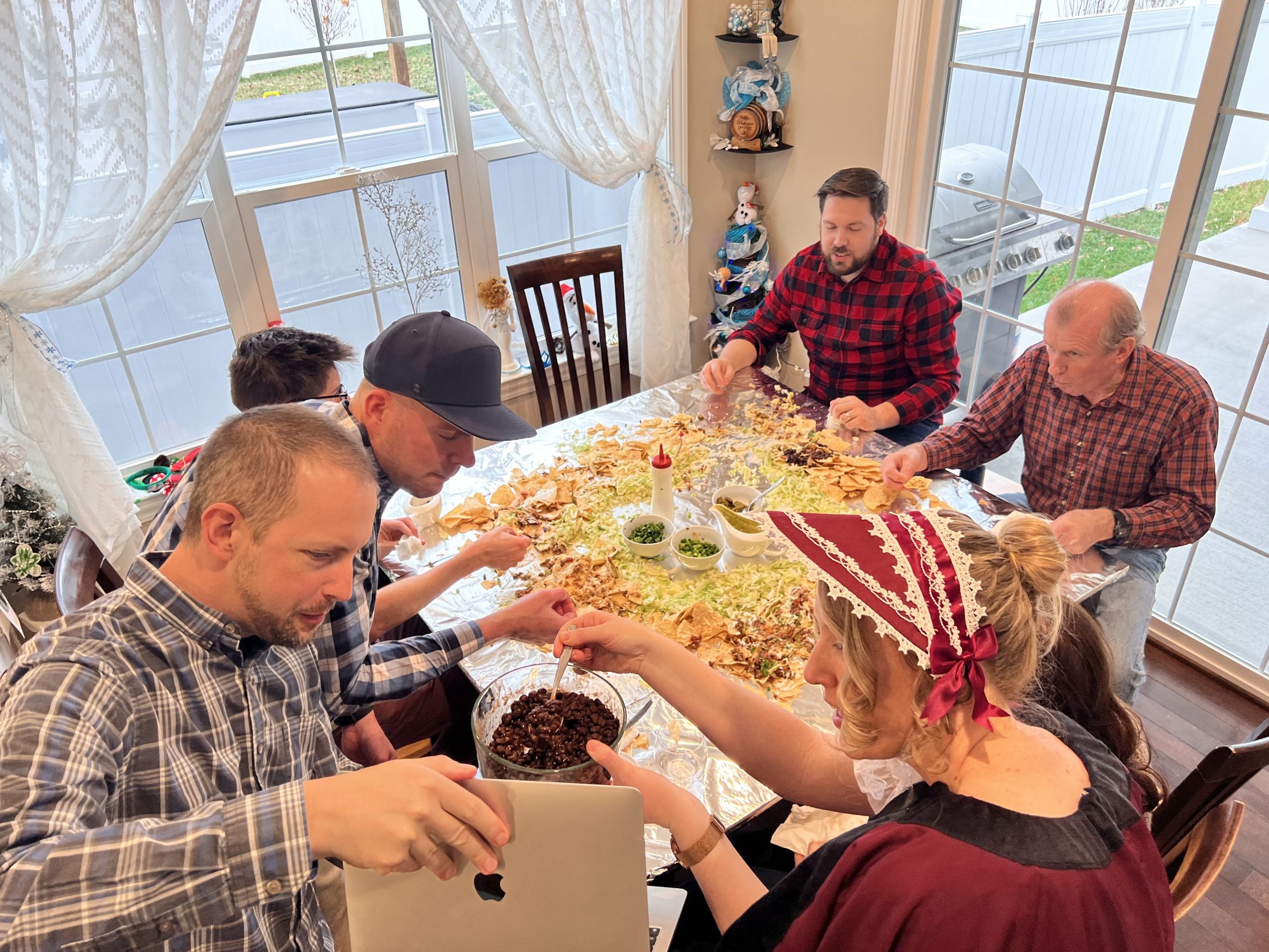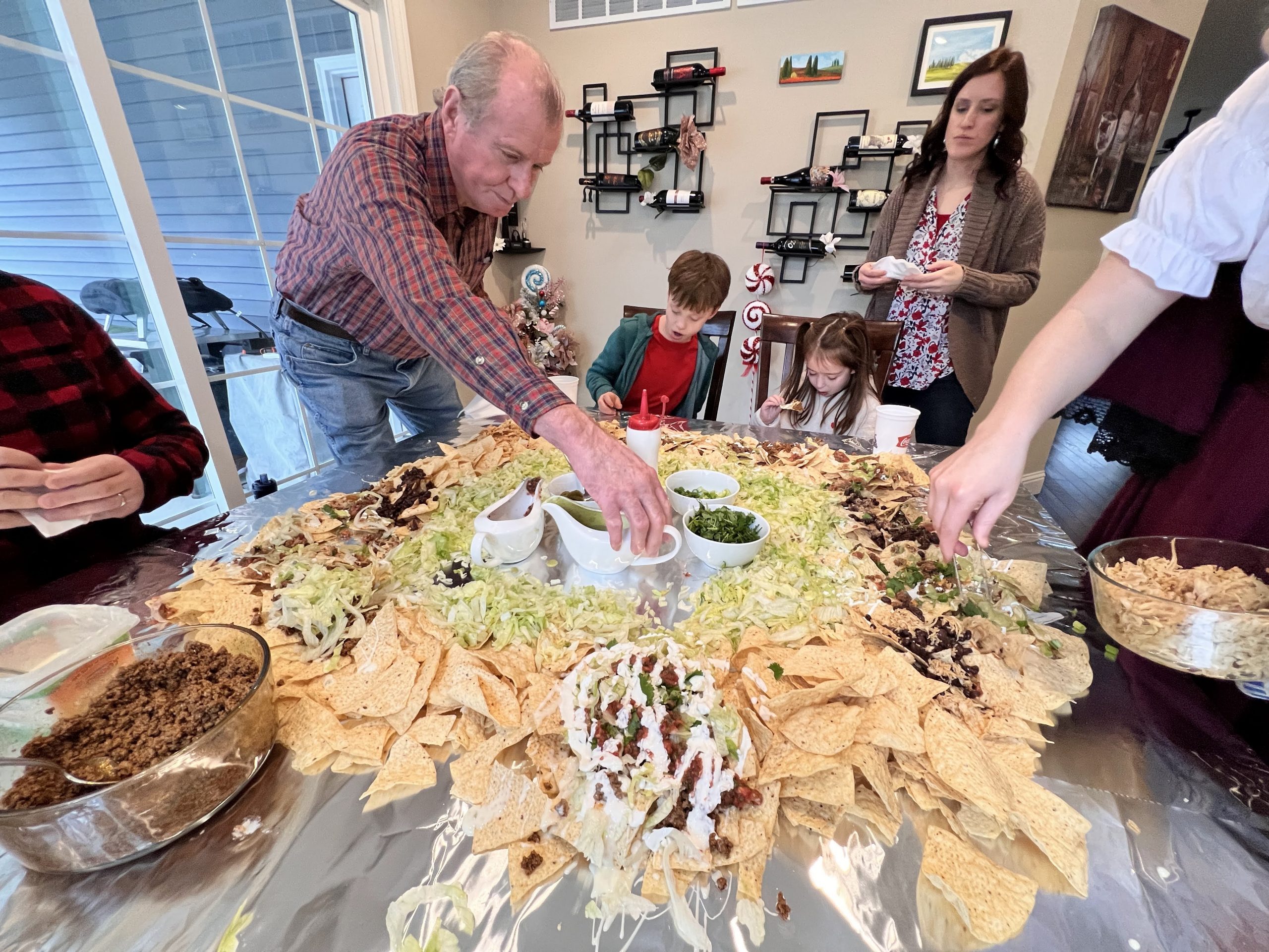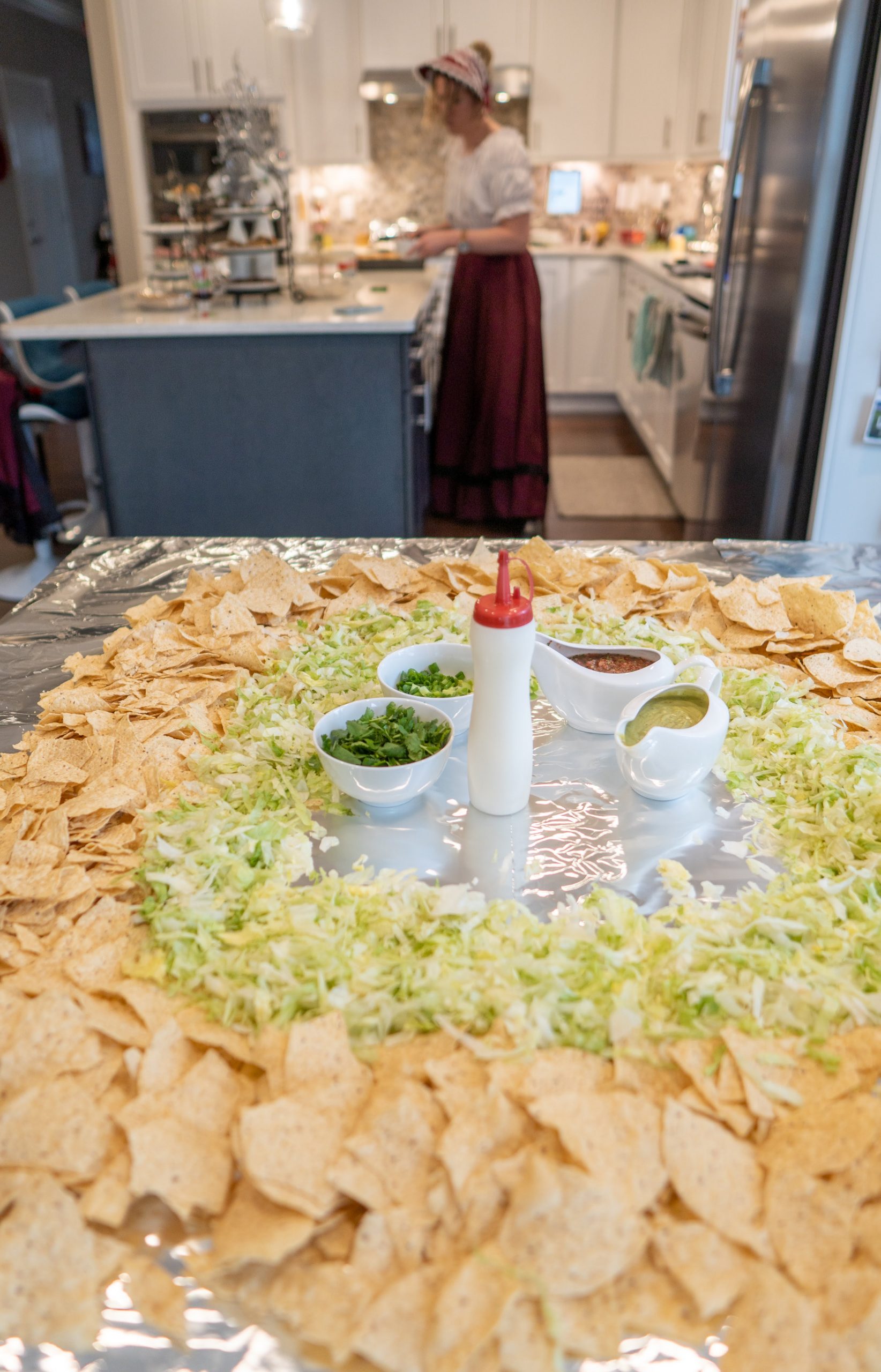 The “present” food served was inspired by current TikTok trends. The table nachos, as an appetizer, were a big hit! We included all the fixings including beans, smoked shredded chicken, smoked pulled pork, beef, queso, homemade salsa, sour cream, avocado sauce, cilantro, lettuce, green onions, and jalapeños.