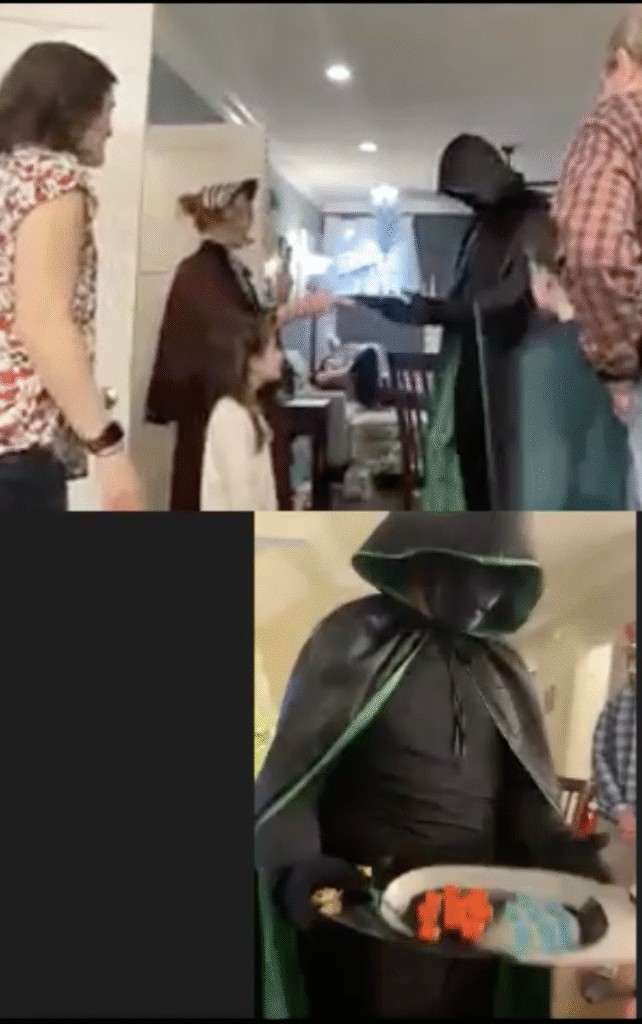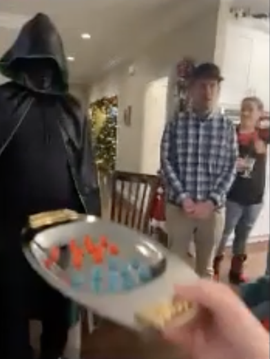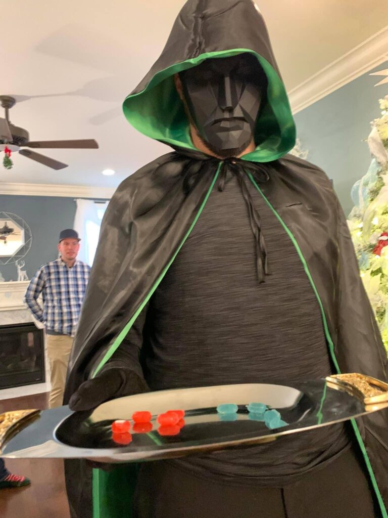 The Ghost of Christmas Yet to Come made a dramatic entrance cloaked in a black cape and a Squid Game Front Man mask, arriving just in time to serve the final course: red or blue “pills” inspired by The Matrix. Each guest had to choose their fate. The pill color determined not only the ornament they received, but also the number attached to it—which set the order for the white elephant gift exchange. Red pills symbolized curiosity and a desire to dig deeper, rewarding guests with higher pick numbers. Blue pills, representing contentment and acceptance, came with lower numbers—perfect for those at peace with the unknown.