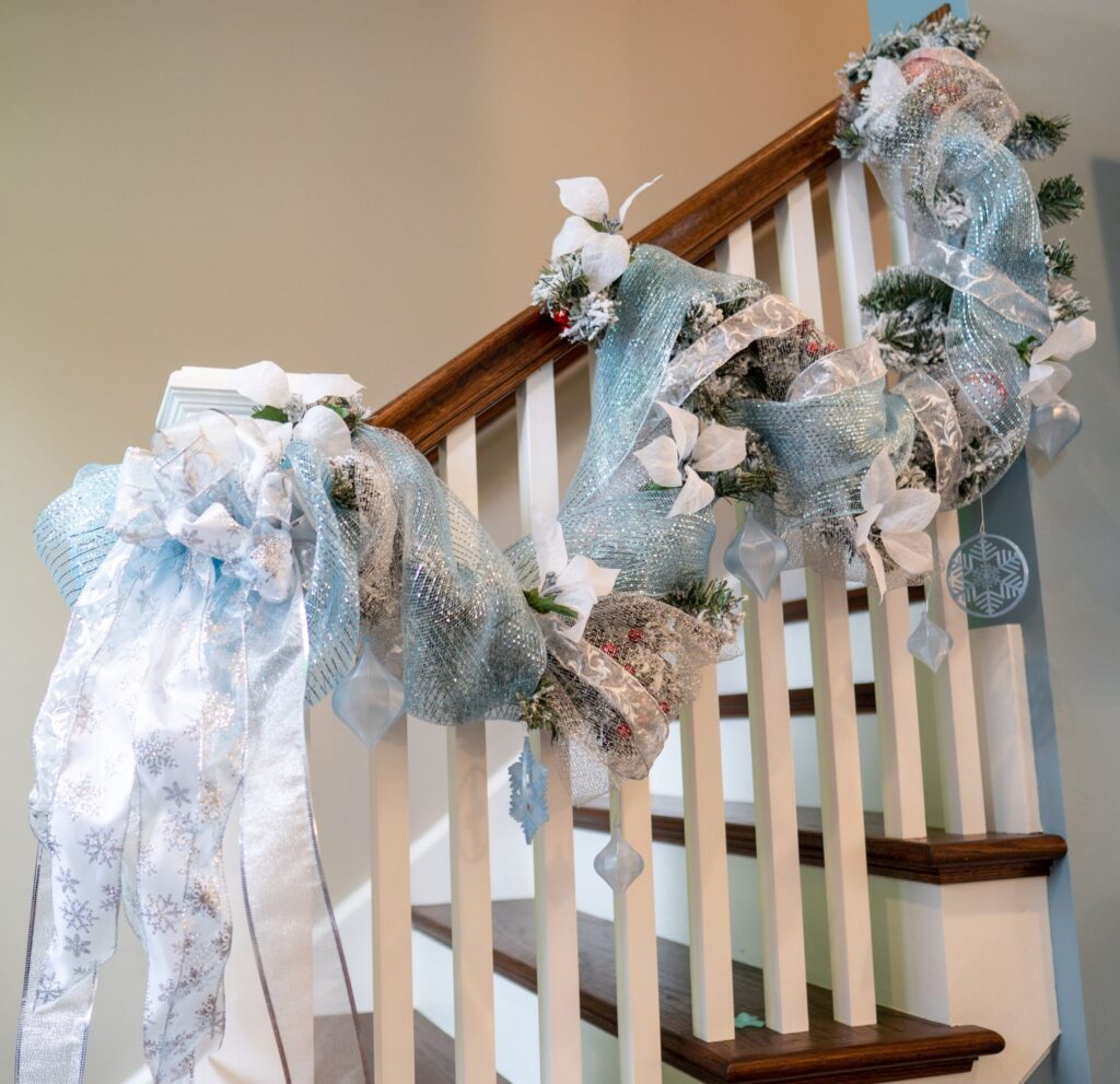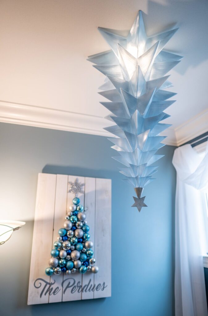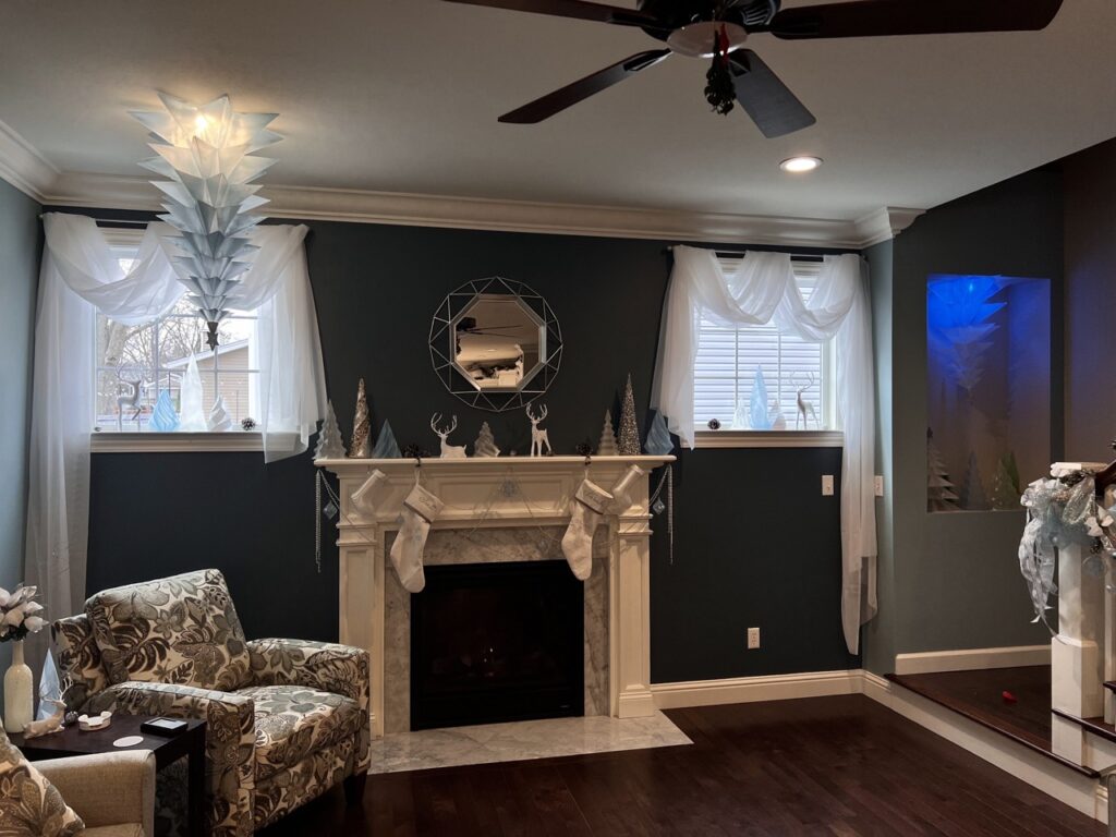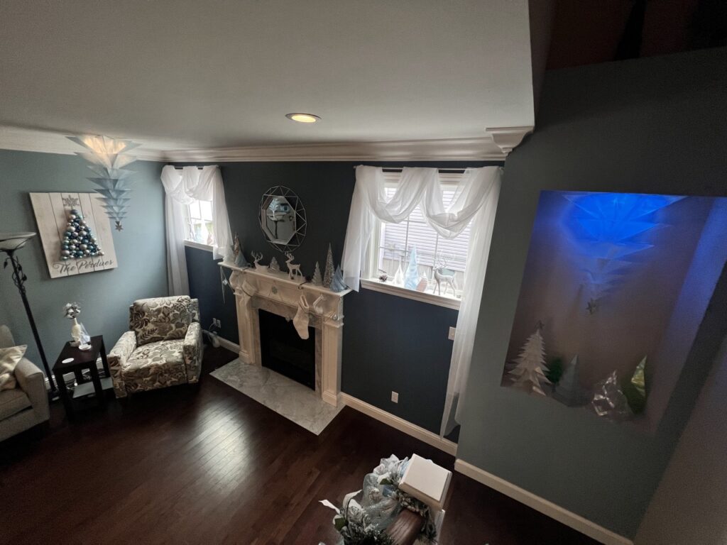 We styled the kitchen, breakfast room, and central area of the great room with on-trend flocked greenery for a fresh and festive feel. The “Present” tree—a soft, flocked beauty in light blue—stood as the centerpiece, surrounded by matching garland and modern touches. To complete the look, we added 3D printed translucent ornaments that caught the light beautifully, blending tradition with a sleek, contemporary twist.