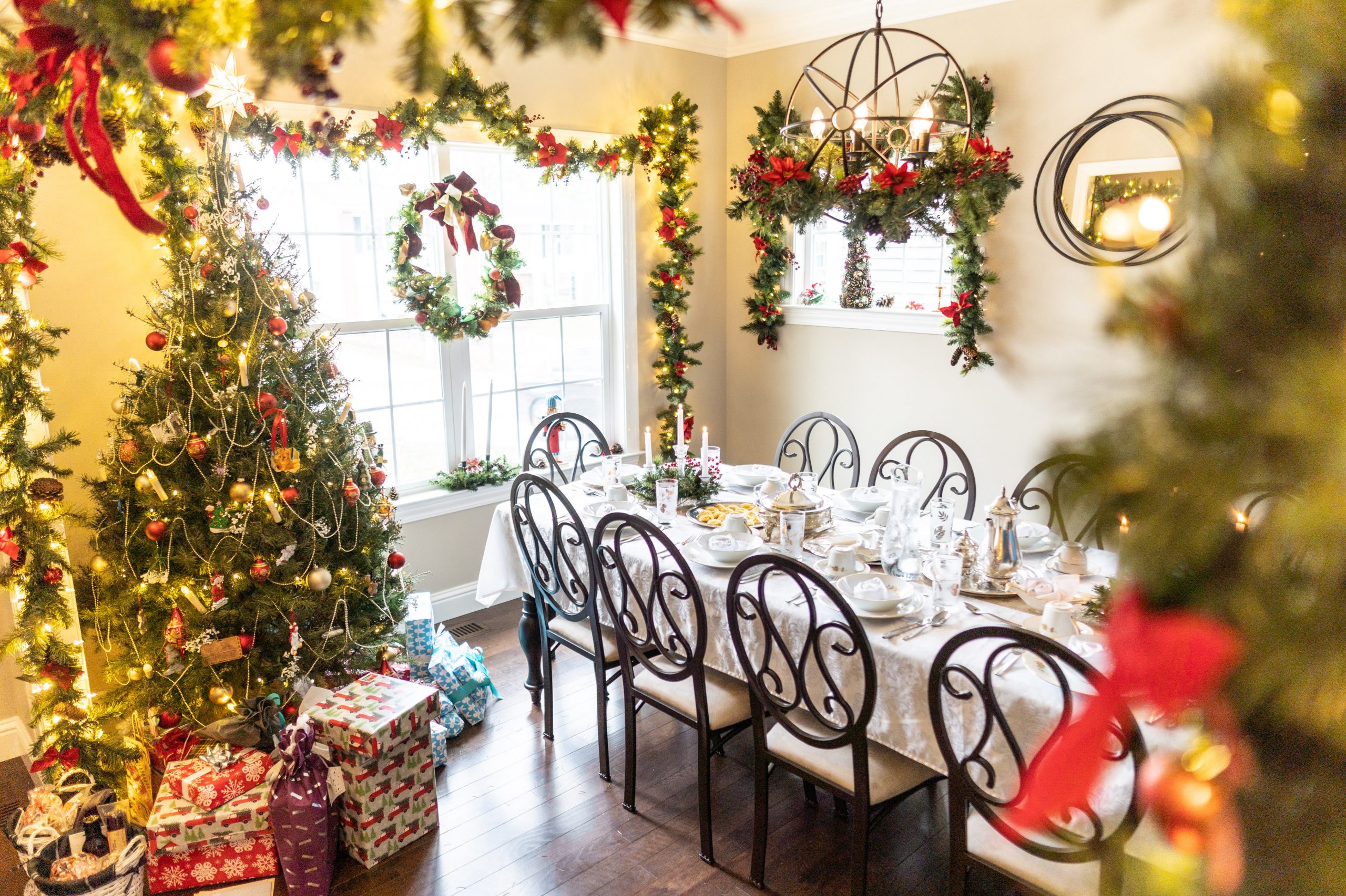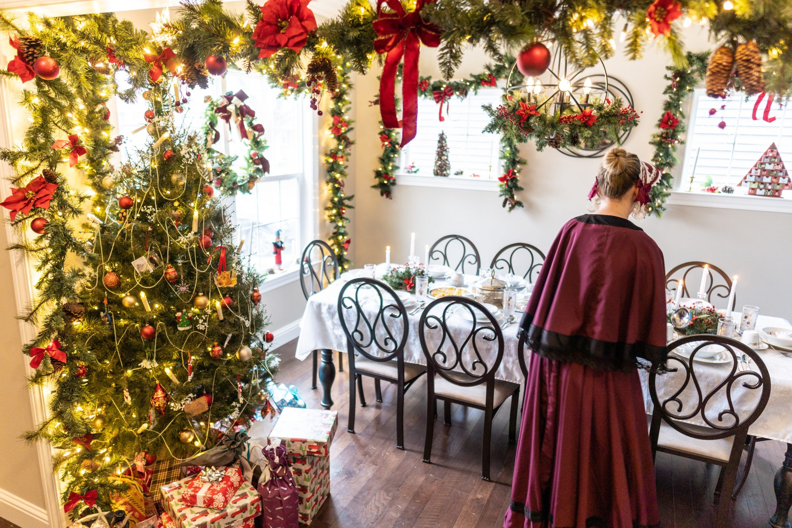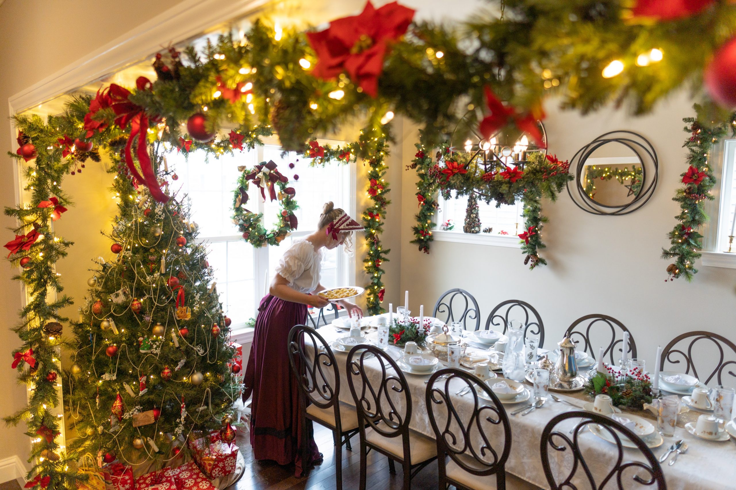 We transformed the dining room into a Victorian and Dickensian dream. The ‘Past’ tree was a real showstopper—a live tree adorned with heirloom ornaments, soft-glowing LED candles, and draped in pearl and gold bead garlands for that timeless elegance. Garland framed the entryway and windows, richly decorated with crimson poinsettias, ribbon, and sparkling ornaments. Pine wreaths hung from the chandelier and along the table, while tall taper candles cast a warm, nostalgic glow throughout the room.