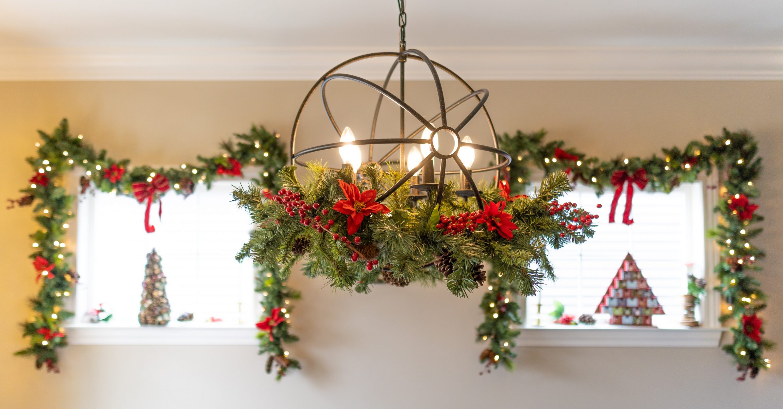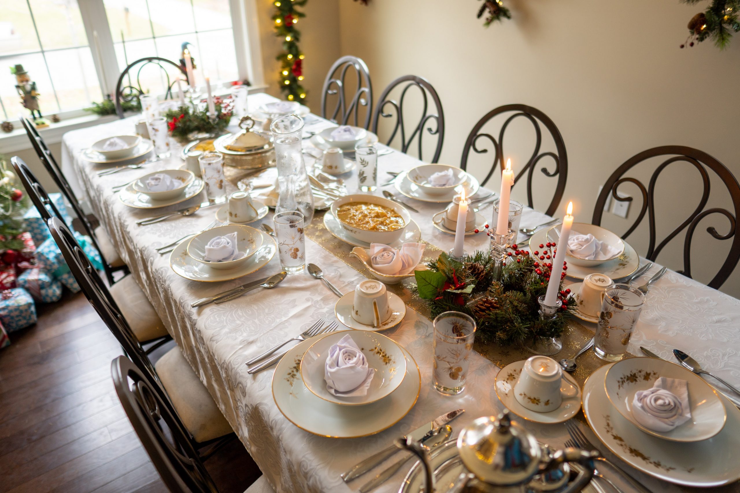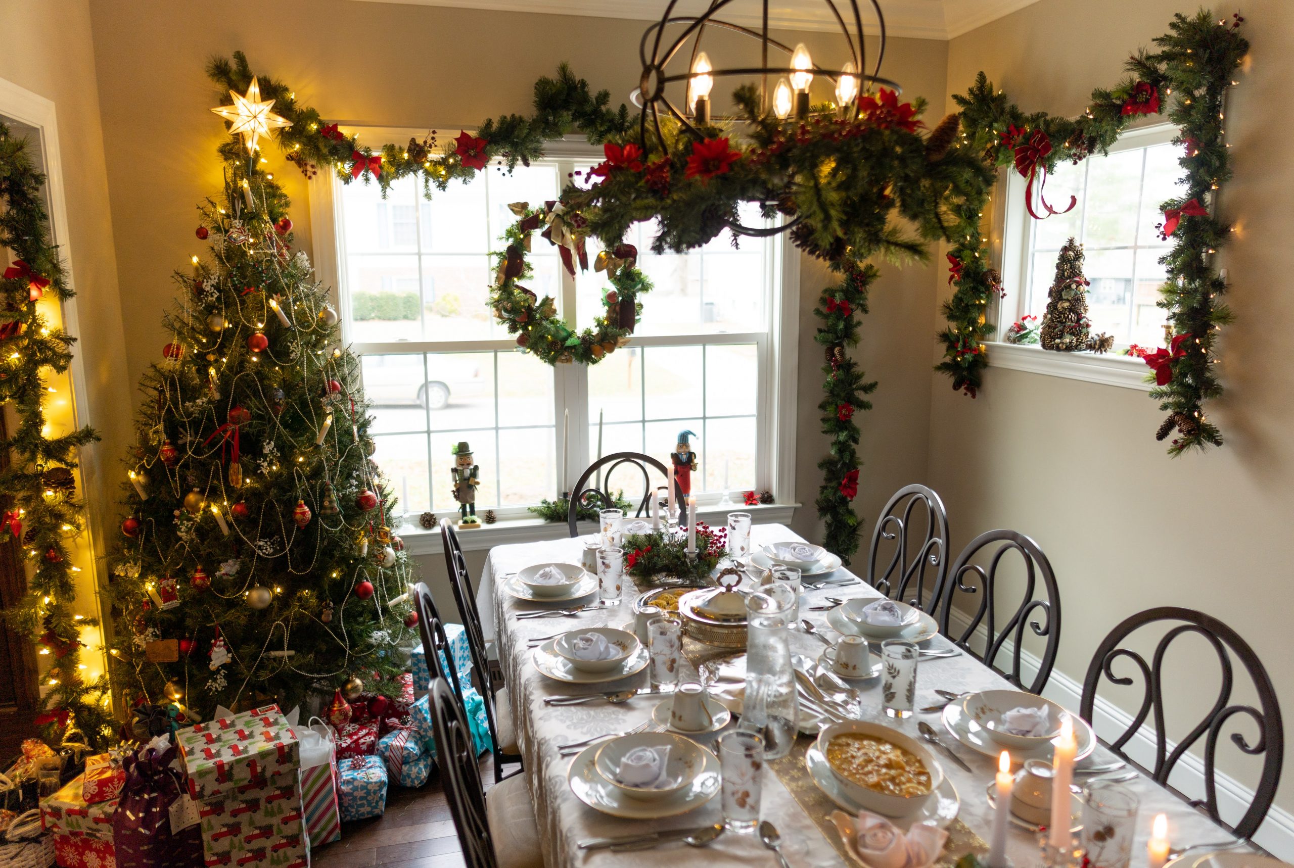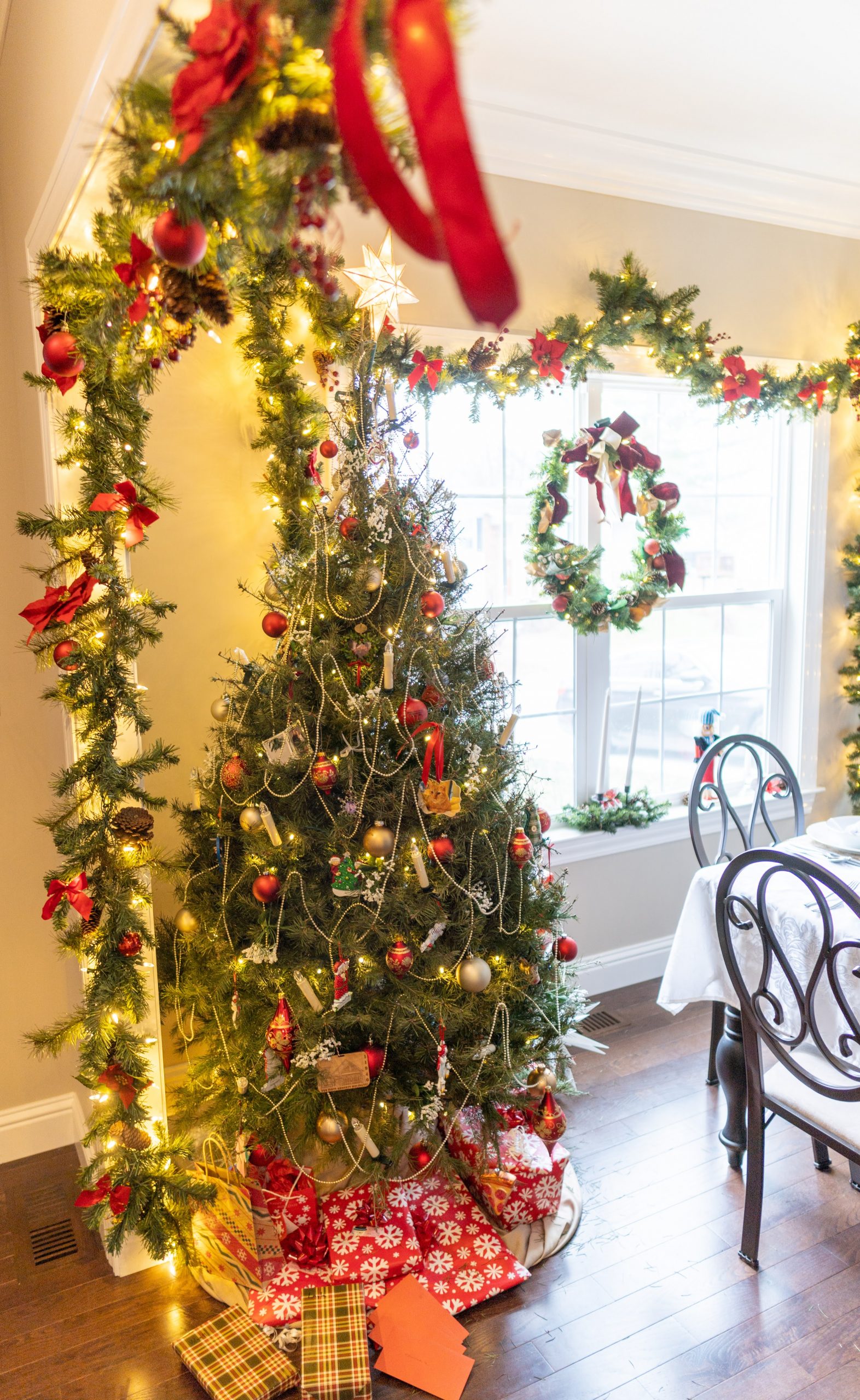 We transformed the dining room into a Victorian and Dickensian dream. The ‘Past’ tree was a real showstopper—a live tree adorned with heirloom ornaments, soft-glowing LED candles, and draped in pearl and gold bead garlands for that timeless elegance. Garland framed the entryway and windows, richly decorated with crimson poinsettias, ribbon, and sparkling ornaments. Pine wreaths hung from the chandelier and along the table, while tall taper candles cast a warm, nostalgic glow throughout the room.
