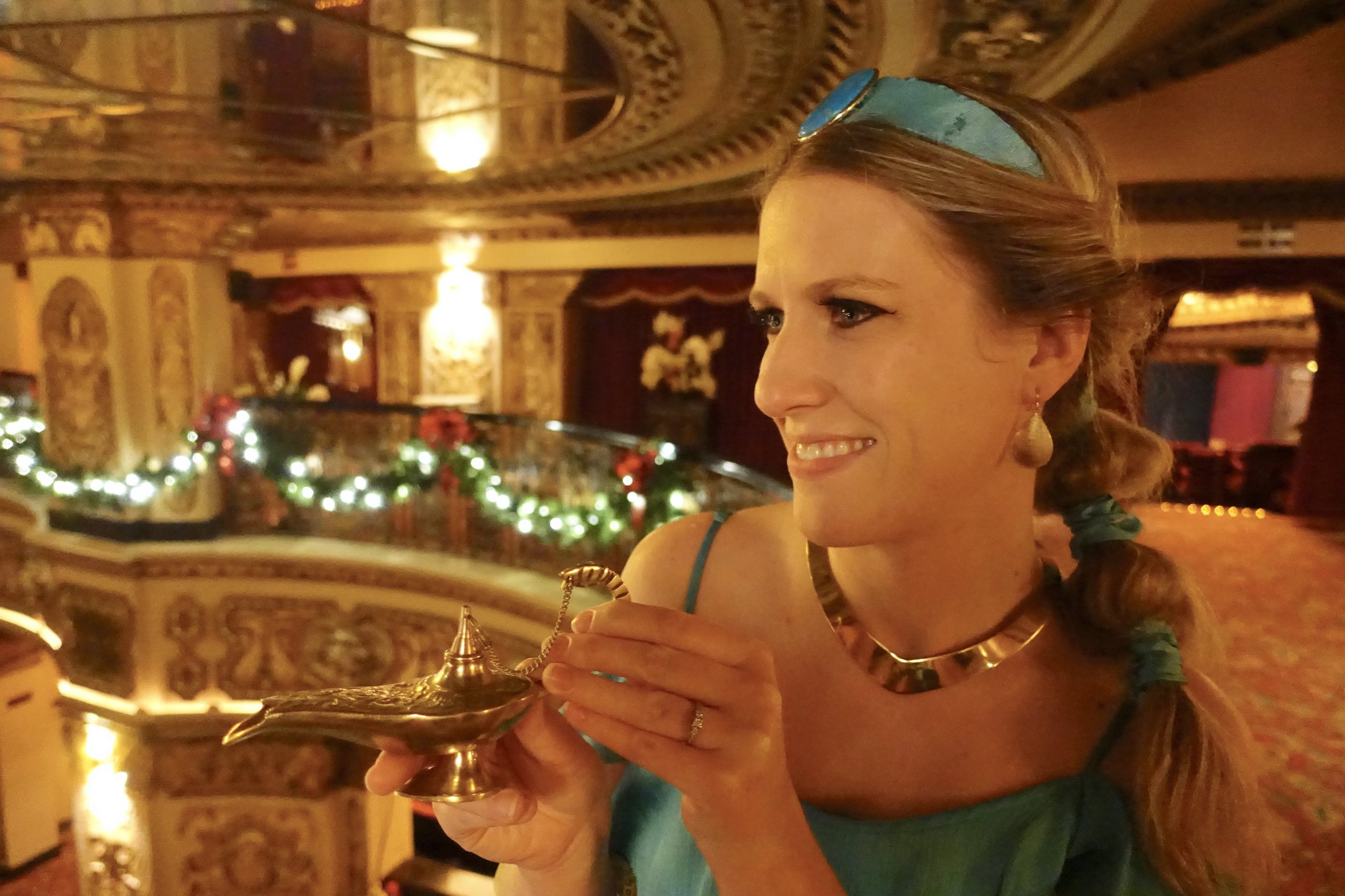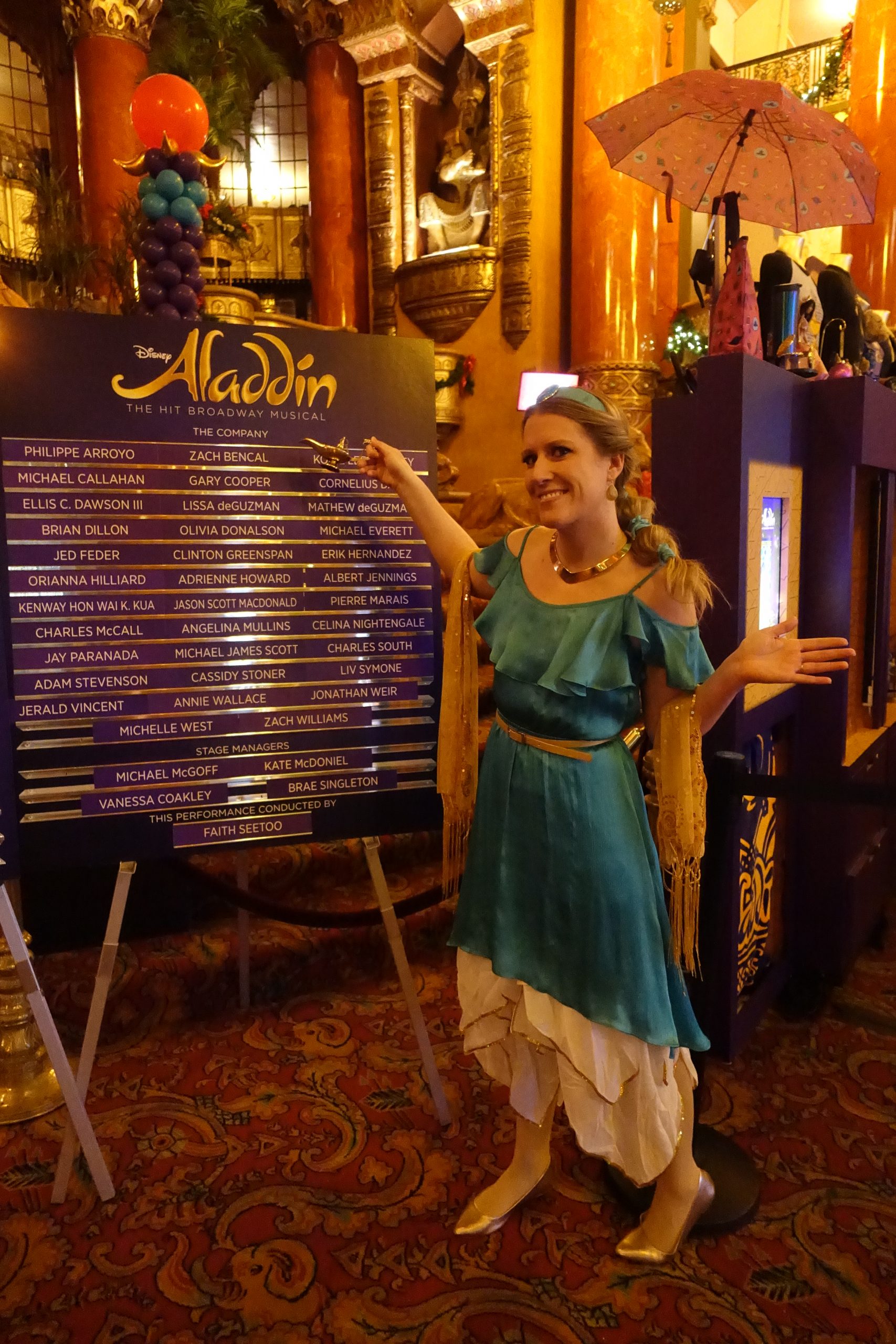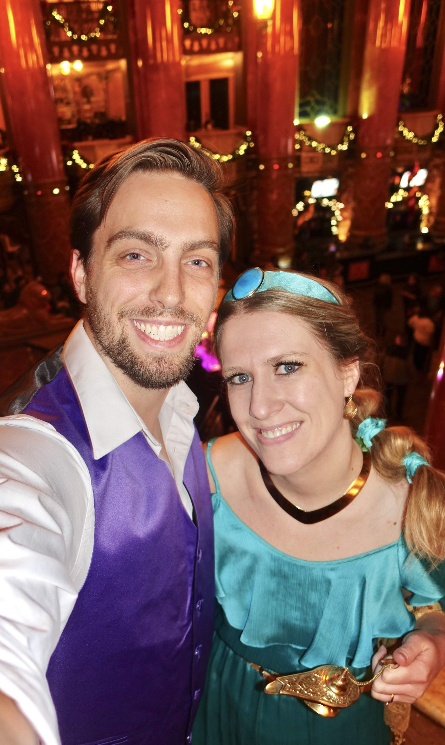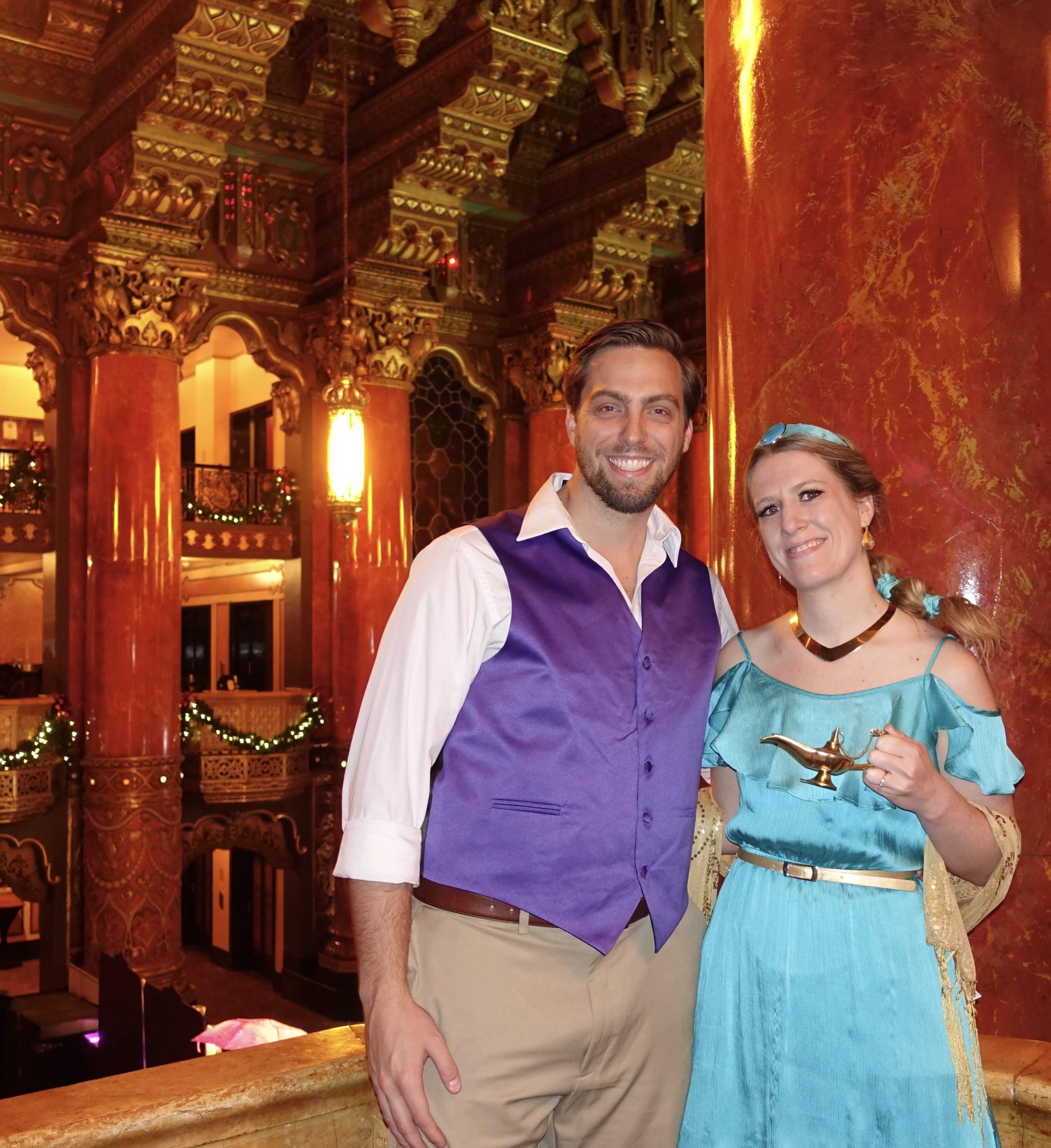 I adore dressing up, so every event becomes a chance to embrace the theme—Scott, ever the sport, goes along with my playful antics 🤪. With the Fabulous Fox Theater’s formal elegance as our backdrop, we chose a tasteful “inspired by” take on Jasmine’s regal style, capturing the essence without the daring cutouts for a night of magical sophistication. Here’s one of our other more casual Aladdin inspired outfits we wore to Disney World.
