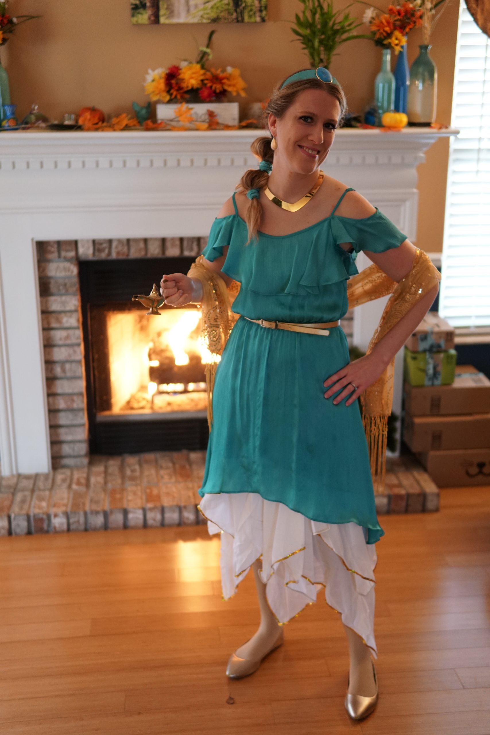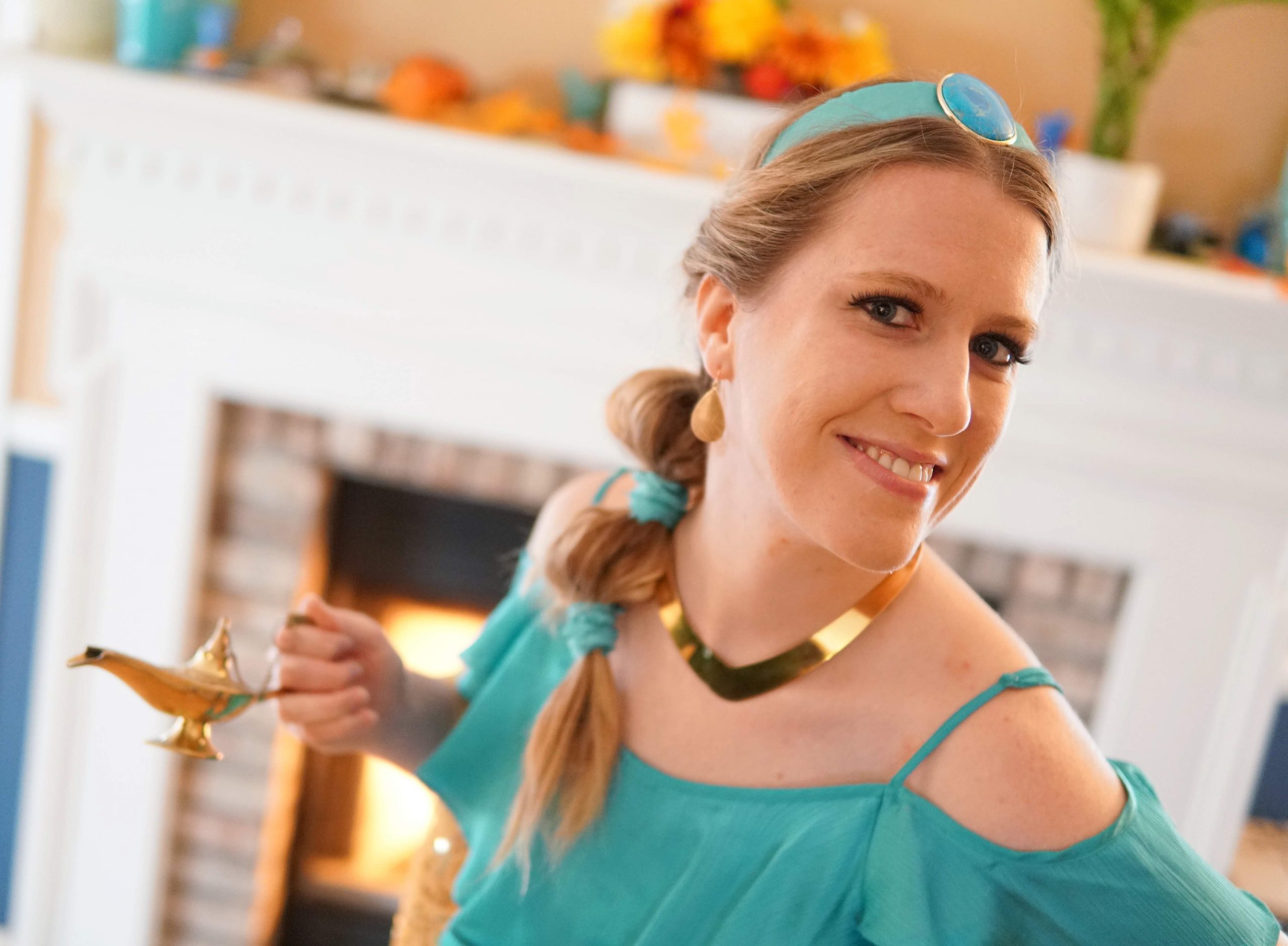 Turquoise is my favorite color so I already had a silk dress with a gold belt that matched perfectly with Jasmine’s color. I also had gold flats that went well with the ensemble. I bought a white chiffon skirt with gold sequins, gold sequin scarf, gold necklace, and gold teardrop earrings to complement the dress. I used gold eyeshadow, black eyeliner, and magnetic eyelashes to bring out my eyes. We also already had the lamp we had bought from EPCOT which made an amazing prop 😊