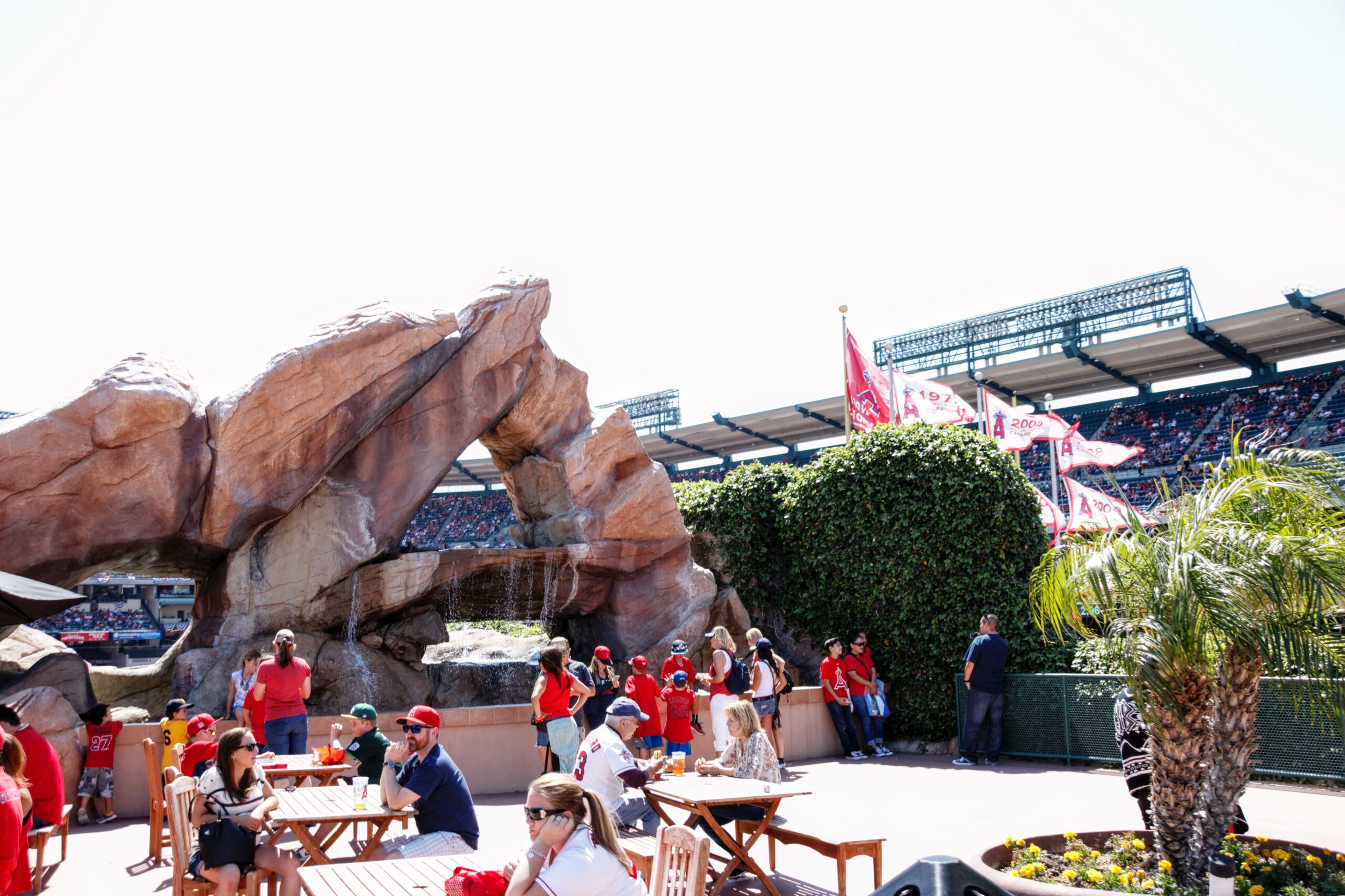 The open outfield concourse at Angel Stadium offers a spacious, breezy feel similar to Kauffman Stadium – but don’t expect great sightlines from beyond the wall. The towering California Spectacular display, with its erupting geysers and cascading waterfalls, serves more as a showpiece than a viewing platform, effectively blocking the field from the concourse. While the Centerfield Waterfall Patio – complete with picnic tables – is a lovely spot to relax, you won’t catch much of the action from there. For true game-day luxury and unobstructed views, consider the Diamond Club or Knothole Club, both of which pair an upscale atmosphere with indoor/outdoor vistas and premium concessions.