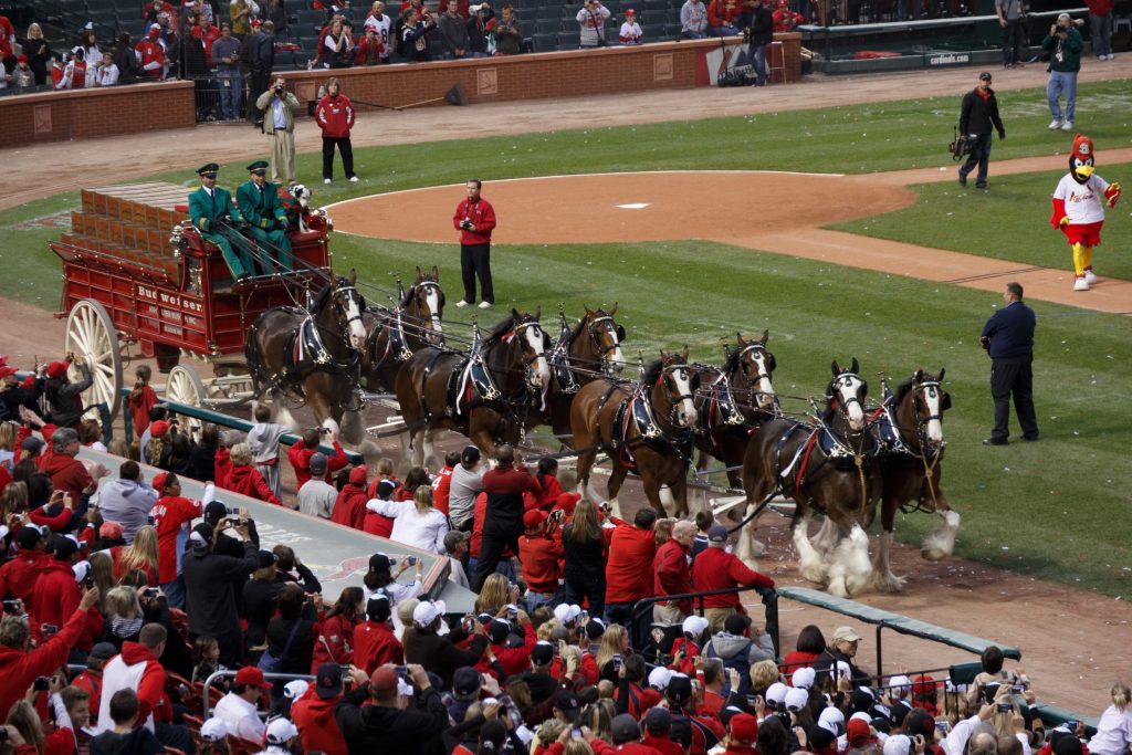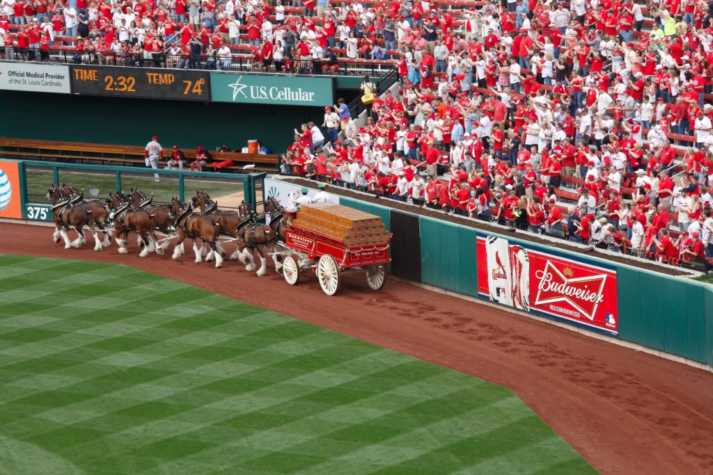 Opening Day is always an amazing experience and an unofficial holiday in St. Louis if you get the chance to participate in the festivities. One of the longest running Cardinals traditions is the Clydesdales parading around Busch with the iconic beer wagon on Opening Day. They usually play a video of this with the “Here Comes the King,” on the organ during the 8th inning. It’s always a joy to cheer on the parade of Hall of Famers and players. The Cardinals always have a few surprises – in 2023 they surprised fans with Adam Wainwright singing the National Anthem.