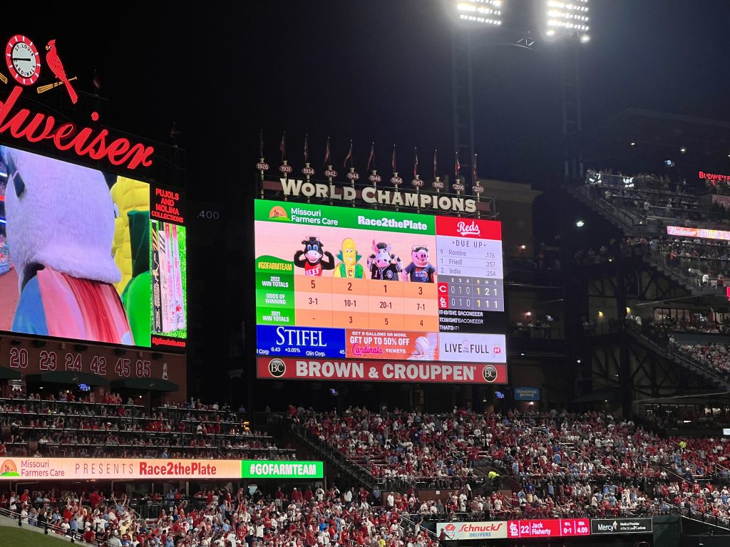 Crowning the top of the screen is the classic Budweiser logo, flanked by the iconic Birds on the Bat perched proudly around the game clock–a striking visual that feels perfectly St. Louis.