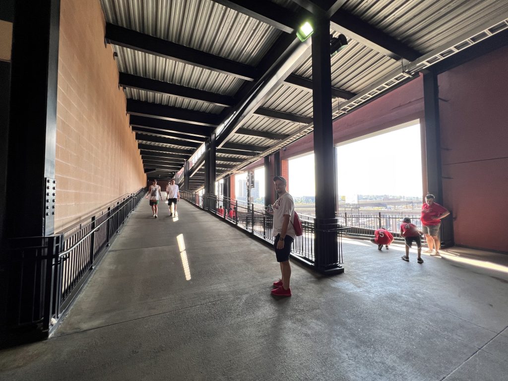The red brick exterior is a perfect fit for the Redbirds stadium–not only does it echo the team’s signature color, but it also reflects the classic brick architecture that defines much of St. Louis. The brick arches at the first base entrance mirror the historic buildings you pass on the walk to the stadium, creating a seamless sense of place. On the third base side, a black arched overhang adds a sleek, understated contrast to the traditional brickwork. Along the exterior walkways, personalized fan bricks line the path–Scott’s family has one, and it’s right where he proposed to Sarah, making it even more special. Overhead, the retro-style lights may look old-school, but they’re actually energy-efficient LEDs that blend nostalgia with modern practicality.