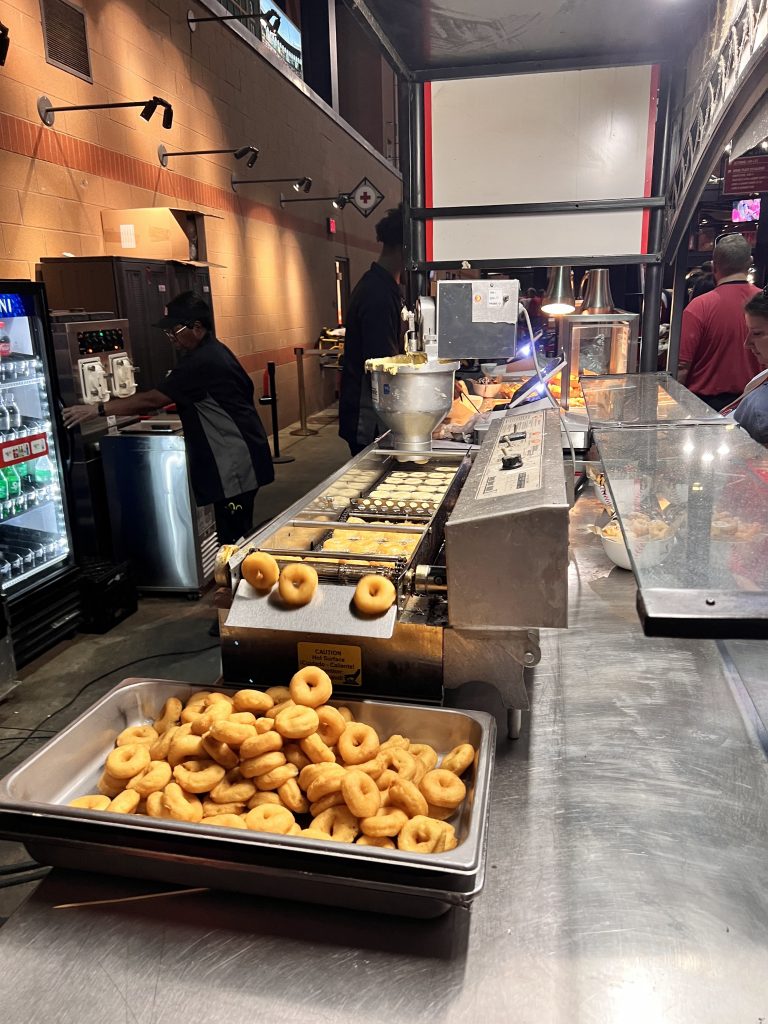 Dinger’s Donuts is probably the most talked-about dessert at Busch. The stand serves unglazed mini cake donuts with toppings like cinnamon-sugar, vanilla or chocolate icing, and optional soft-serve ice cream. It’s fun to watch them go down the conveyor belt, and if you love cake donuts, you’ll enjoy them.