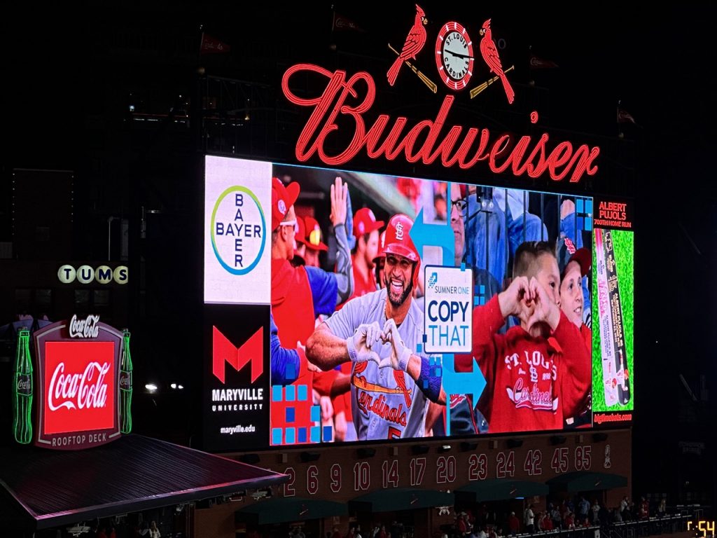 The Cardinals’ upgraded scoreboard is a major improvement–gone is the harsh orange, replaced with crisp, vibrant colors that make everything from player stats to replays pop with clarity. We really love the modern style and energy of the display. While there are some ads (as expected), they’re tastefully integrated and don’t distract from the overall design. The board is positioned in right-center field, which does mean that fans seated deep in right field may have limited visibility.
