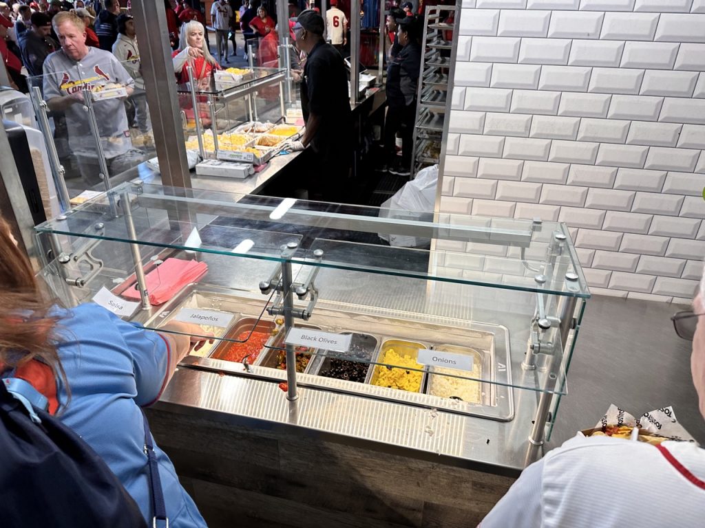 Another fun addition is the Top Dog stand (located near Sections 132 and 189 in the outfield). It’s a build-your-own hot dog spot where fans can customize their Jumbo Dog Deluxe with a variety of toppings like onions, BBQ sauce, giardiniera, pepper jack cheese, pickles, banana peppers, and sport peppers. Naturally, we loaded ours with everything. Scott ranked it second only to the bacon-wrapped dog, while I wasn’t sold–the hotdog itself is very big and Sarah didn’t really like the flavor (that’s what she said, lol). Still, it’s a fun experience and part of Busch’s wider trend toward DIY-style concessions, which we’re definitely into.