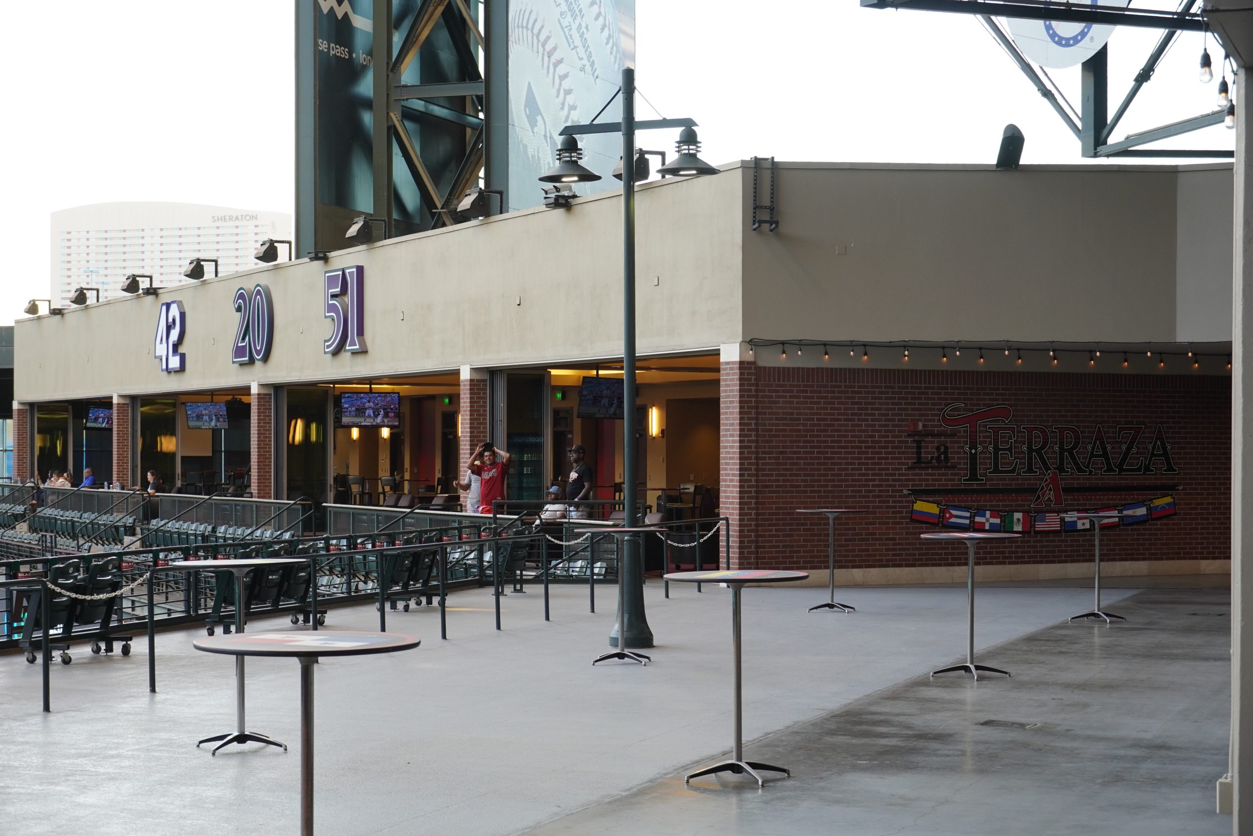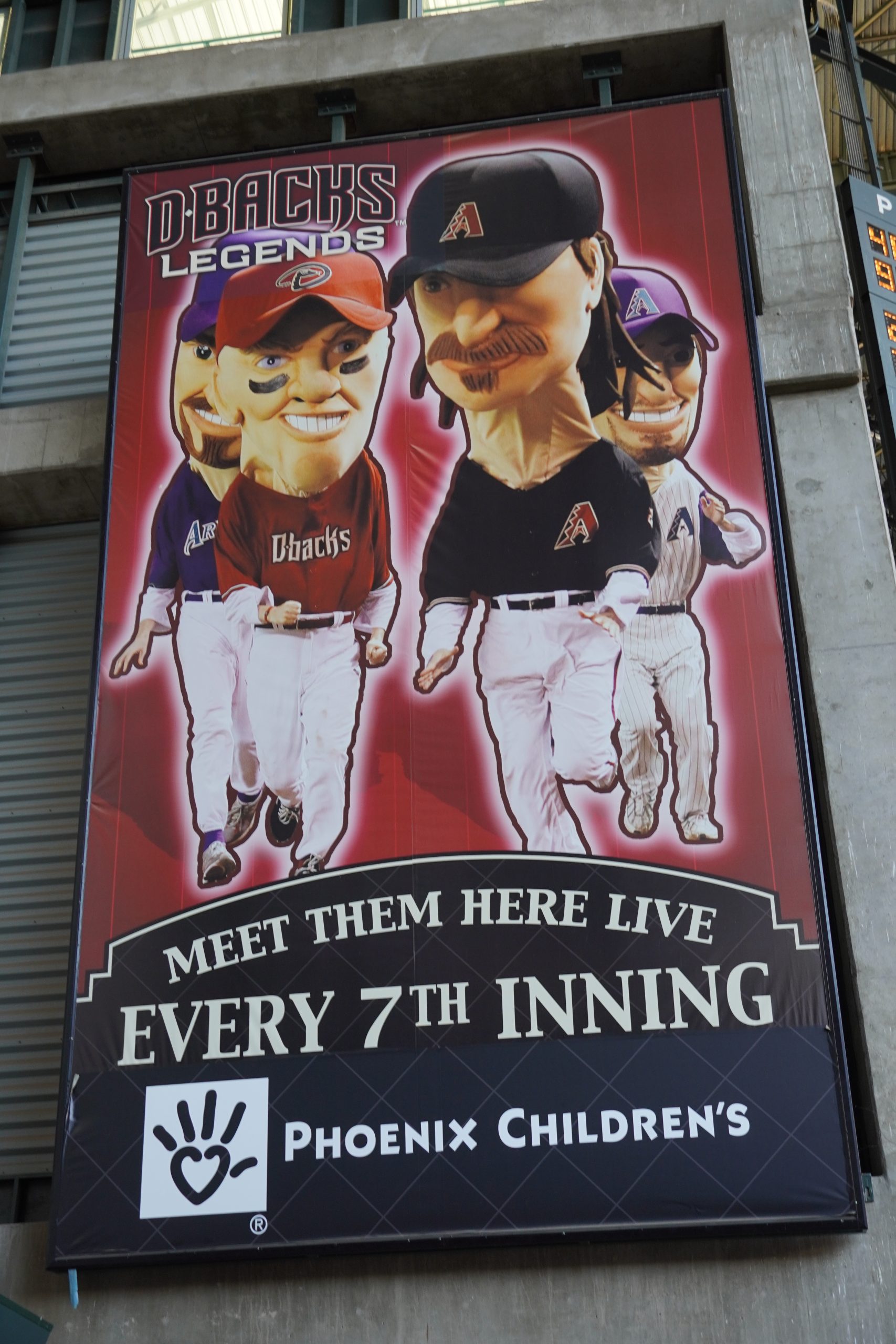 The stadium design pays homage to both team and city history. Player banners hang in the APS Solar Pavilion, while retired numbers are prominently displayed above right field. The large “window” panels feature generic D-backs players and sports imagery, likely chosen to avoid frequent updates. The main rotunda showcases a striking Grand Canyon mural on the floor, and Gonzo’s Grill offers a fun tribute to Luis Gonzalez, a franchise legend.
