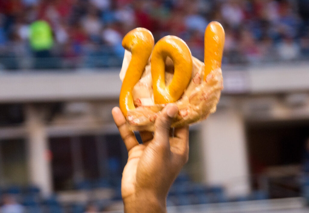 Later, we discovered our favorite ballpark indulgence: Fluffy Thoughts Cakes, a McLean, VA bakery that bakes fresh treats and delivers them before every game. Sarah savored a whimsical layered cake push pop, while I couldn’t resist the HarpCake – a Funfetti cupcake iced to resemble Bryce Harper. It was easily the highlight of our culinary tour.