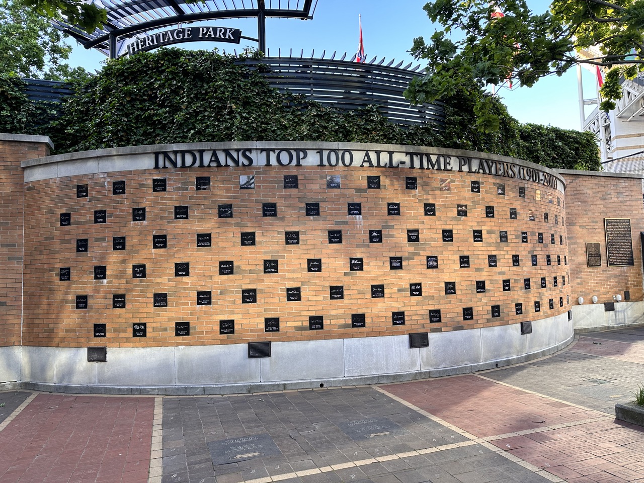 The Heritage Park Hall of Fame, tucked just beyond the center field bleachers near the bullpen, is free to explore with a game ticket. It features a ring of plaques honoring Hall of Famers, anchored by a statue of Frank Robinson, and a commemorative wall showcasing the top 100 Indians players.