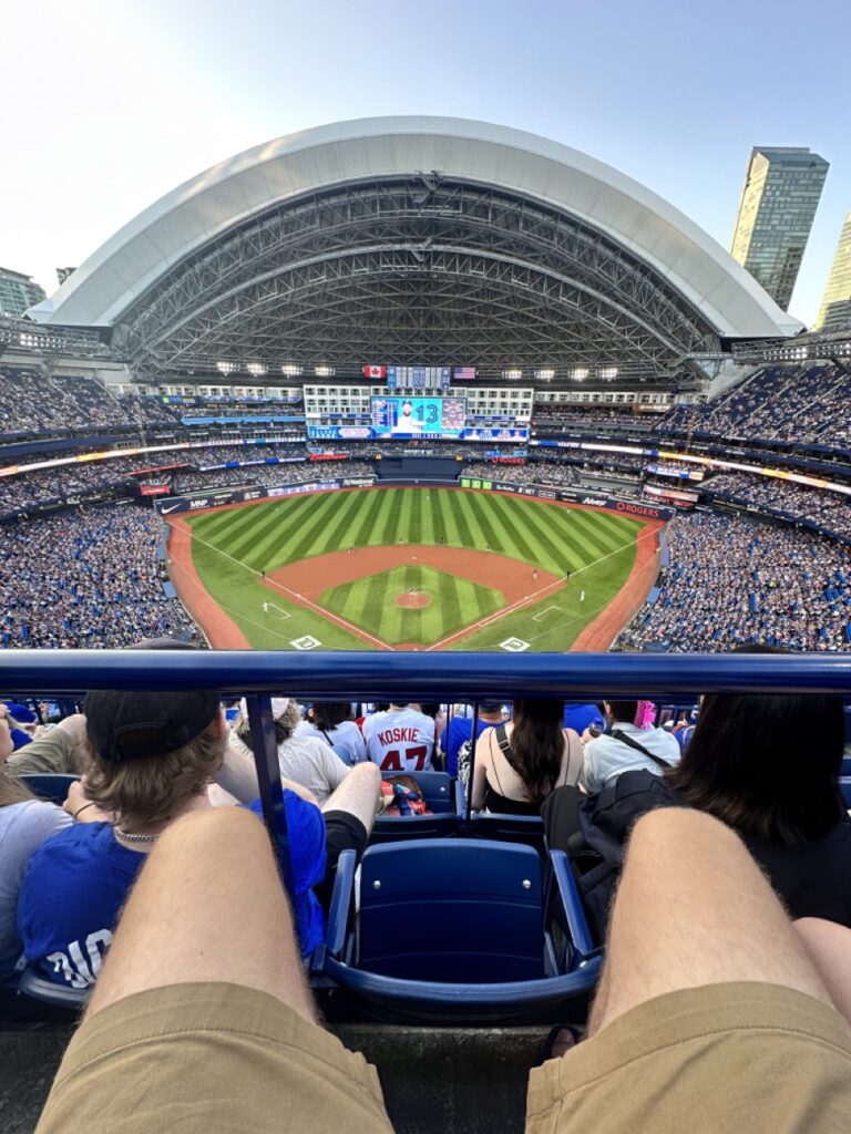 The stands were nearly full, and the crowd brought great energy, especially during the two home runs ā which drew loud cheers and standing ovations. Even with the Blue Jays trailing late, most fans stuck around, showing impressive loyalty. The wave made several rounds through the stadium, and the overall vibe was upbeat and welcoming. Despite Scott rocking his Cleveland Rick āWild Thingā Vaughn jersey, there was no heckling ā just friendly banter from a good-natured fanbase.