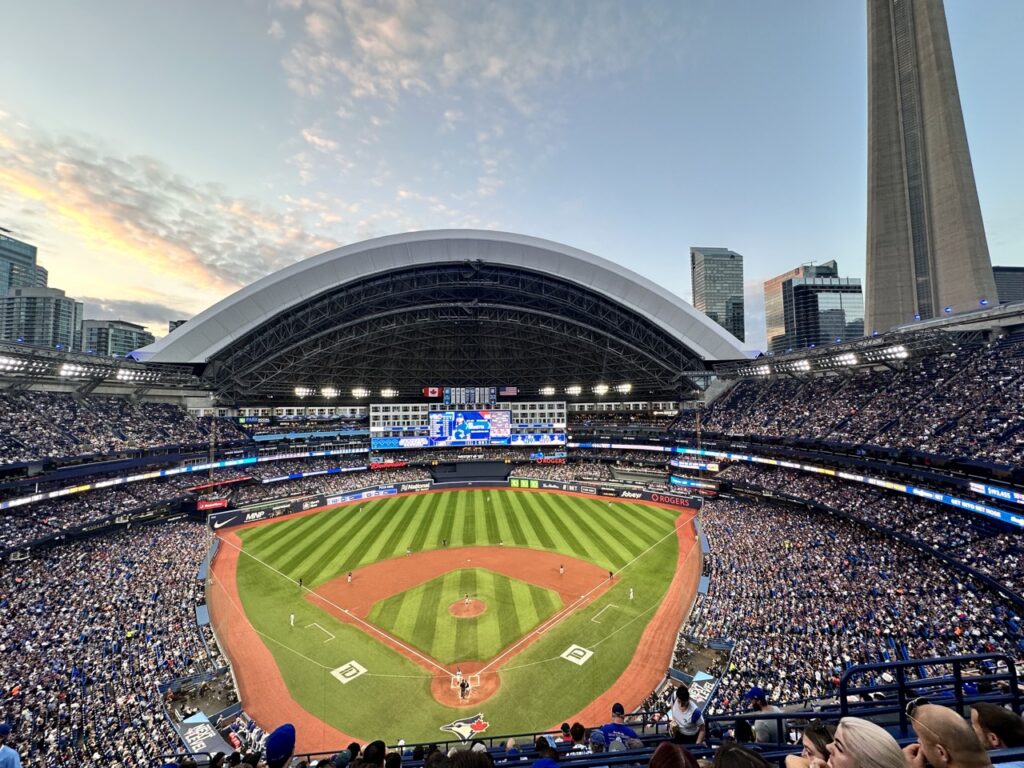 Rogers Centre, nestled in the heart of downtown Toronto, offers a distinctly urban baseball experience with its retractable roof, city skyline, and proximity to top attractions like Roundhouse Park. When the dome is open, the view of the illuminated CN Tower rising above right field adds a dramatic and unforgettable touch to the game-day atmosphere. While the stadiumās concrete-heavy design and steep upper decks can feel dated or cramped, it redeems itself with the lively and innovative Outfield District ā a multi-level social space filled with bars, games, lounges, and even a DJ, Xbox consoles, and live music. Concessions are solid, with Dugout Deals stands providing affordable snacks and the adventurous poutine hot dog offering a uniquely Canadian twist. Outside, the Roundhouse Park area is a destination in itself, with spots like Steam Whistle Brewery and The Rec Room drawing big crowds and serving as the perfect pregame hangouts. While the fans were friendly and energetic ā complete with chants, waves, and loyalty even in a late-game deficit ā the stadium could benefit from better airflow, modernized concourses, and more visible team history throughout. Still, for a dome stadium, Rogers Centre delivers a memorable, uniquely Toronto ballpark experience.