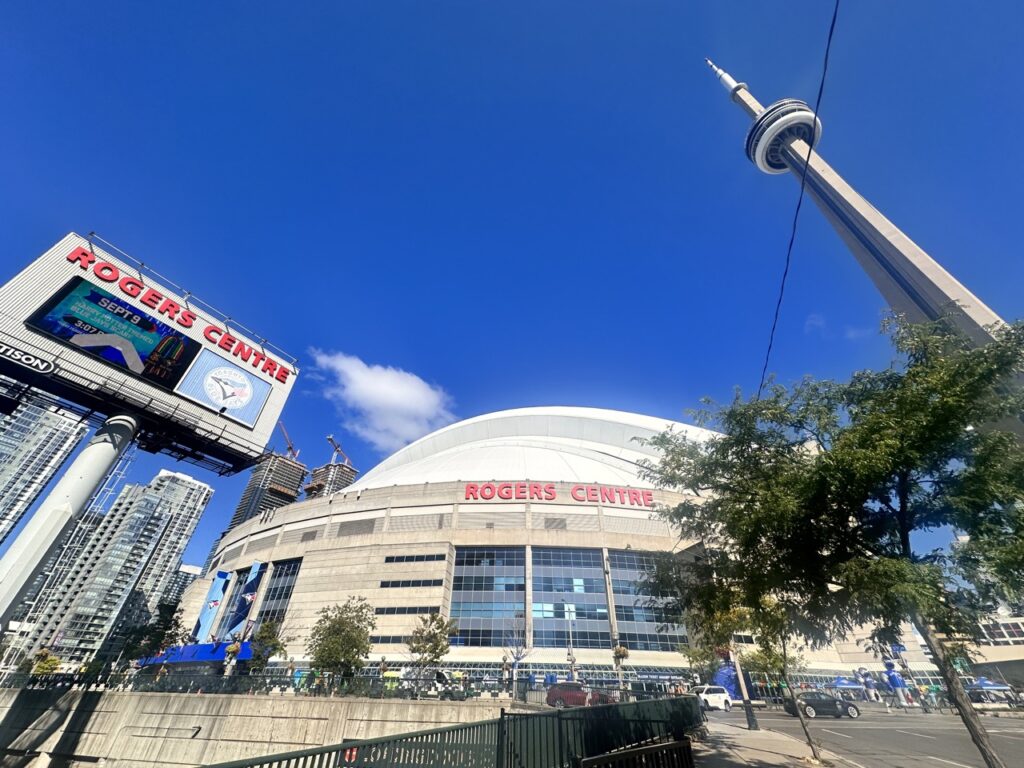 The CN Tower looms prominently beyond the first base side, giving the ballpark a dramatic and unmistakably Toronto backdrop. Surrounding the stadium are mostly modern glass-walled office buildings and apartments, many of which were still under construction during our visit. While not the most picturesque skyline compared to other parks, the urban setting ā anchored by the iconic CN Tower ā adds a distinct city vibe to the overall experience.