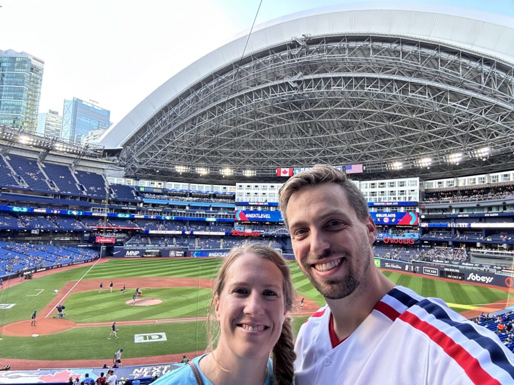 Blue Jays fans recommended the poutine hotdog, which seemed like the thing to try at a Canadian ballpark. Scott said it tasted like Thanksgiving, lol. It was definitely a uniquely Canadian experience. We also tried the Oreo churro from Park Social. It was a chocolate churro topped with crushed Oreos and frosting, and was delectable. Blue Jays fans recommended trying the Westjet jerk chicken and brisket nachos. We would have loved to try these but unfortunately were too full.