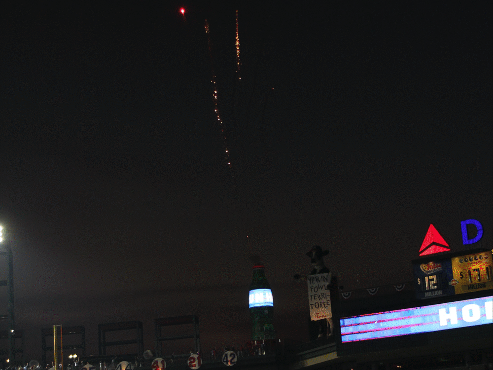 Fireworks shoot out of a Coca Cola bottle which is very fitting since the World of Coke is nearby. We got to see this multiple times since both McCann and Freddie Freeman had home runs.