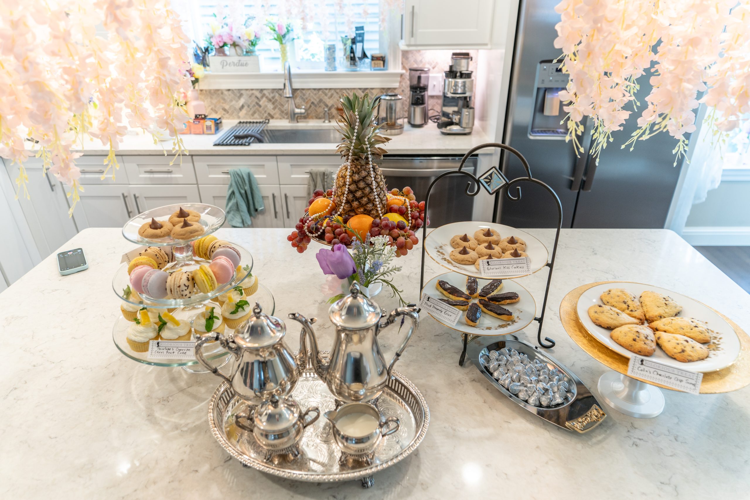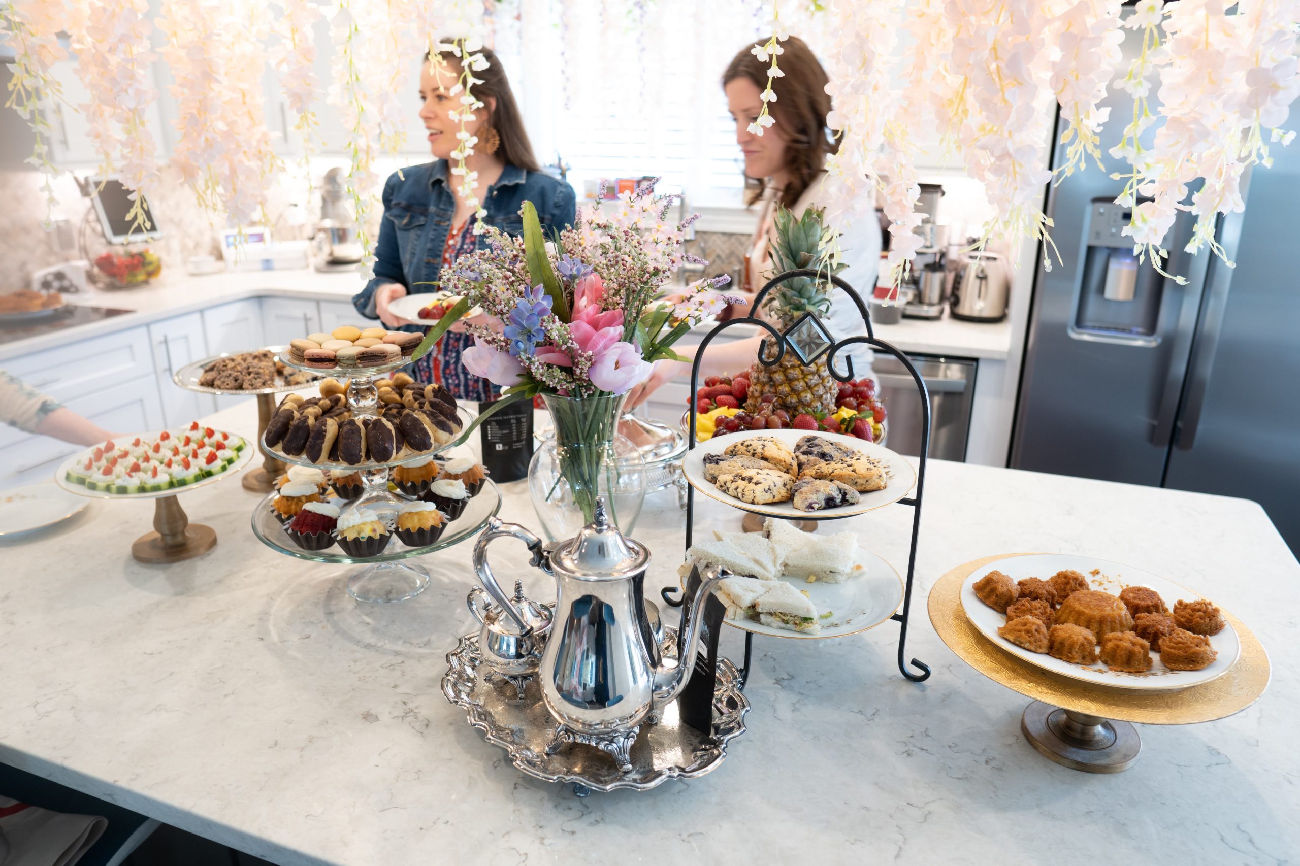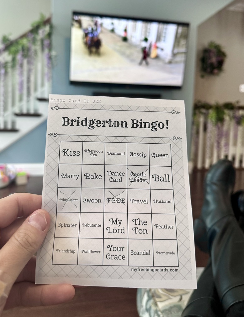For our 2022 Season 2 watch party, we transformed the afternoon into a Bridgerton-inspired tea worthy of the ton. Drawing on the season’s cultural muse, Kate Sharma, we served Indian Assam Khongea Estate tea alongside a decadent spread of blueberry and chocolate scones, honey cakes, tea sandwiches, eclairs, macarons, cucumber bites, and mini Nothing Bundt Cakes. I even created a custom Bridgerton Bingo with iconic phrases and plot points—mallet of death, bee, debutante, diamond, Whistledown, pianoforte, my Lord, ball, scandal, rake, gossip, spinster, and swoon. The only thing missing was an actual invitation from Lady Danbury herself.