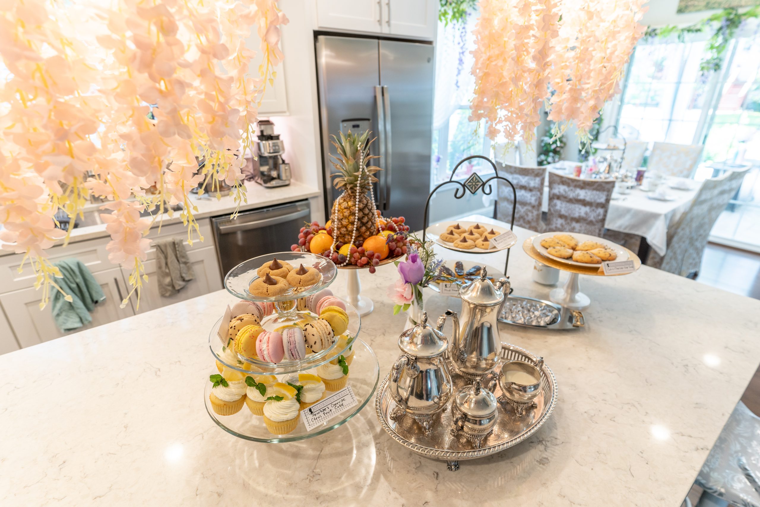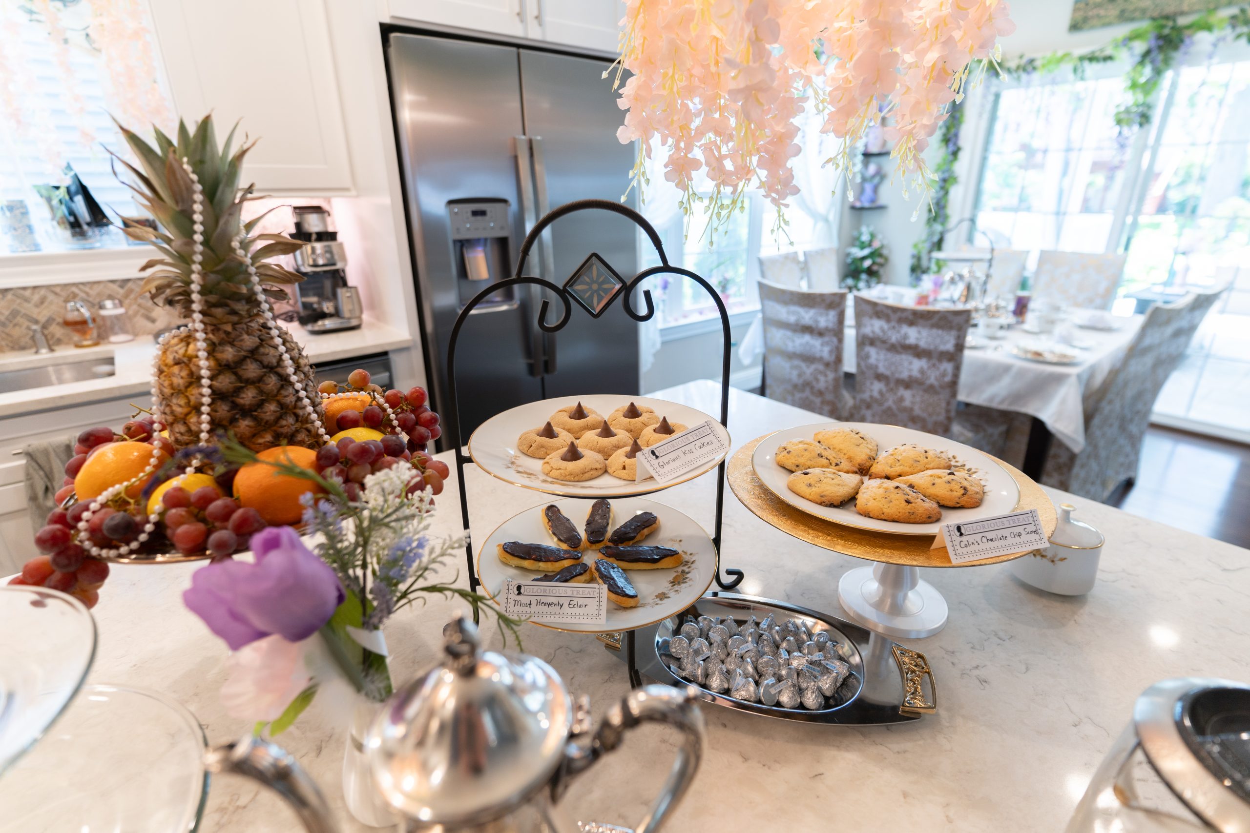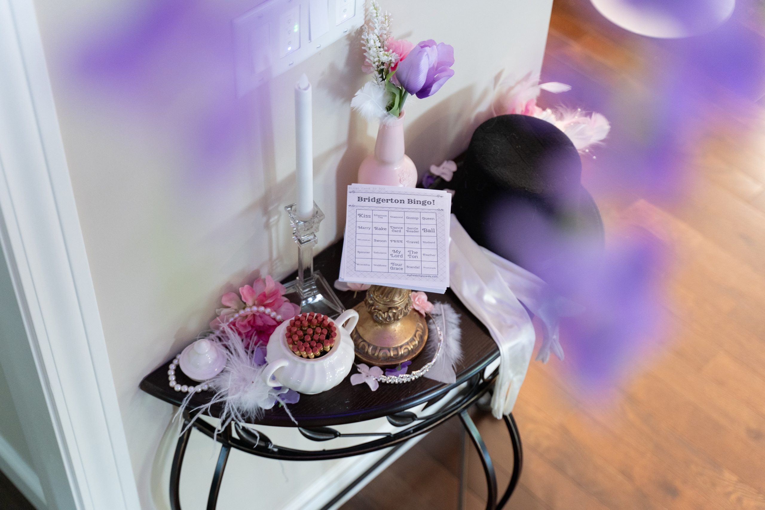 We hosted a Season 3 afternoon tea and watch party with a plethora of citrus and feathers in honor of Penelope Featherington. We brought back the Bridgerton Bingo and added a few words for the season couple – Polin (e.g., Featherington, feather, friendship, wallflower, Dearest Reader, travel).