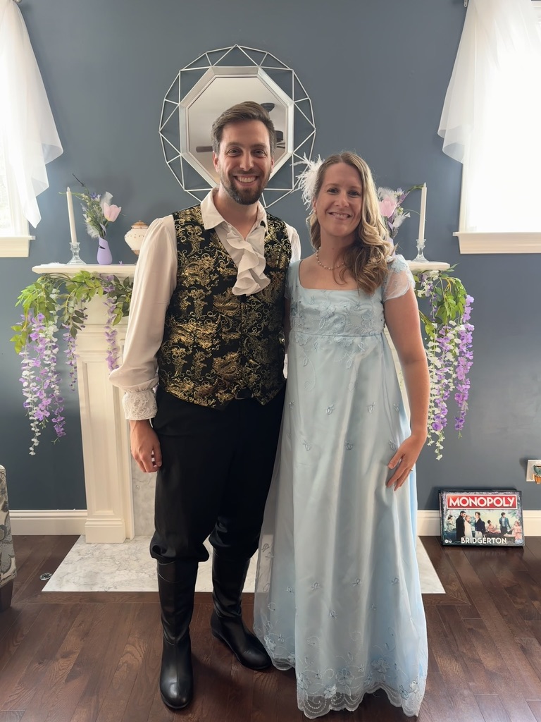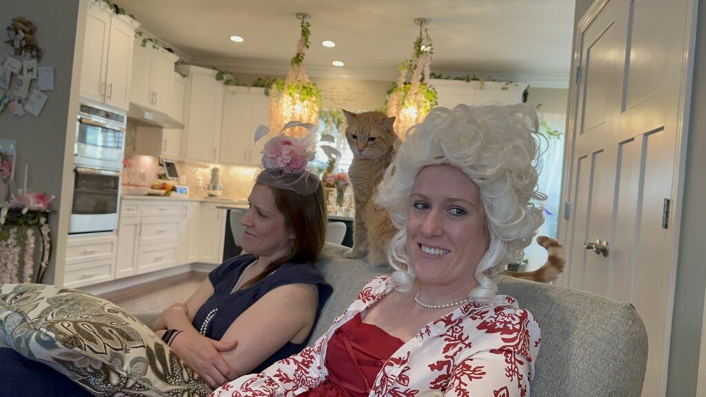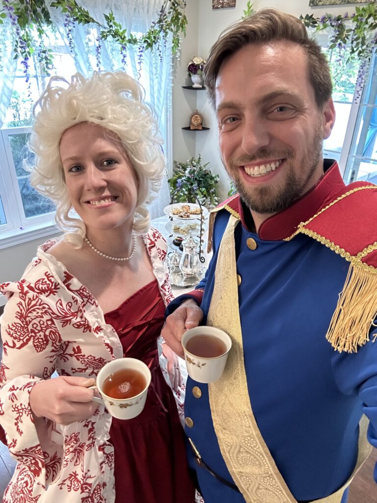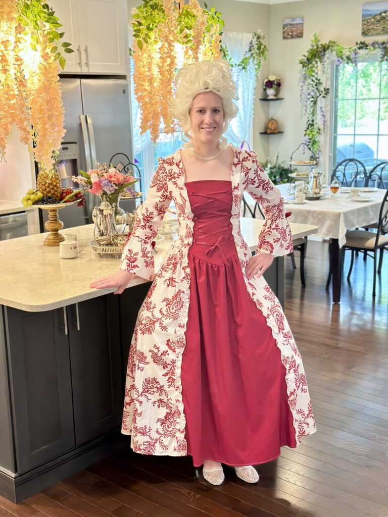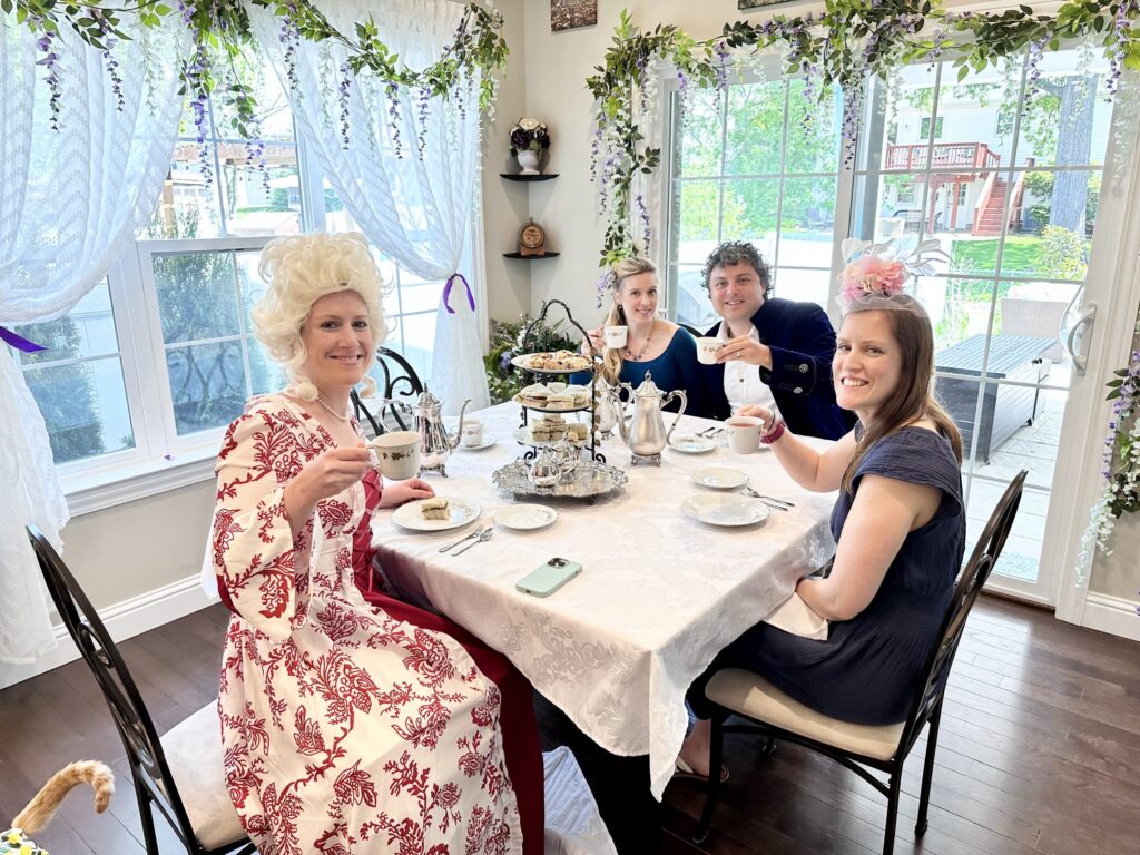 In 2023, we returned to the ton for a Queen Charlotte-themed afternoon tea and watch party to celebrate the release of the Bridgerton prequel. I channeled Queen Charlotte herself—complete with a towering wig and a touch of Marie Antoinette flair—while Scott made a dashing Prince Friedrich. We served a regal tea spread similar to our previous gatherings, with all the sweet and savory delights fit for royalty. It was a fête worthy of a royal proclamation (or at least a juicy Whistledown column).