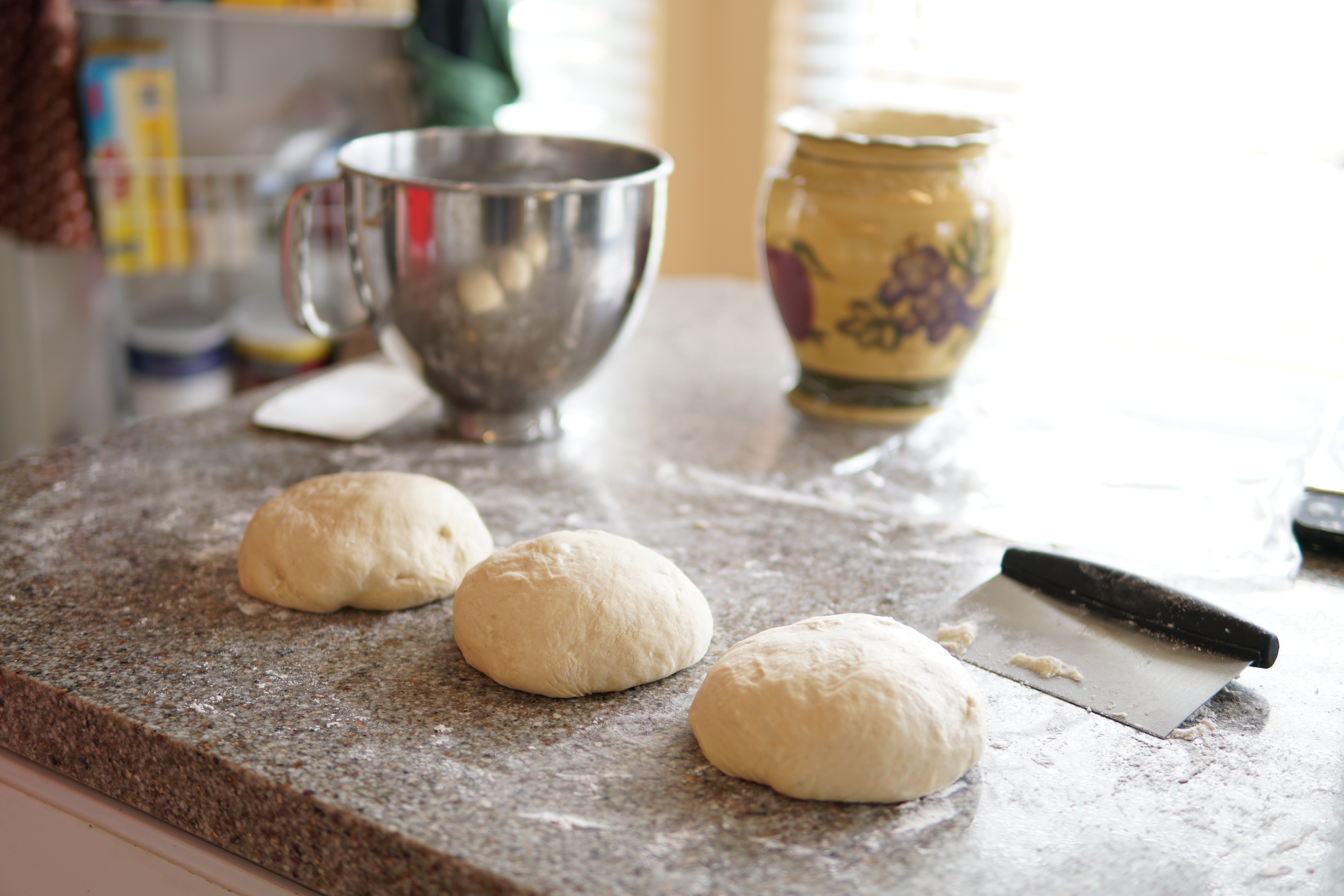 Once the dough has doubled in size, split the dough into three balls. I usually weigh the entire quantity and then split into 3 equal parts by weight (that’s the scientist in me that likes precision). Grandma always just eyeballed it 🙂