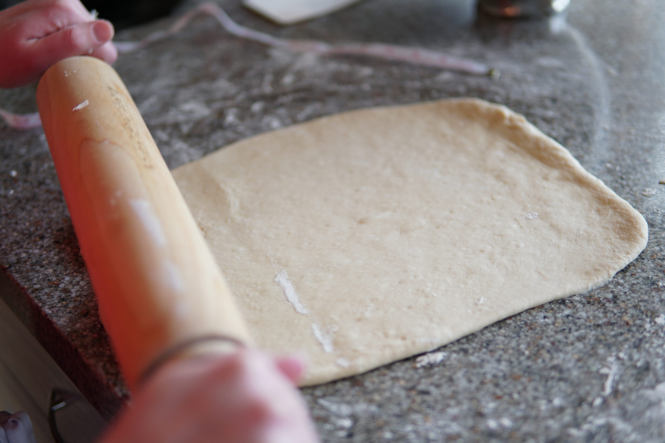 - With a rolling pin, roll out each ball to ~10"x12" rectangle.