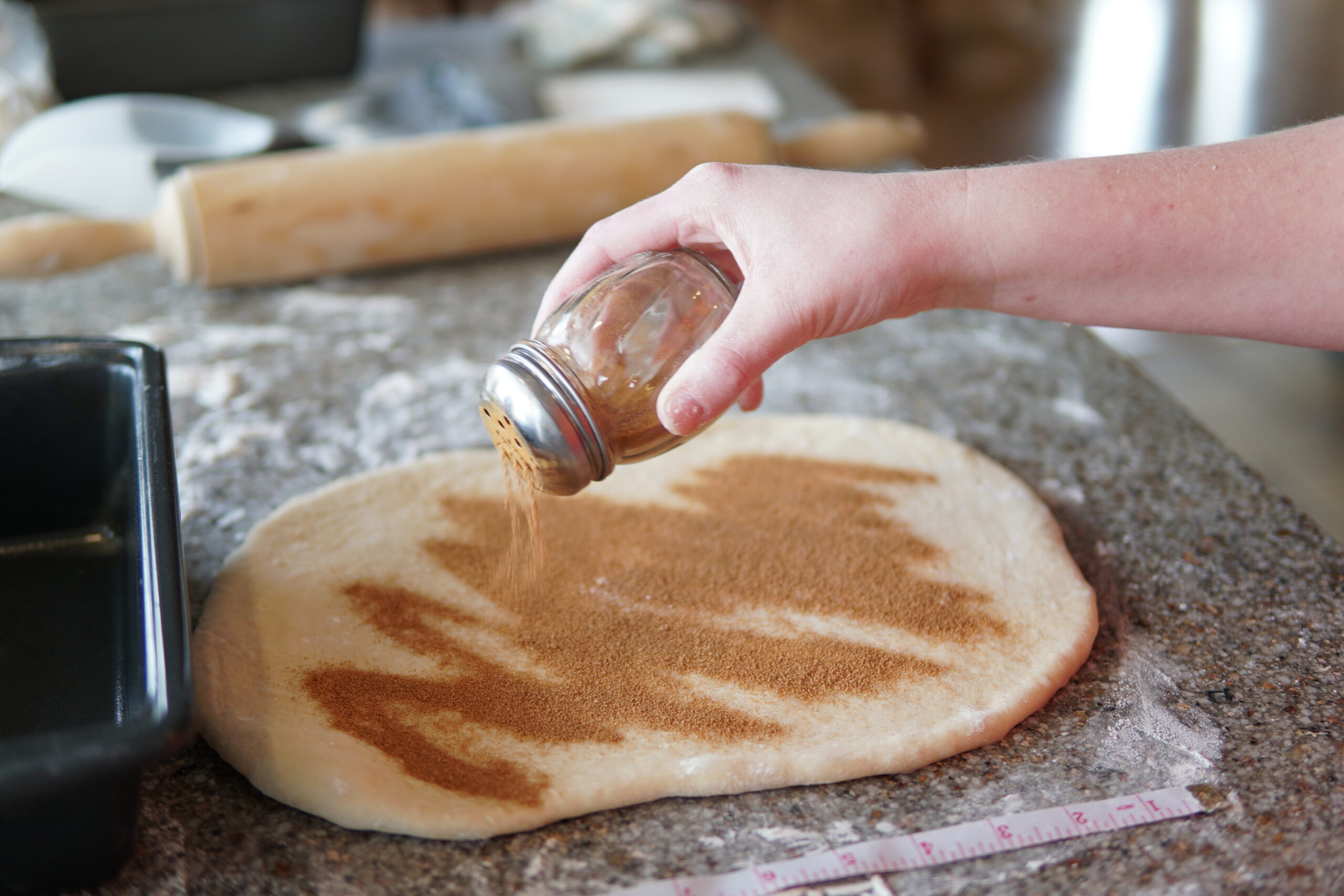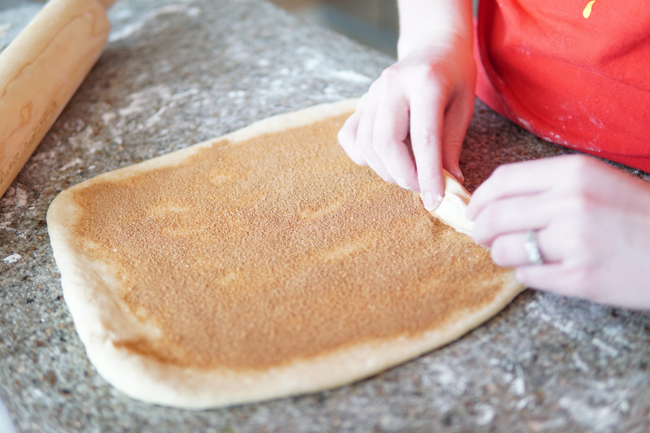 - Mix together cinnamon-sugar filling and sprinkle evenly onto dough. Alternatively, you can use sprinkle cocoa as the filling instead of cinnamon-sugar.