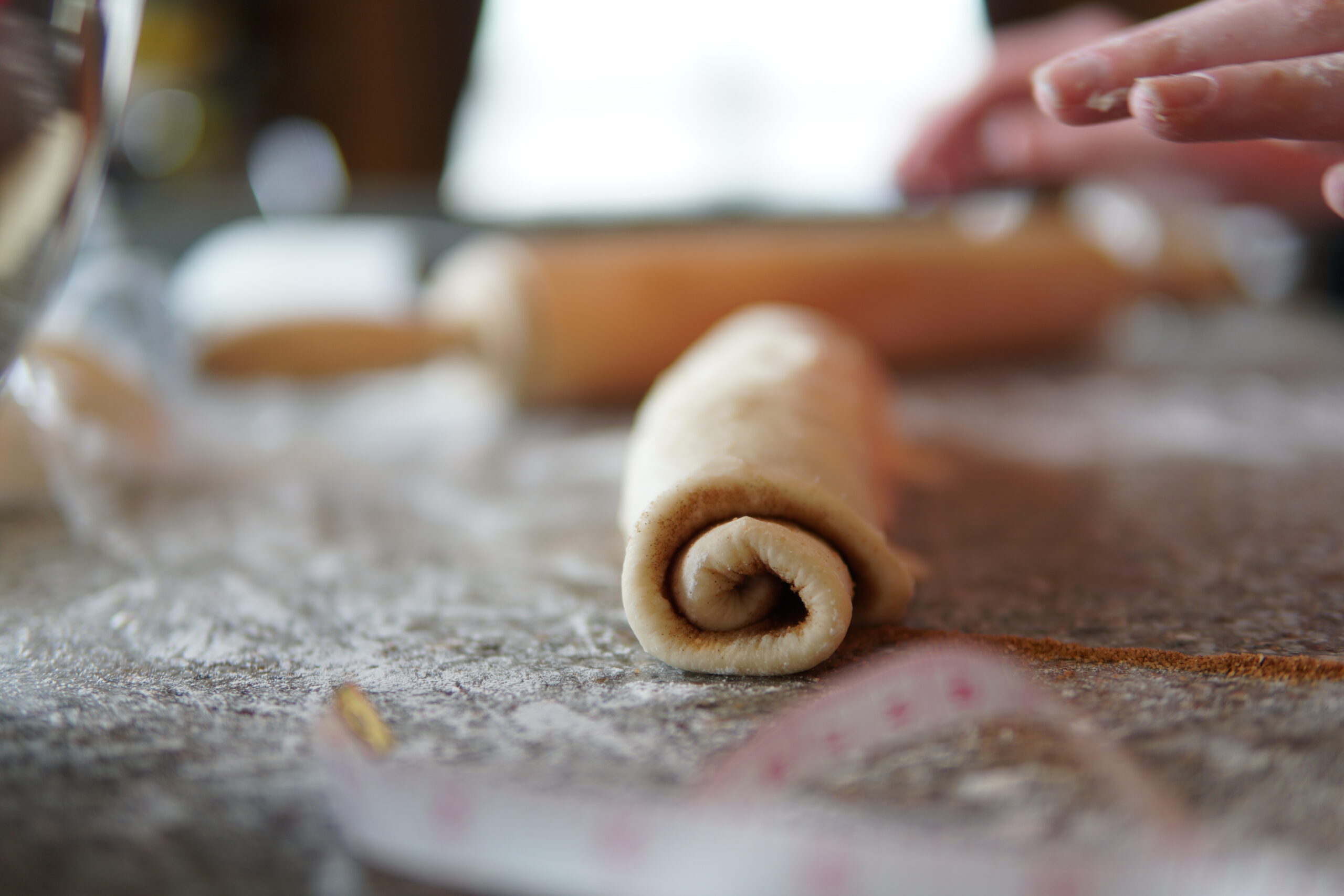 From the long edge, roll the dough down to the bottom edge.