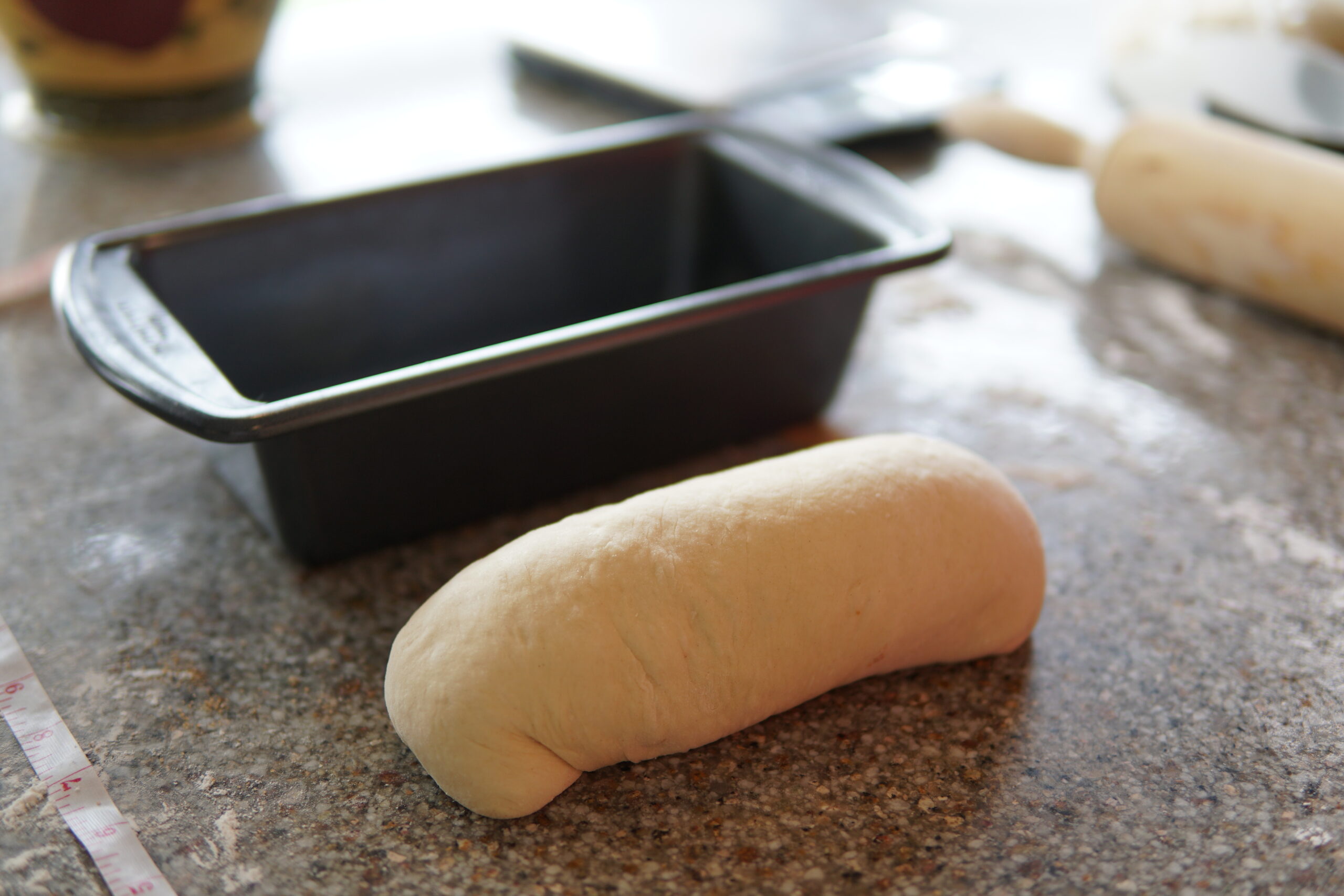 With a rolling pin, roll out each ball to 10″ wide x 12″ long rectangle. It took me a little trial-and-error to figure out what dimensions yielded a nice loaf shape. The trick is to make sure you don’t roll it too thin or that the width doesn’t extend outside the loaf pan after rolling under the ends. Loaf pans are generally 9″ x 5″. The extra 1″ inch in the width allows leeway for rolling under the ends (1-2″) and ensures it fits inside the pan. If you roll the dough too thin, the dough won’t rise enough and you’ll have gaps in the bread.