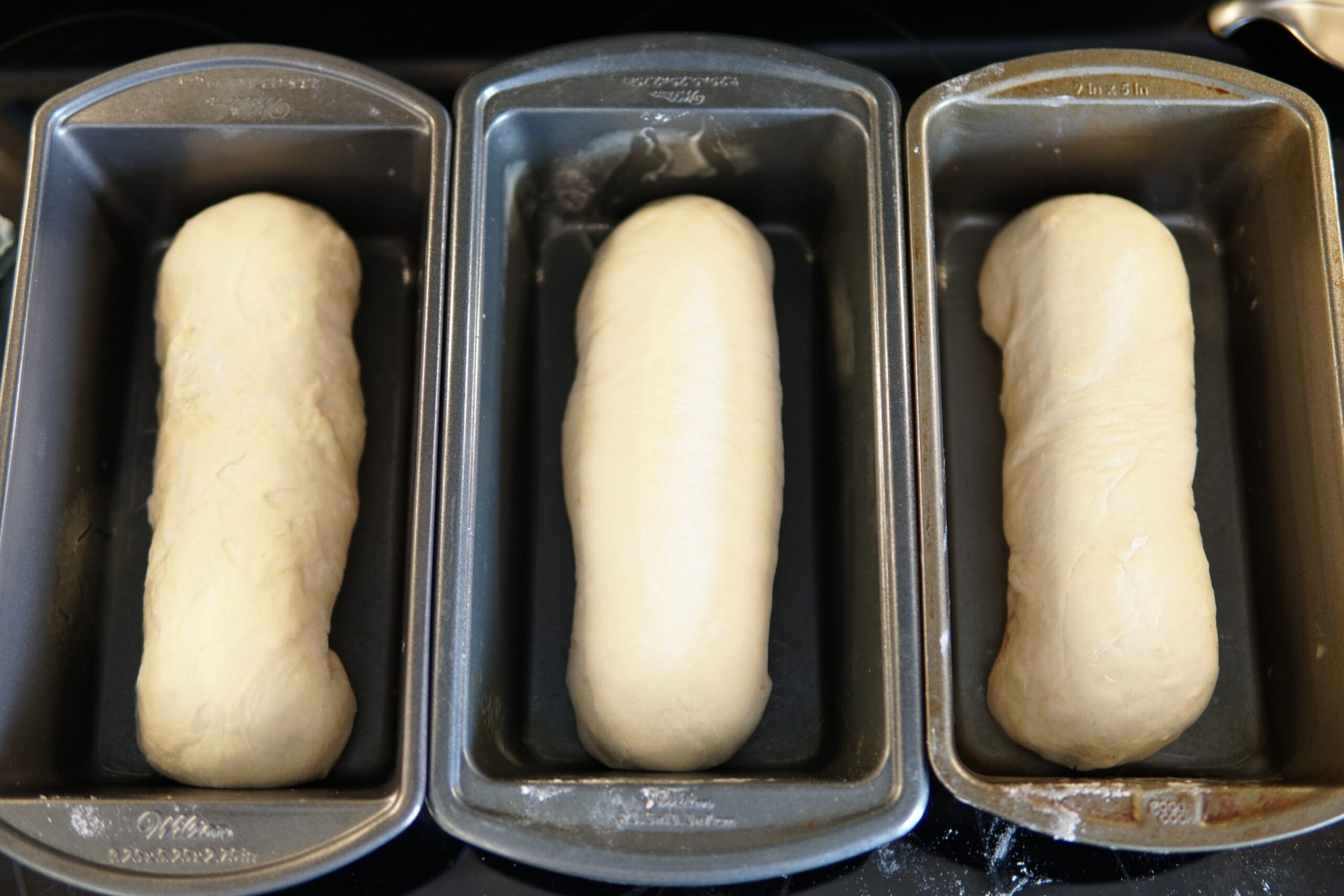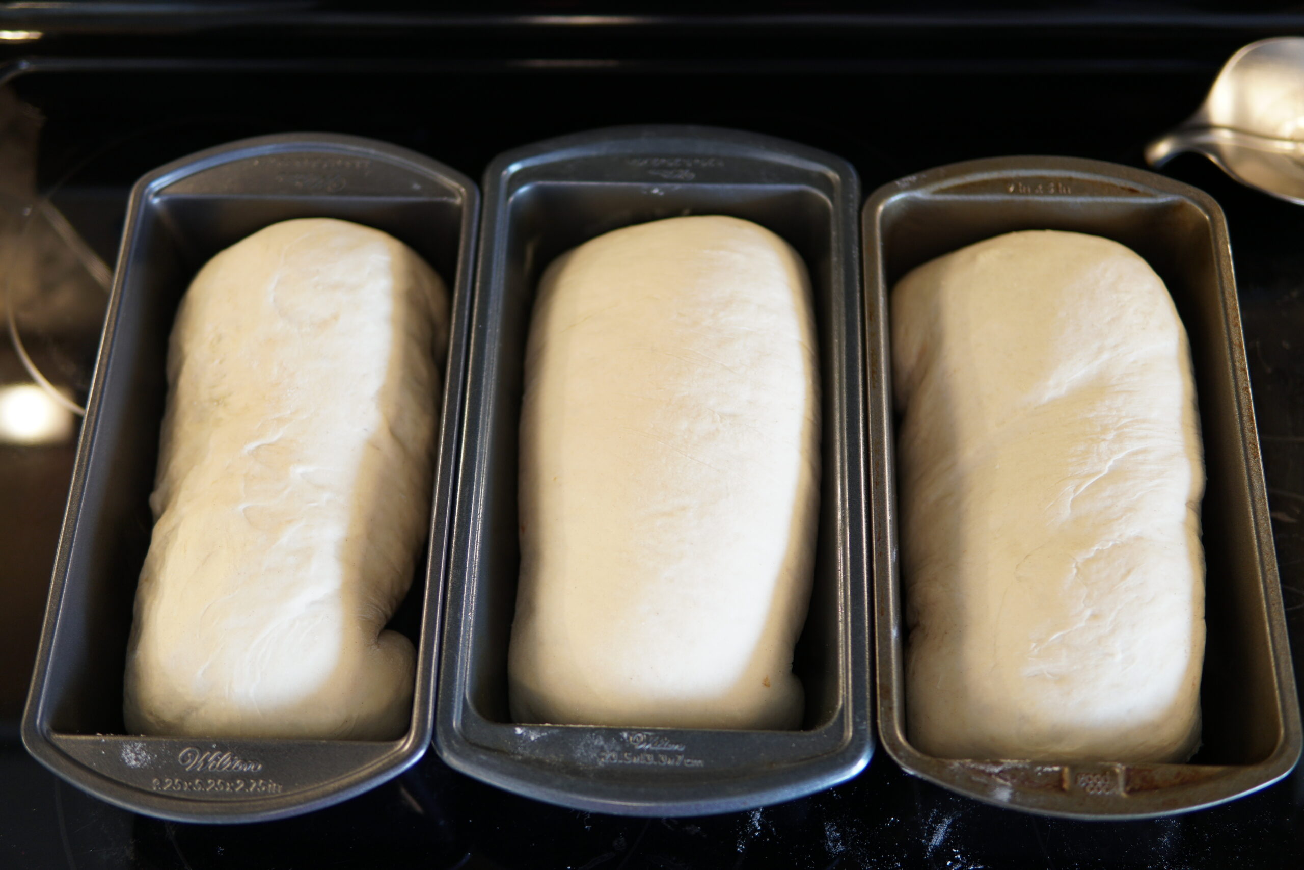 Spray three loaf pans with oil and transfer loaves into pans. Cover loaves with damp cloth/saran wrap and let rise 1 hour, until loaves rise to fill the pans.