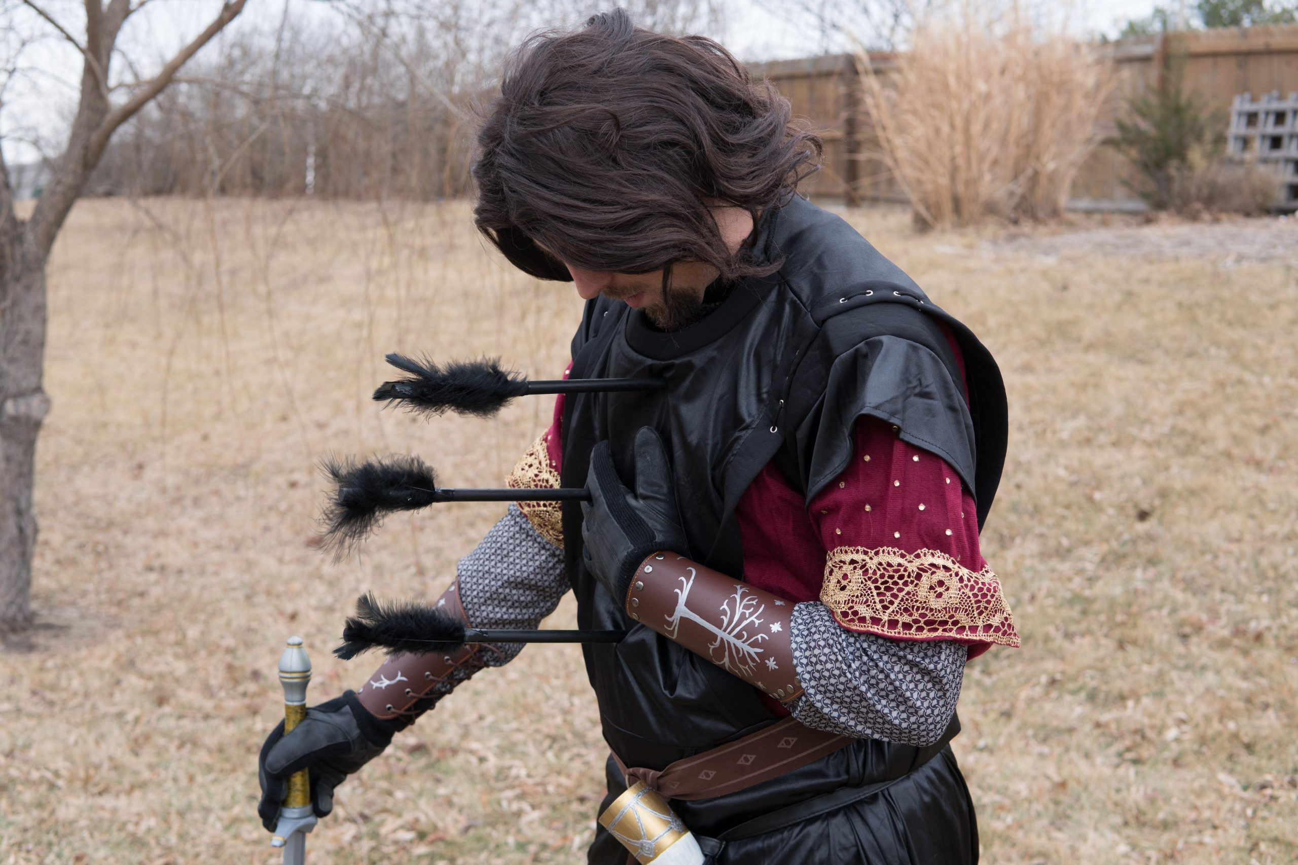 The arrows were pretty tricky for Boromir. We bought large doll rods, painted them black, and glued black feathers to the ends. Then we screwed each arrow into a board going directly through the shirt.