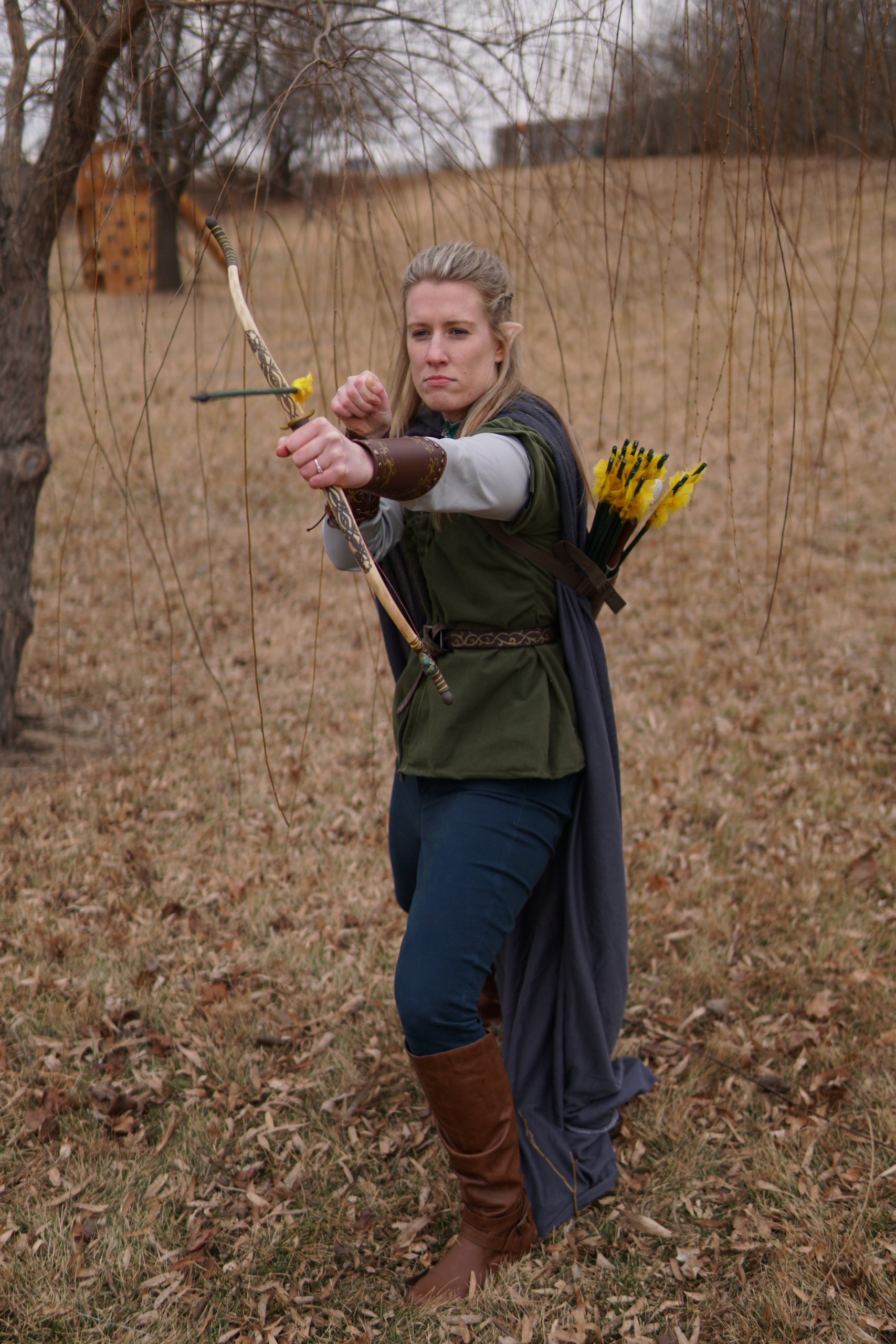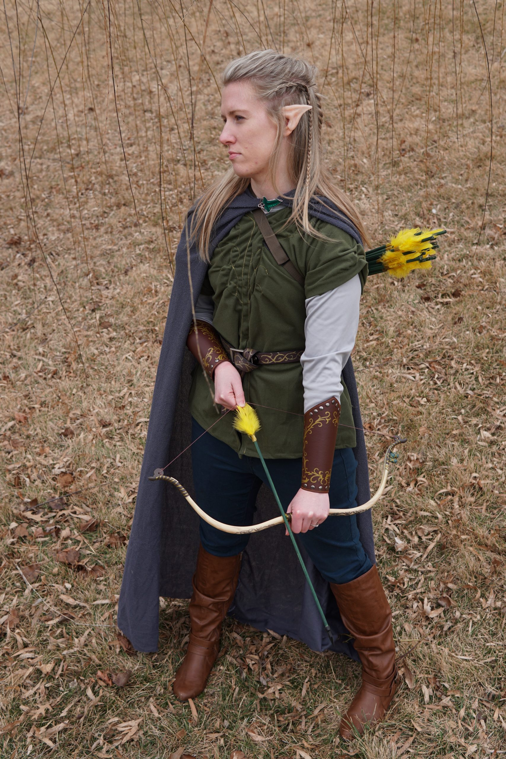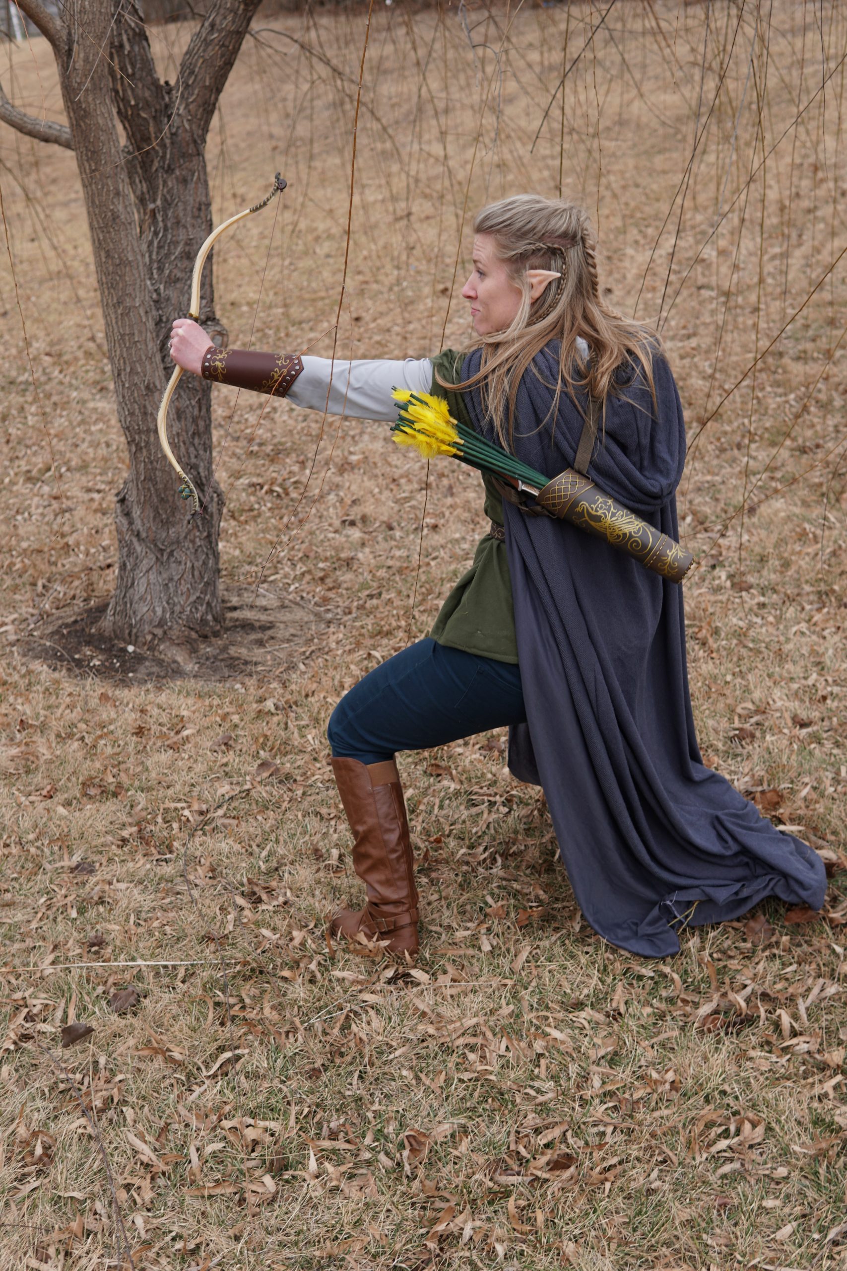For the bow and arrows, I utilized a Merida archery set and customized some plain arrows. I painted the arrows green and glued on yellow feathers. I hand drew some gold designs on the quiver. I bought the Legolas long blade rather than attempting to make my own.