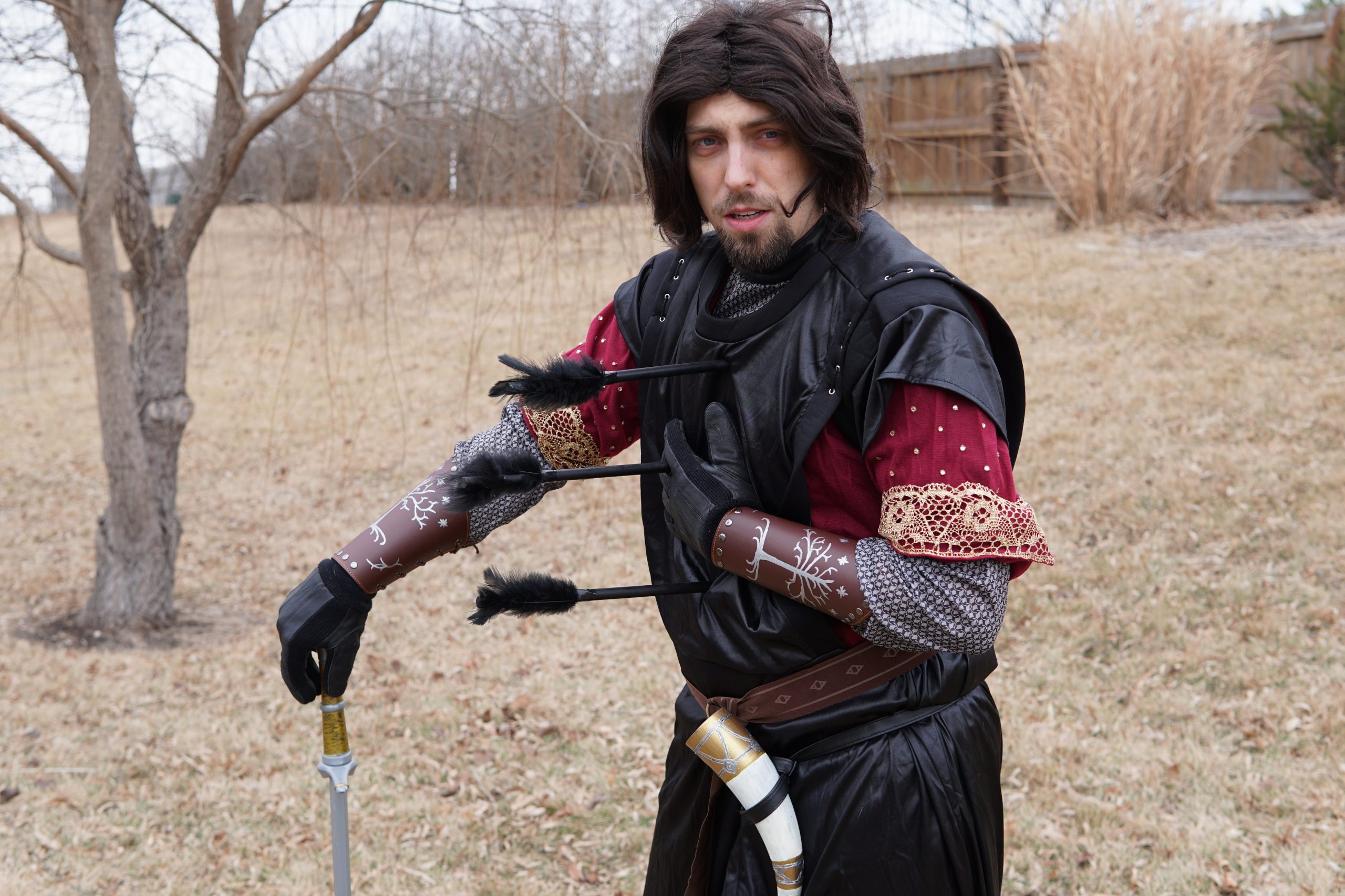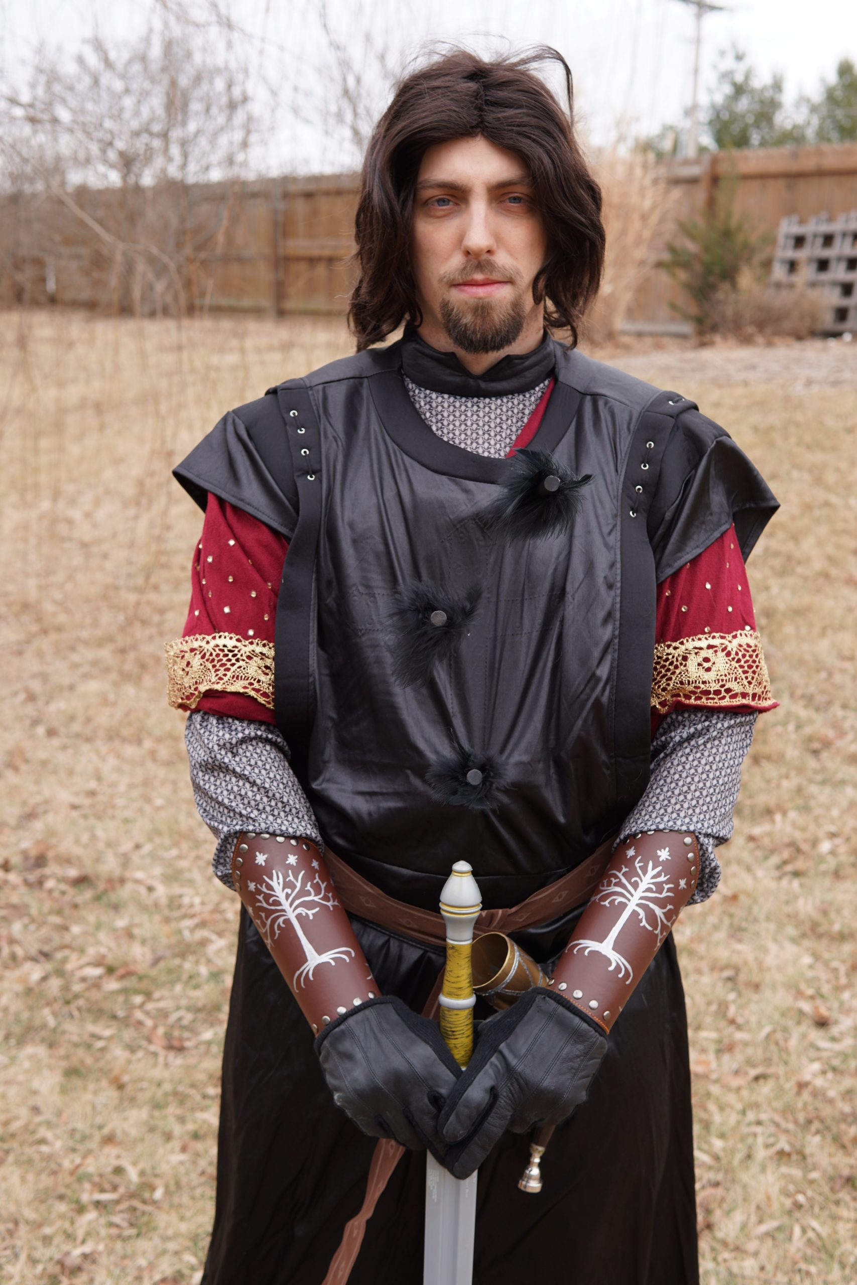 For the costume itself, we bought an Aragorn and medieval costumes, and pieced together parts (maroon shirt, black tunic, chain mail, belt, and boot covers) that looked similar to Boromir. I found some gold ribbon and embellishments to add to the maroon shirt.