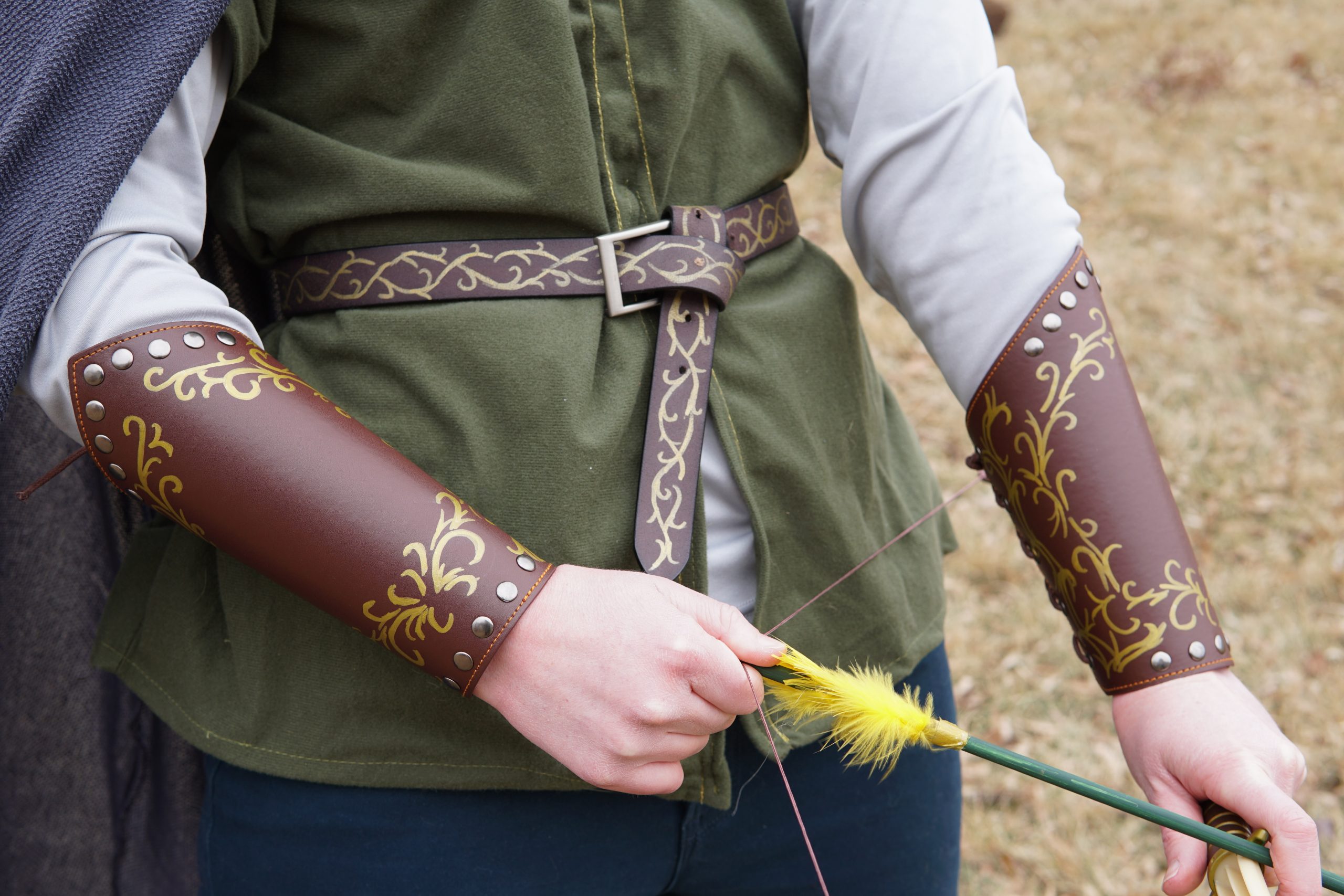 I hand drew the leaf designs with a gold permanent marker on a brown belt (I already had) and some basic brown bracers we bought.
