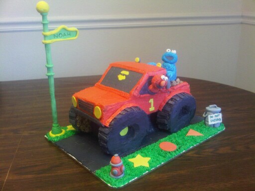 My nephew Wyatt is currently into trucks and Elmo; hence the theme for his second birthday party 🙂 This is the first time I’ve actually taken step-by-step pictures of my cake progression. I’m super excited to have this blog so I can now share my fun cake innovations with you all. My sister and I paired up to make this one, and I’d say we did a decent job for our first attempt at a truck or Sesame Street themed cake 🙂