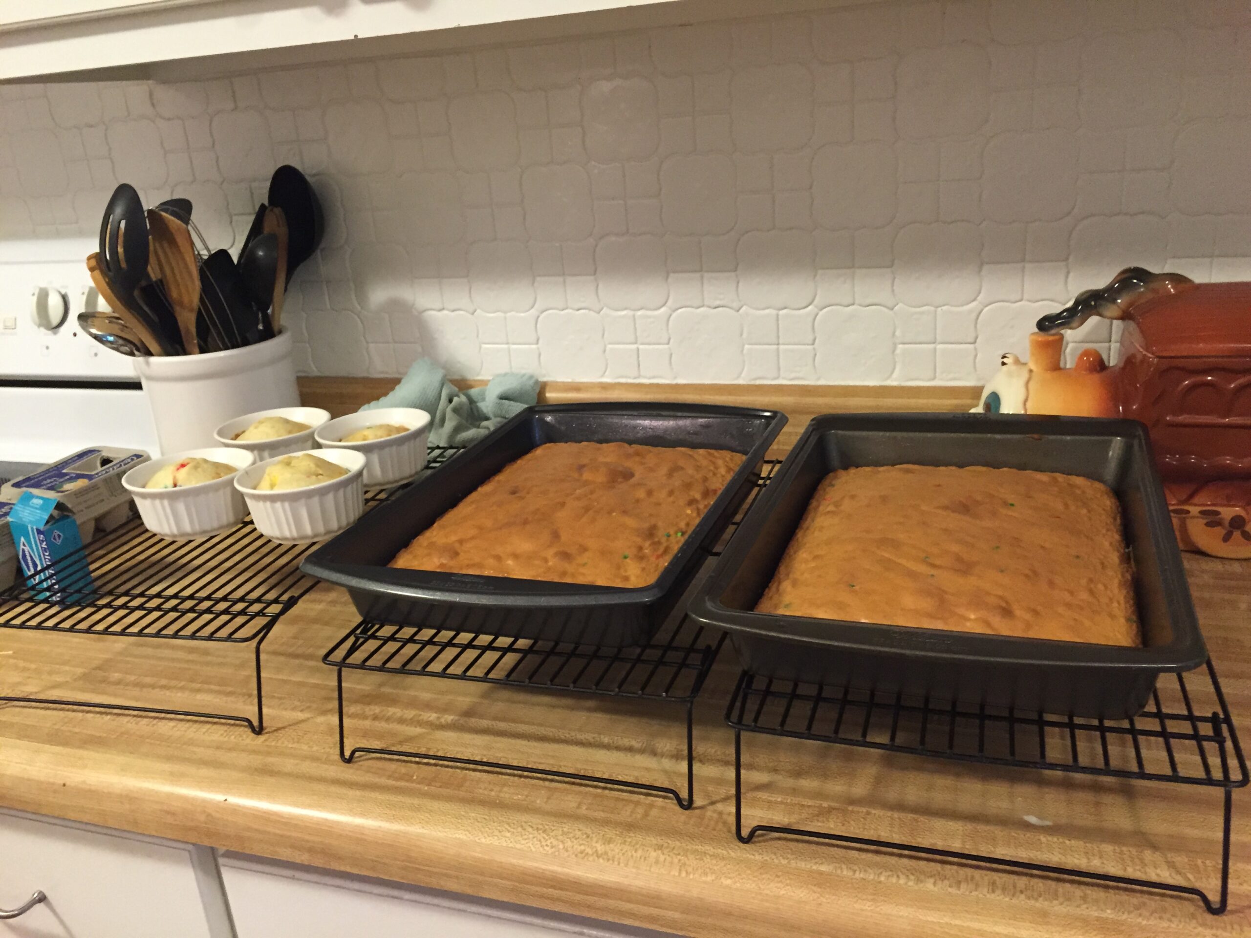 For the cakes, we went with a funfetti cake mix, cause what kid doesn’t love funfetti! Any box or homemade mix would also work. Bake four 9×13″ cakes for the body of the truck (this was probably more than necessary but we wanted to make sure we had enough). Use four 7 oz. ramekins (~3″ diameter) filled half full with batter to make the cake for the wheels. You can use larger ramekins if you want to go for more of a monster truck look. Make sure to line the bottoms of the pans/ramekins with parchment to make for easy removal. Pre-chill the cakes before cutting to make them easier to slice and work with.