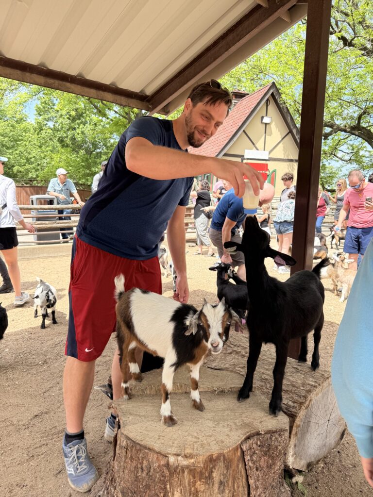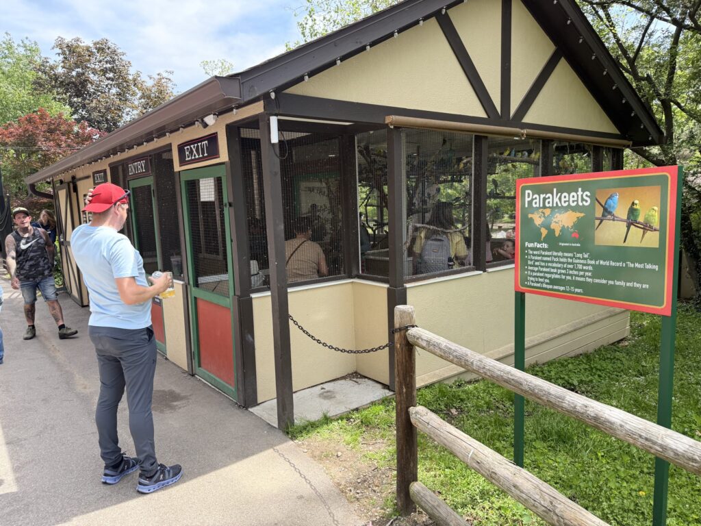 Grant’s Farm is home to a vibrant variety of birds, adding color and charm to your visit. One of the most delightful experiences is feeding the playful parakeets, who happily perch on your seed stick, phone, head or sweaty neck – Scott is quite the chick magnet! Keep an eye out for majestic peacocks strutting freely through the park, flashing their iridescent feathers, and stop by the enclosures to see brilliantly colored macaws. Don’t miss the live bird show, where you’ll get a closer look at some of these fascinating species in action including the macaws solving math problems and showing their strength. Here’s a fun throwback video to the bird show back in 1992.