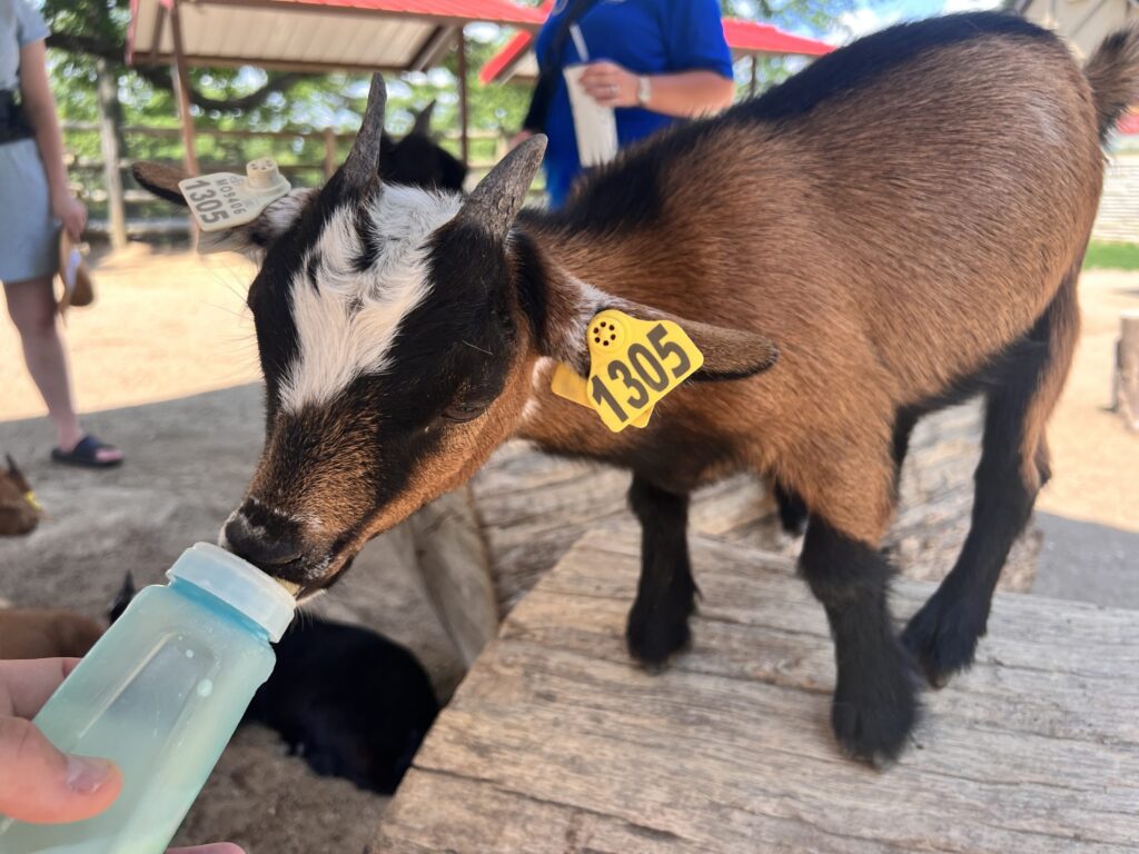 One of the biggest highlights is bottle-feeding adorable baby goats – a must-do activity that’s guaranteed to spark giggles and capture some unforgettable photo ops. If you run out of milk or want a more calm experience, you can also brush the goats for free. Visitors can also hand-feed llamas from an ice cream cone. The llamas can bite and the goats also like to nibble your clothes and even your hair.