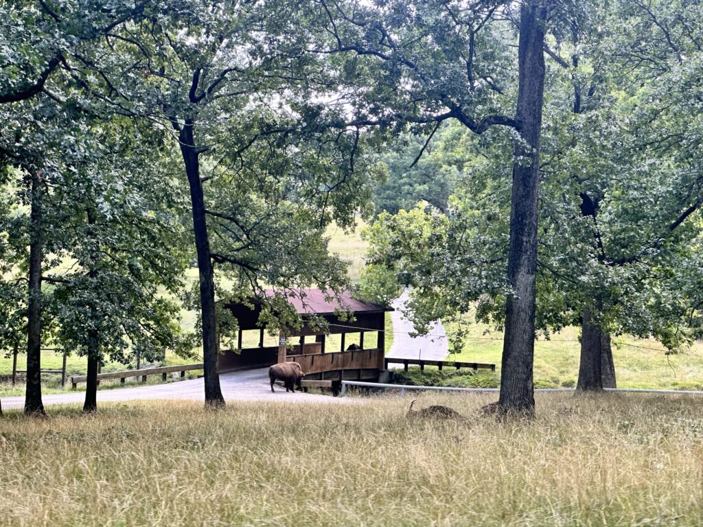 Your Grant’s Farm adventure begins with a scenic trolley ride through the lush Deer Park, a wildlife preserve filled with an incredible variety of animals. As you wind past grassy fields and shaded groves, you’ll spot free-roaming creatures such as Scottish Highland cows, elk, llamas, Canada geese, zedonks, water buffalo, red deer, ostriches, and blackbuck antelope – a peaceful and awe-inspiring way to kick off your visit. The journey starts at Mirror Lake and it’s beautiful fountains, and then passes the iconic iron gates made from Civil War rifle barrels. One of the highlights along the route is “Hardscrabble,” the historic log cabin hand-built by Ulysses S. Grant in 1856, offering a rare look into the early life of the future president. Near Hardscrabble, you’ll also spot Civil War–era cannons, a Gatling gun, and a 38-star American flag, representing the era in which Grant lived. Look closely and you may catch a glimpse of the Busch family estate, tucked among the trees in the distance. Don’t forget to watch for the bear and peacock carvings, cleverly shaped from fallen or damaged trees along the path. The narrated ride adds to the experience with fun facts and stories about the Busch family, the estate, and the land’s rich legacy.