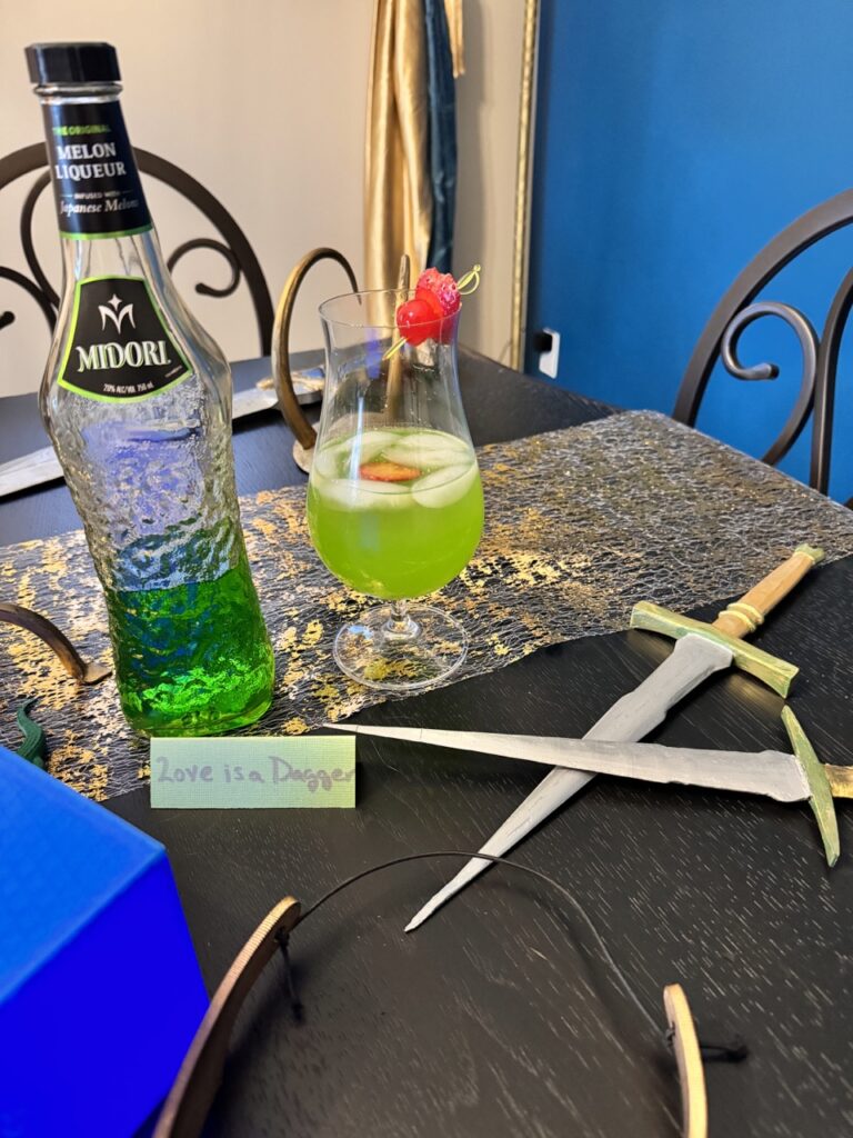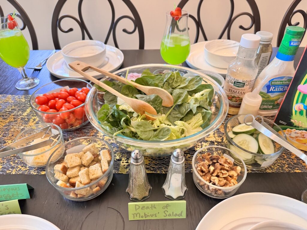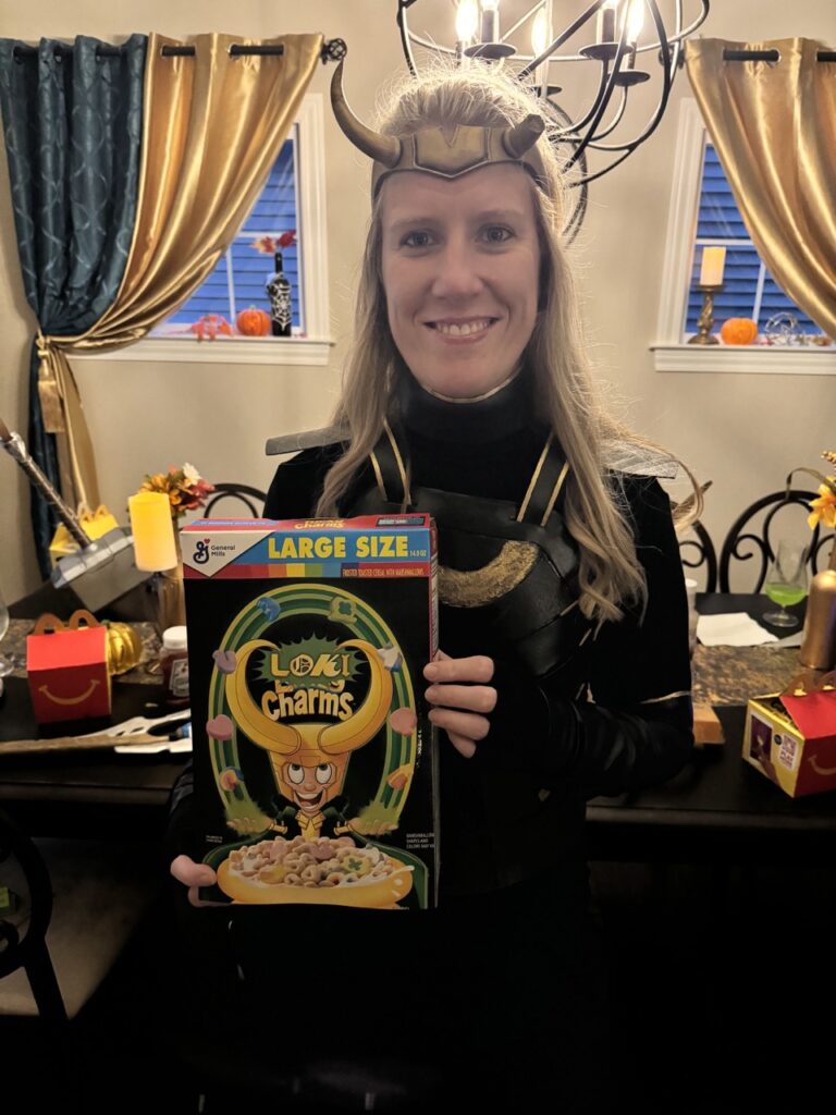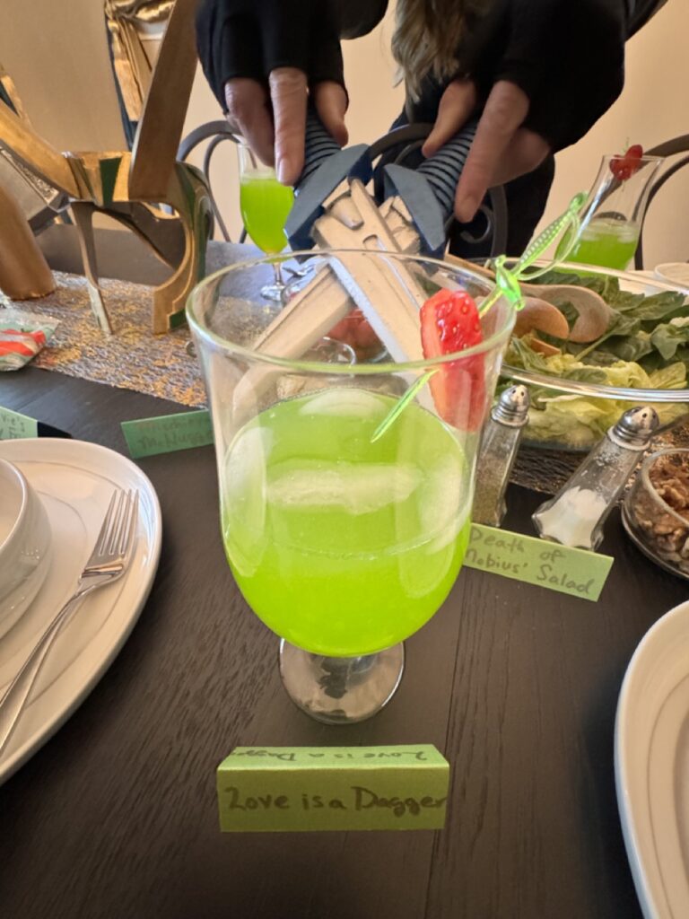 Our Loki Season 2 premiere party was filled with much mischief, and we tried everything! The menu included the death of Mobius’ salad, Love is a Dagger cocktail, Shapeshifter’s Skillingsbolle topped with Loki Charms, and Happy Meals with Mischievous McNuggets, Sylvie’s salty fries, and Time Variance Apples (TVA).