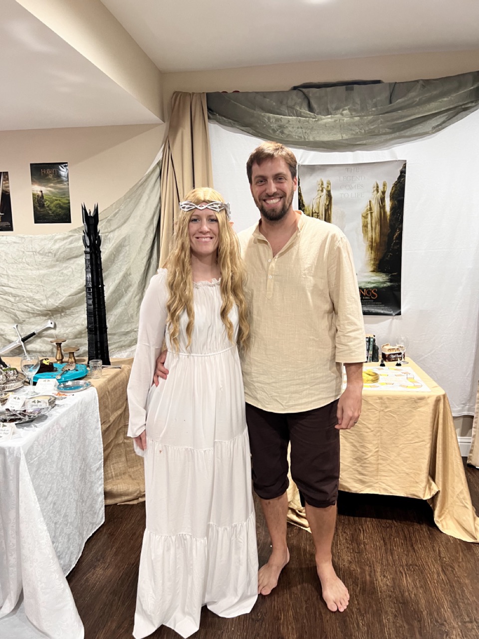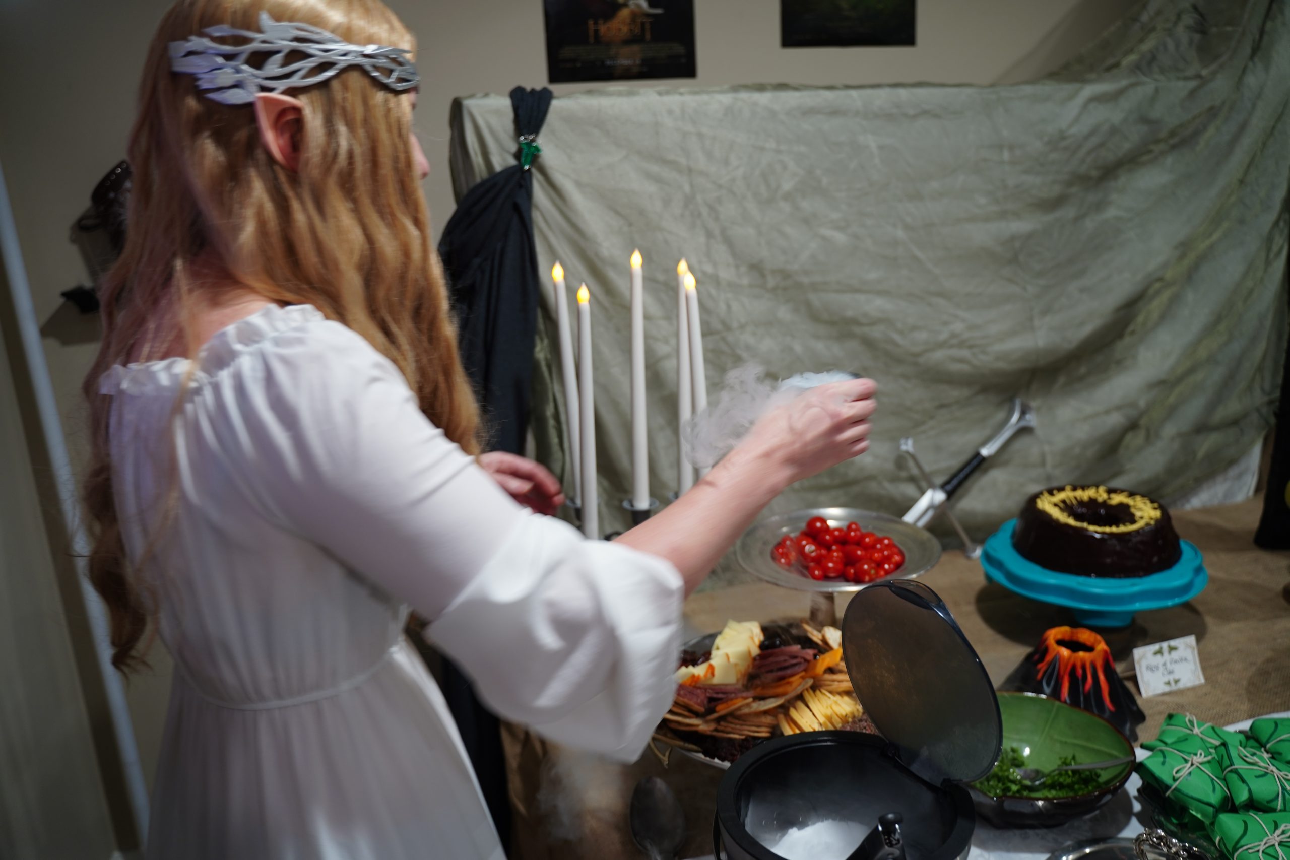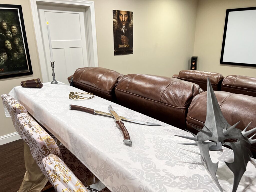 We fully stepped into Middle-earth by dressing as some of its most iconic figures. I channeled my inner Galadriel, complete with flowing white robes and an ethereal glow. My sister embodied Arwen, bringing Elven elegance with cascading dark curls and star-kissed details. Our resident Hobbit came barefoot and snack-ready, cloak and all. The Witch King of Angmar stole the show—his helmet getting passed around for guests to don – definitely not someone you’d want to meet on the path to Mordor.