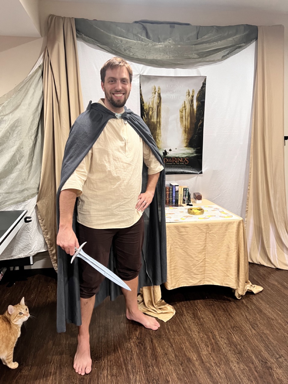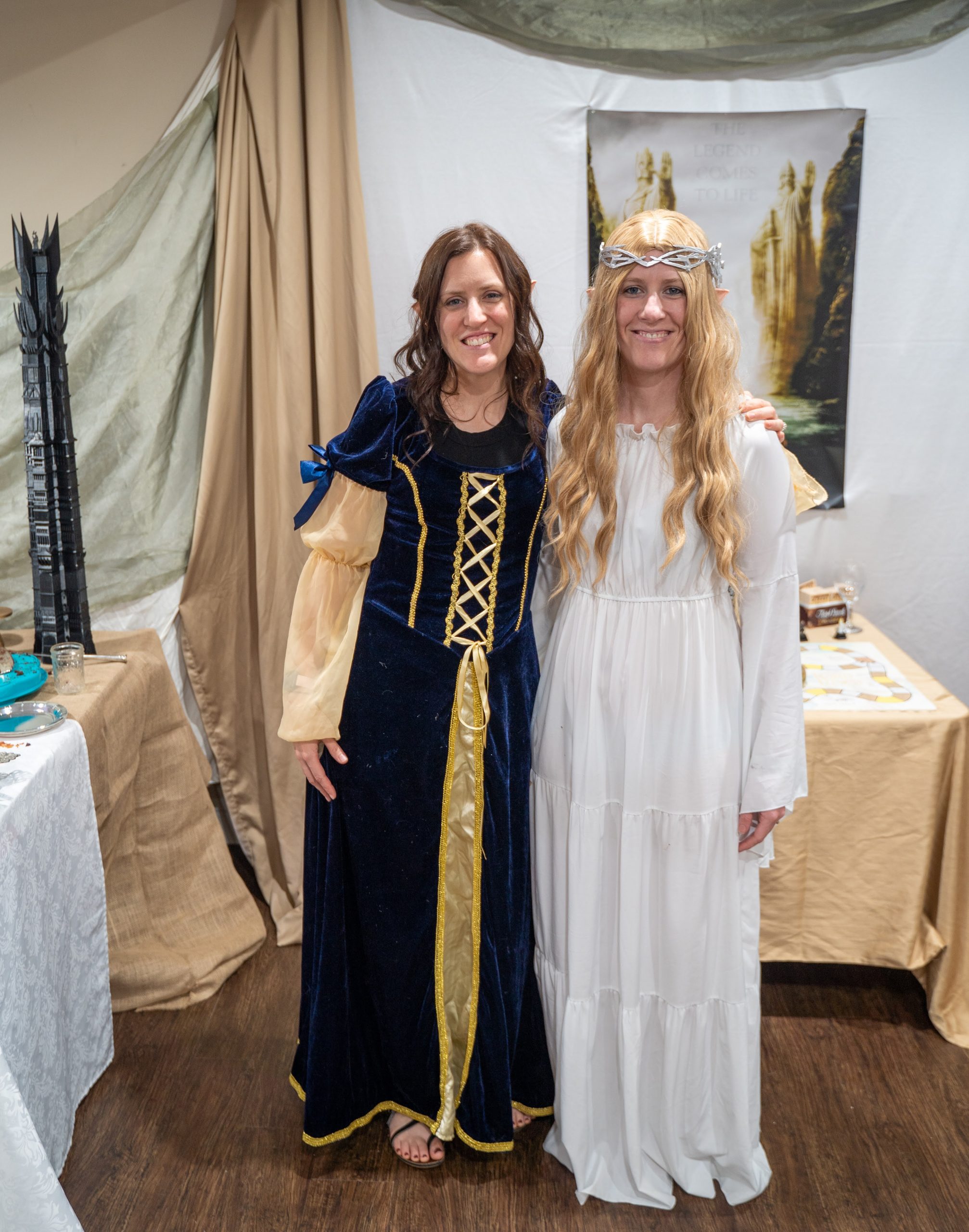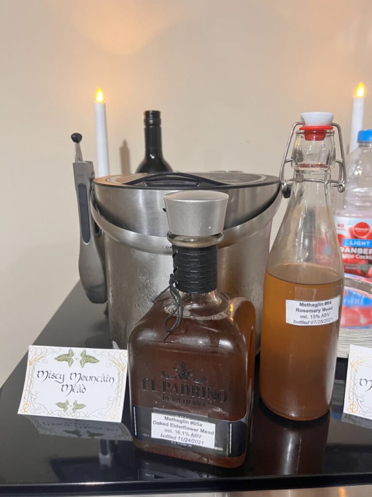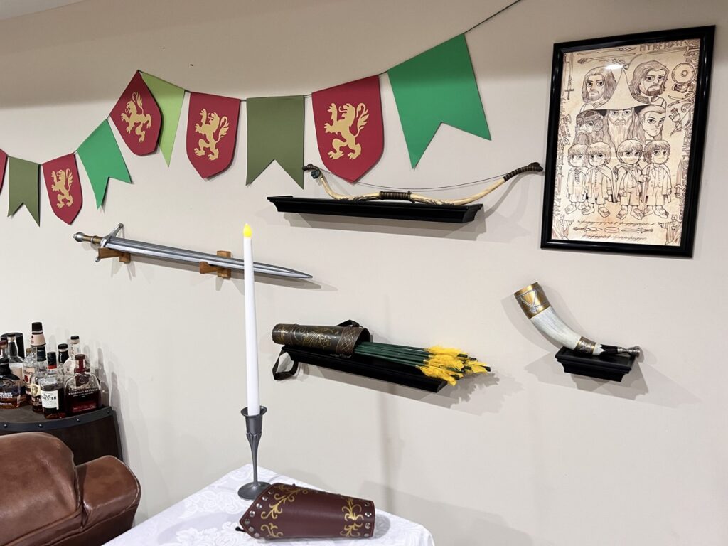 We fully stepped into Middle-earth by dressing as some of its most iconic figures. I channeled my inner Galadriel, complete with flowing white robes and an ethereal glow. My sister embodied Arwen, bringing Elven elegance with cascading dark curls and star-kissed details. Our resident Hobbit came barefoot and snack-ready, cloak and all. The Witch King of Angmar stole the show—his helmet getting passed around for guests to don – definitely not someone you’d want to meet on the path to Mordor.