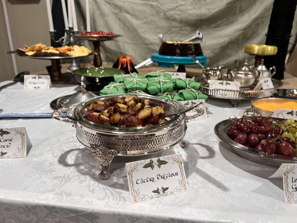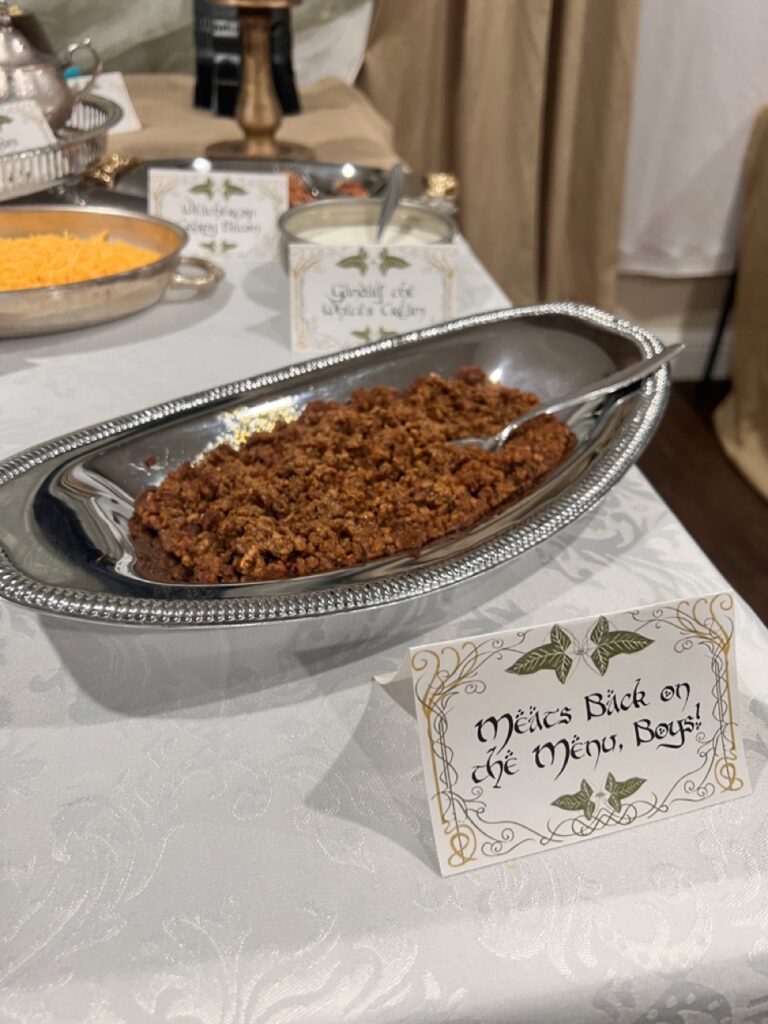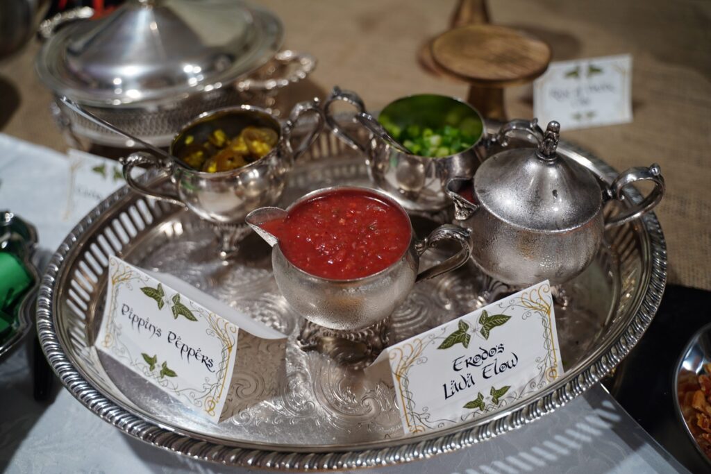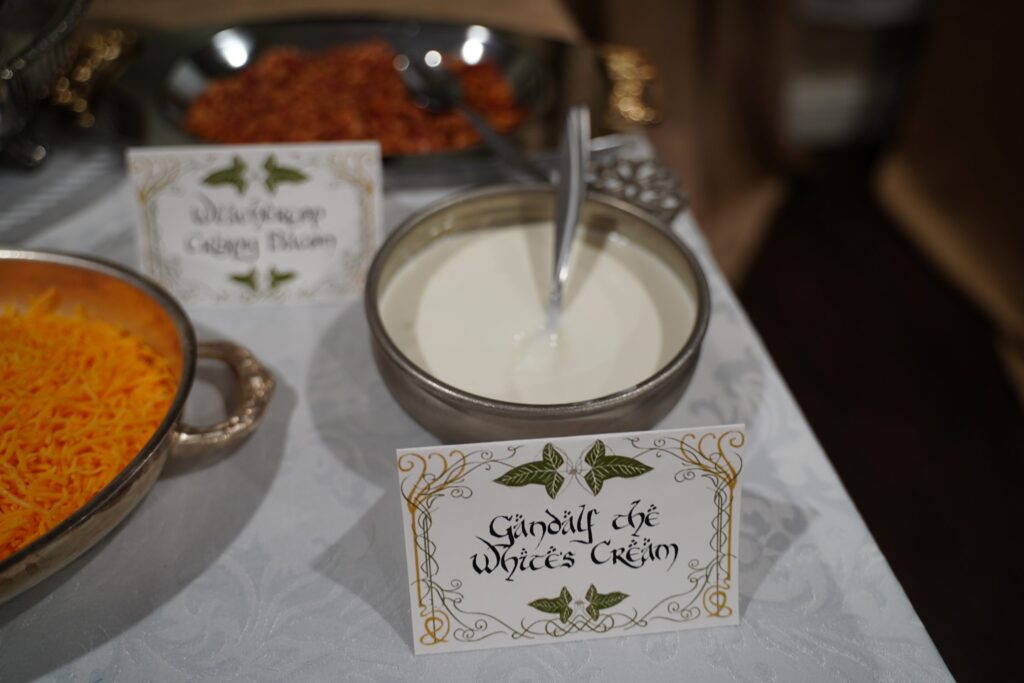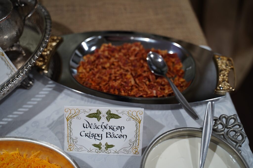 The food included lembas bread, Ring of Power cake, Mtn Dewm cocktails, Misty Mountain mead, “They Come in Pints?” beer, and loaded potatoes consisting of “Taters Precious,” “Meat’s Back on the Menu, Boys,” “Weathertop Crispy Bacon,” and “Pippin’s Peppers.”