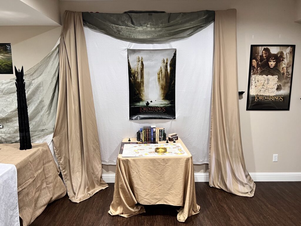 Our Lord of the Rings: The Rings of Power watch party. 3D printed decor included 20 Rings of Power, a Mt Doom smoldering with dry ice, a full-sized light up Gandalf staff, the tower of Orthanc, the Witch King of Angmar’s helmet, and the swords Narcil and Sting. The food included lembas bread, @AnneKostecki Ring of Power cake, Mtn Dewm cocktails, Misty Mountain mead, “They Come in Pints?” beer, and loaded potatoes consisting of “Taters Precious,” “Meat’s Back on the Menu, Boys,” “Weathertop Crispy Bacon,” and “Pippin’s Peppers,” to name a few. We played a ring toss game (throw the One Ring into Mt Doom) that @stltrails won and some trivia, including a LOTR board game that I made in high school! #LOTR #LOTRonPrime #LOTRcosplay #LordOfTheRings #RingsOfPower #AmazonPrime #WatchParty #TheRingsOfPower #TheLordOfTheRings #Tolkien #TheRingsofPower